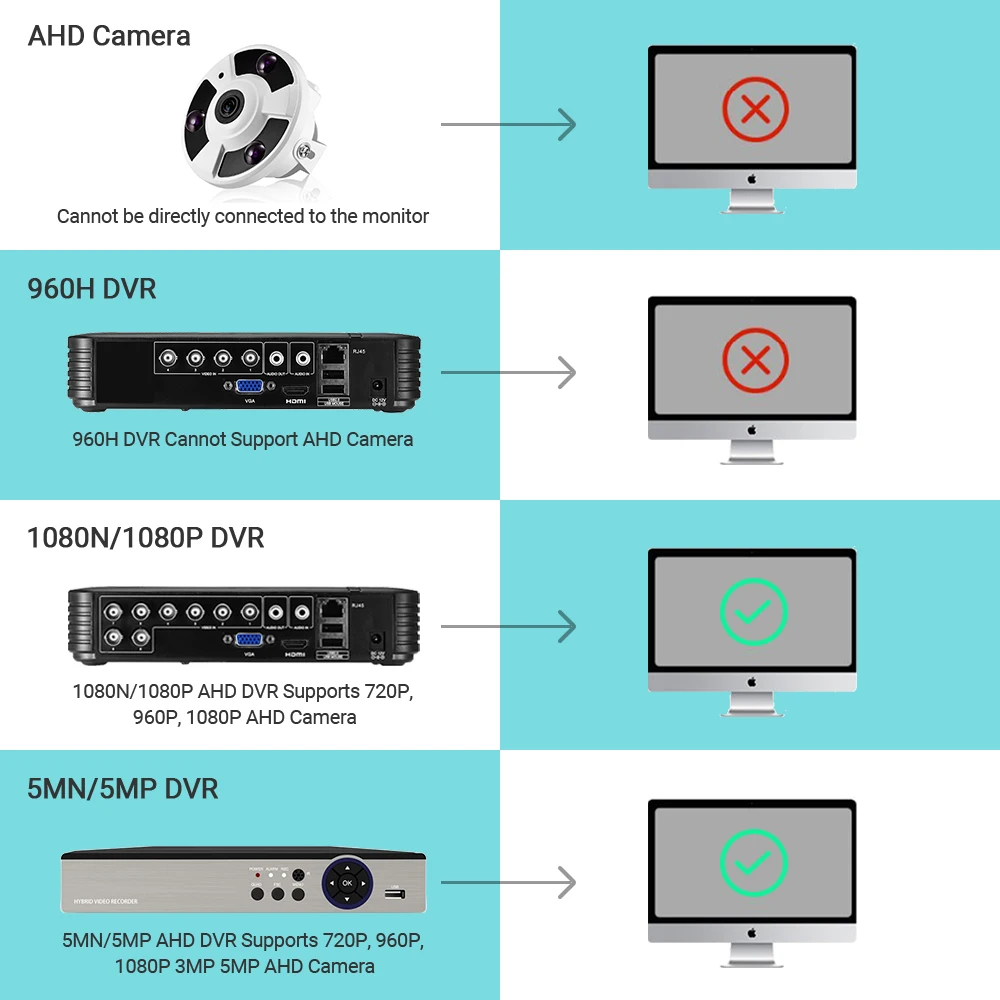 1:This camera is AHD camera, need to connect with AHD DVR,720P and 1080P need to connect with at least 1080N AHD DVR, 5MP need to connect with at least 5M-N.