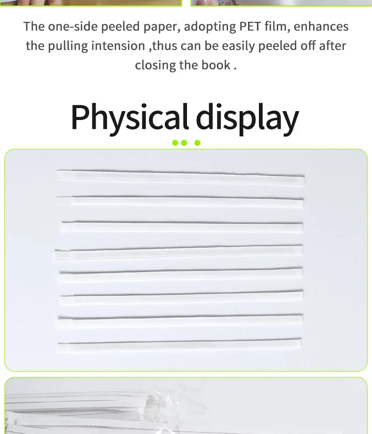 2、The one-side peeled paper, adopting PET film, enhances the pulling intension ,thus can be easily peeled off after closing the book .