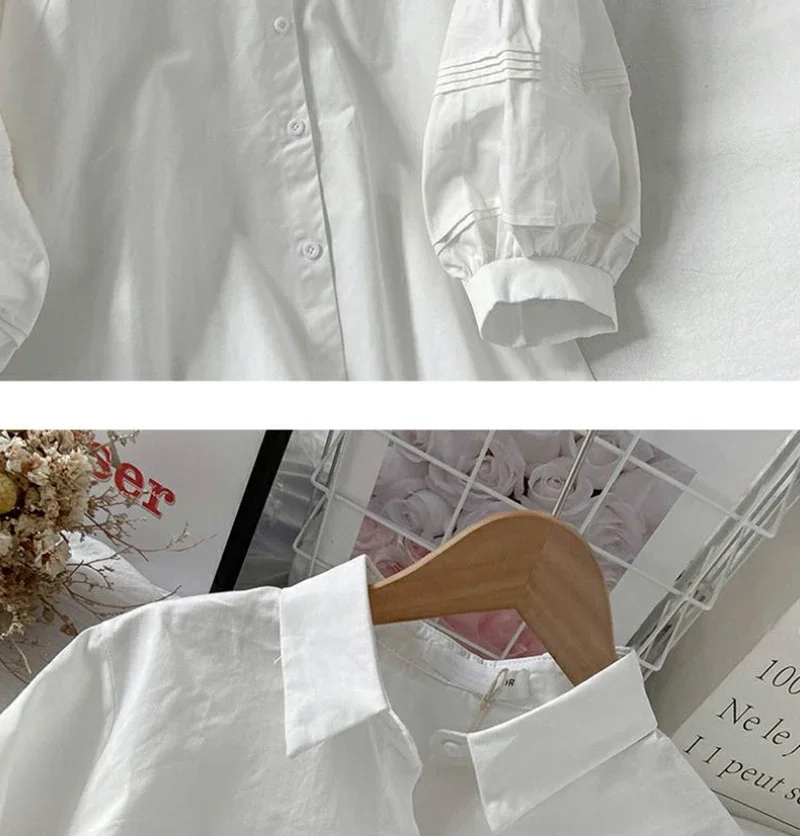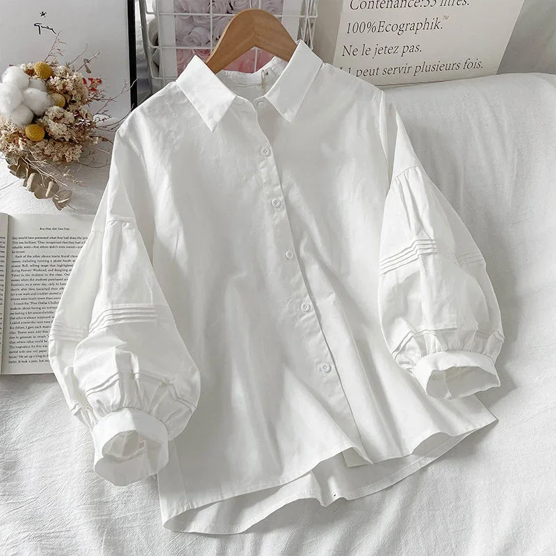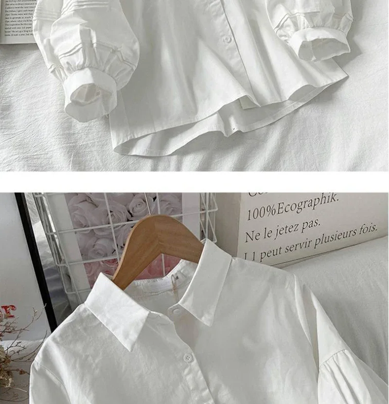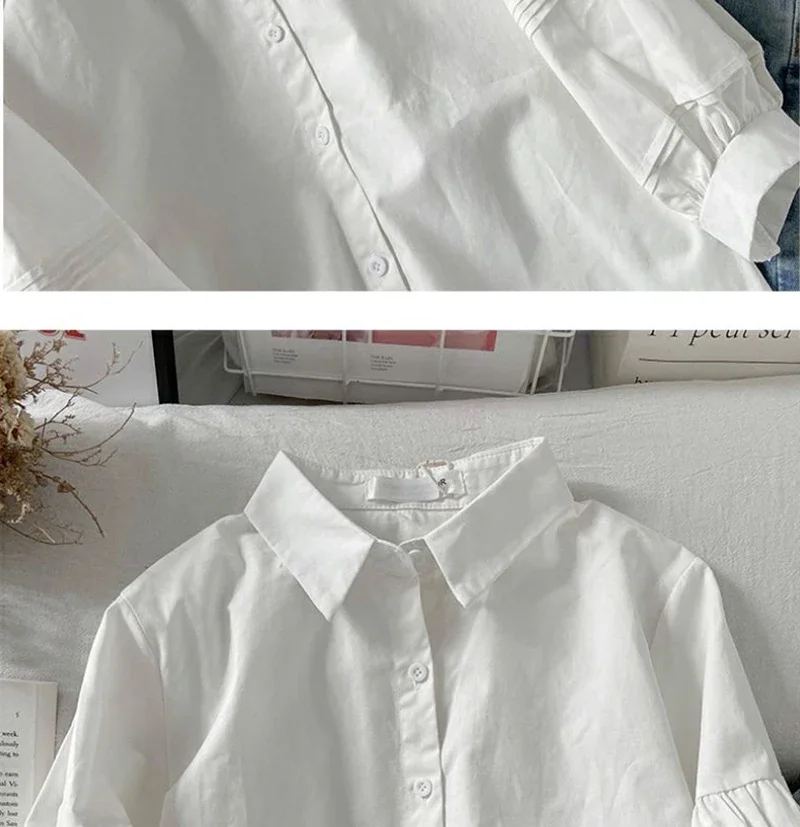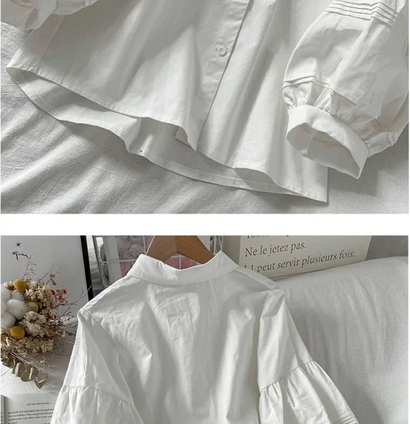 2024 Puff Sleeve Shirts Women White Turn Down Collar Preppy Sense of Design Chic Female Tops Korean Fashion Simple Summer Blouse