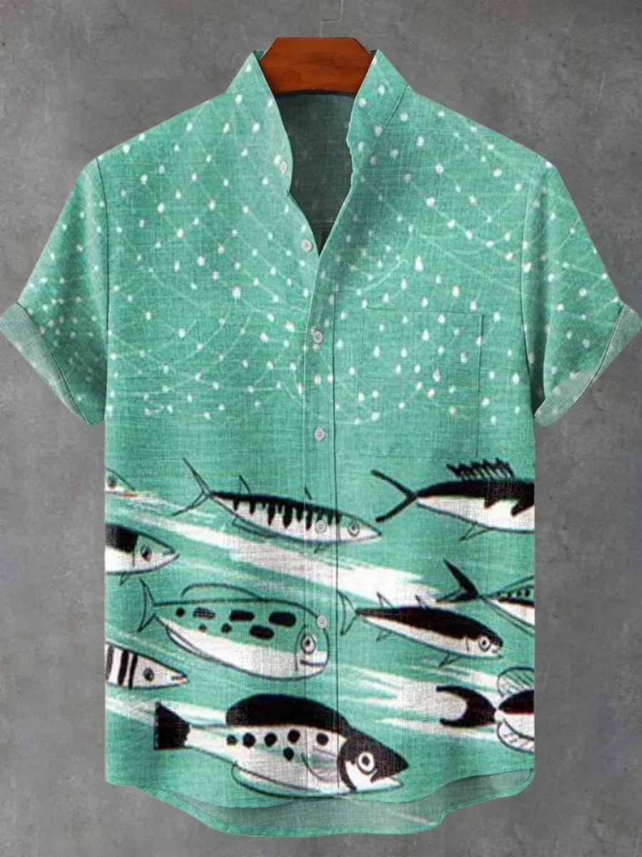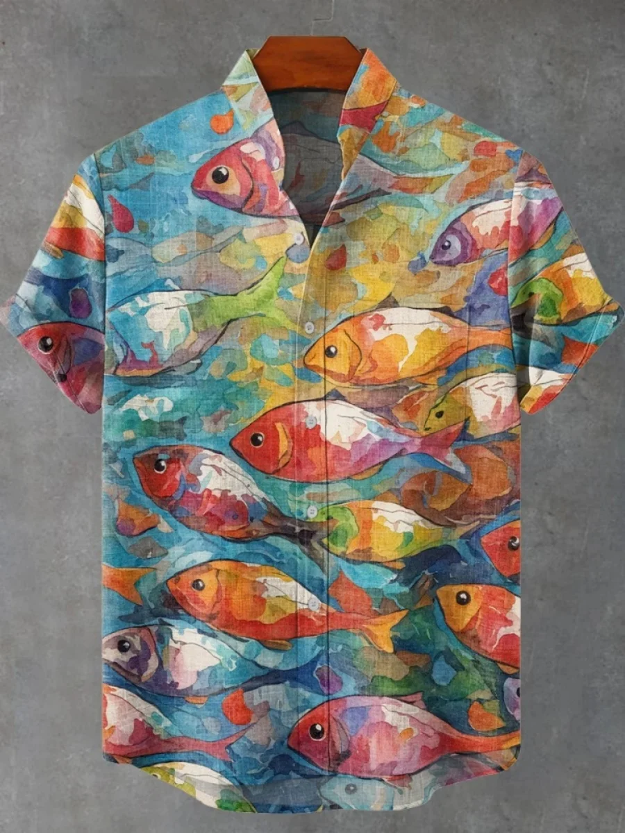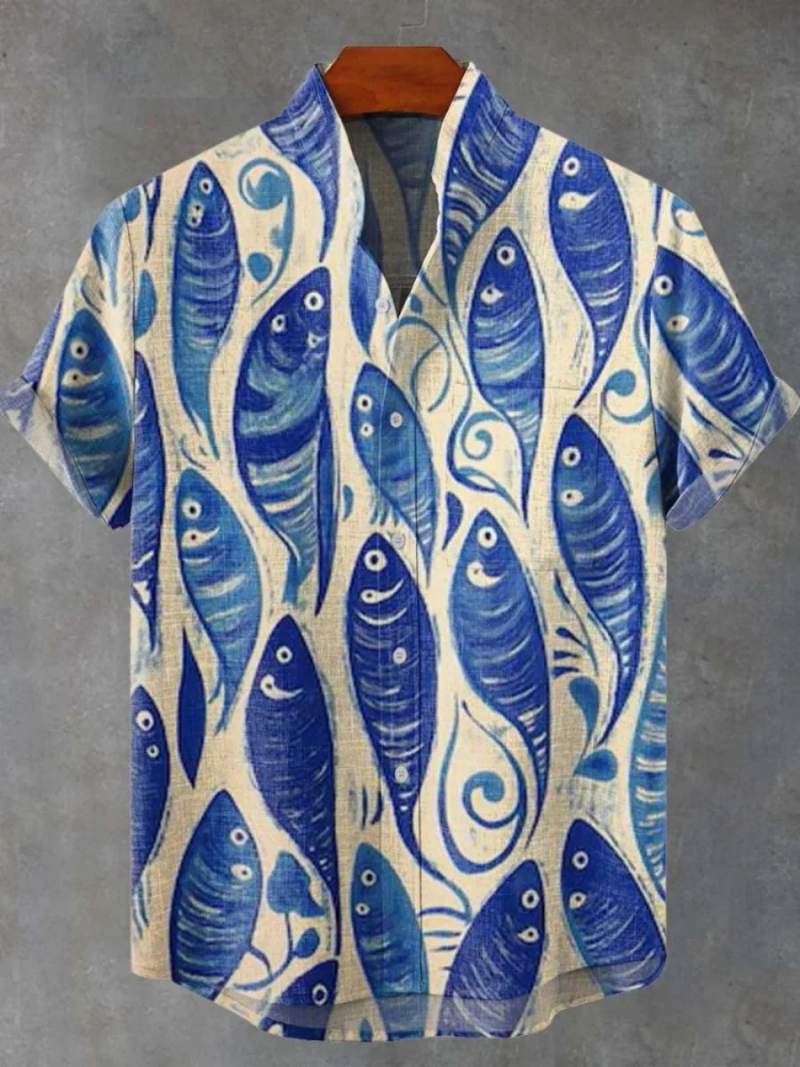 2025 New Printed Retro Style Men’s Fish Print Casual New Linen Comfort Fabric, Button-down Short-sleeved Shirt Printed T-shirt