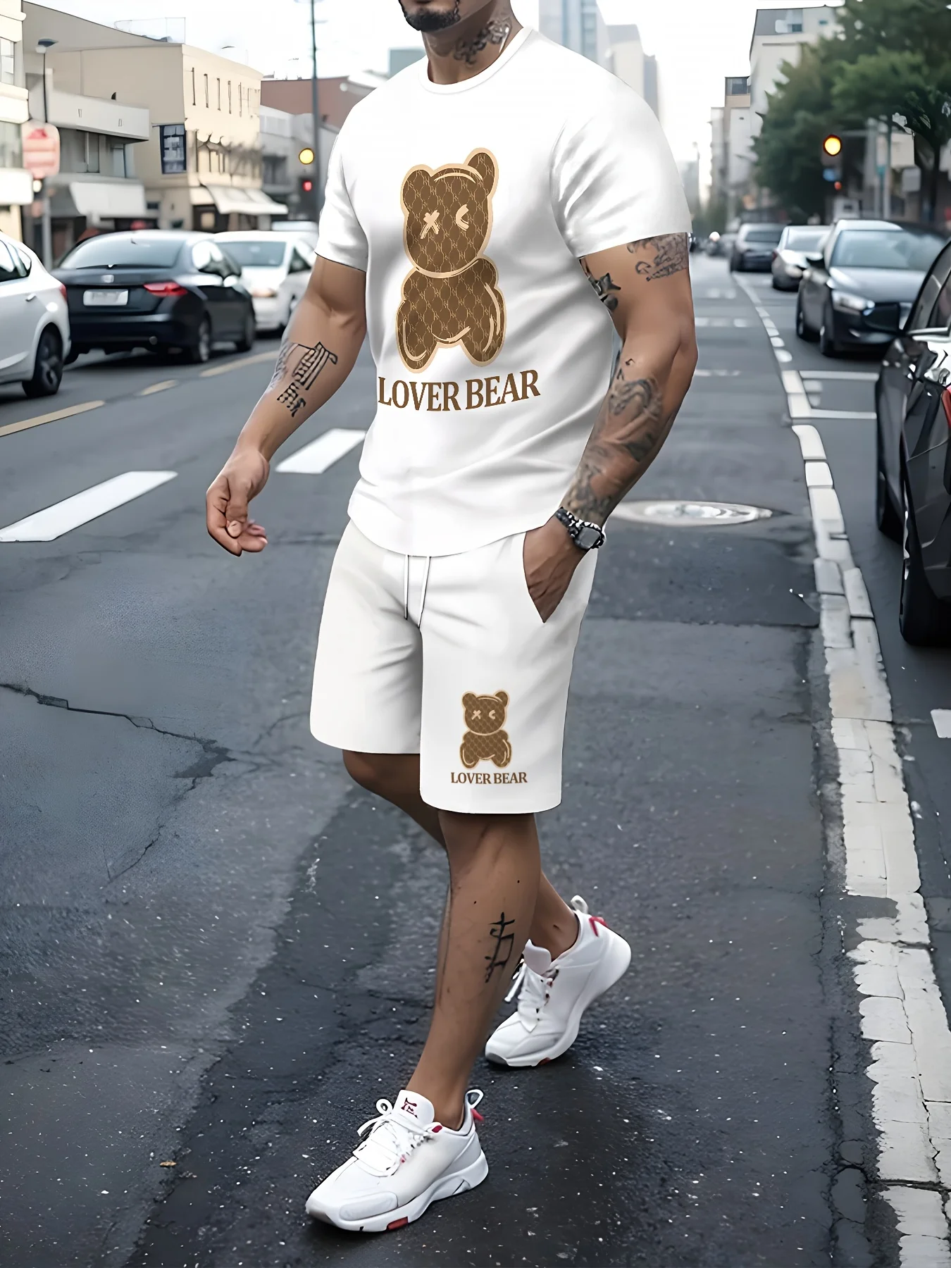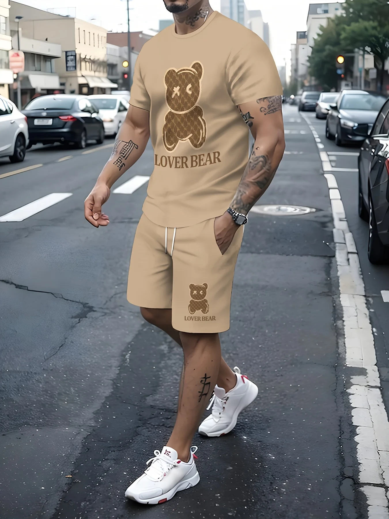 2025 Summer Men’s Fashion Bear Printed Soft and Breathable Round Neck T-shirt Shorts Set Outdoor Casual Two Piece Set