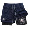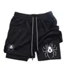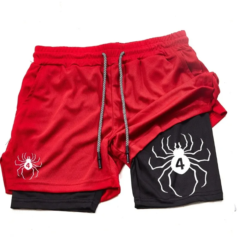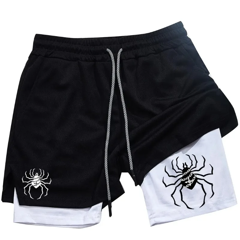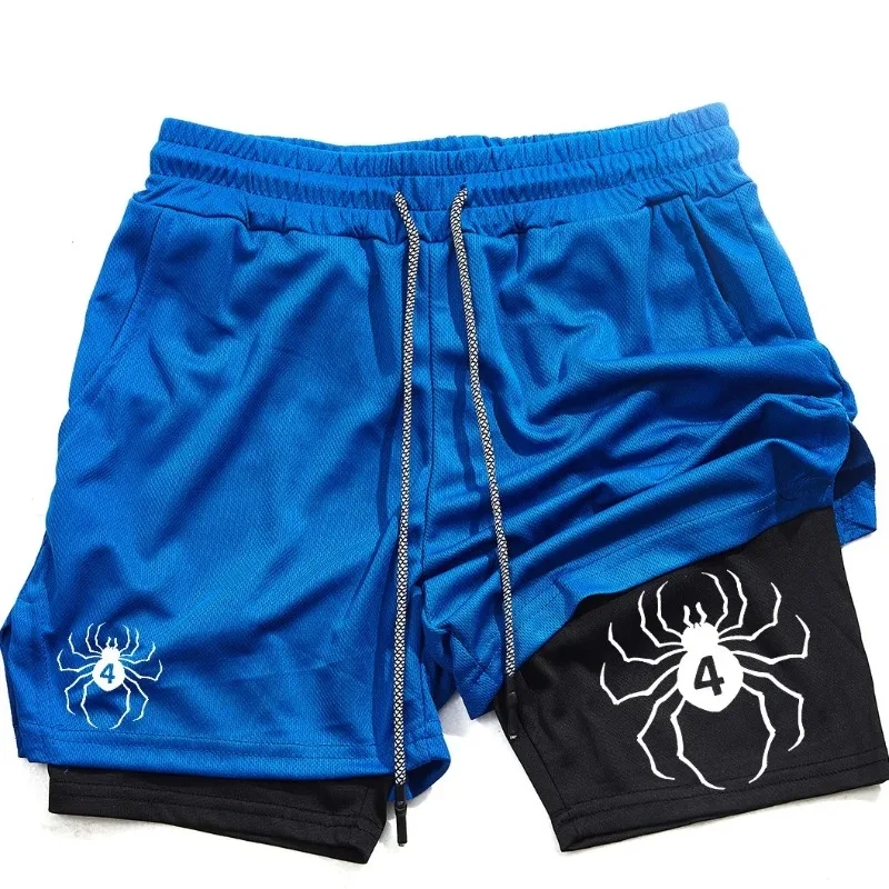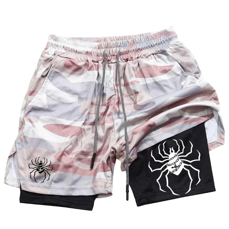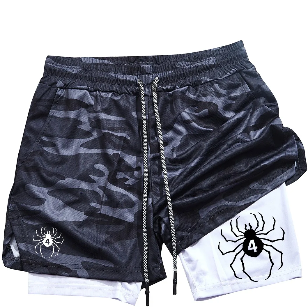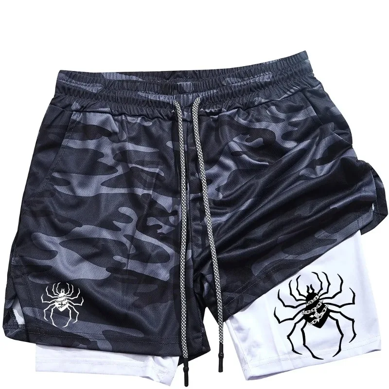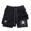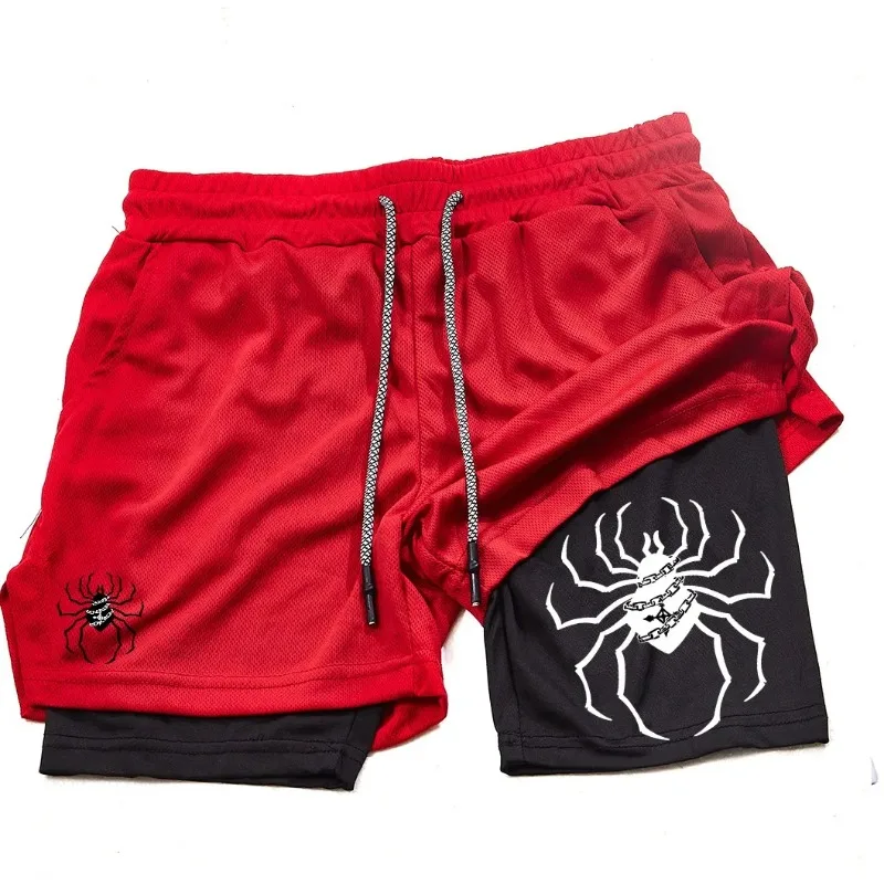 2026 new men’s sports shorts with quick drying, breathable spider print, fitness running shorts, fake two-piece square shorts
