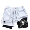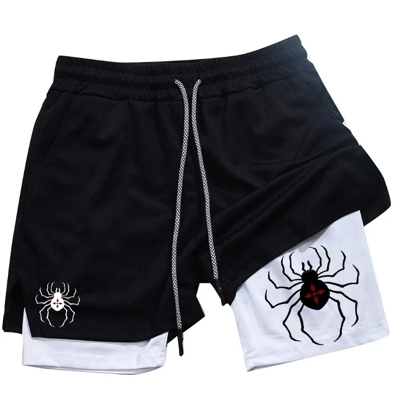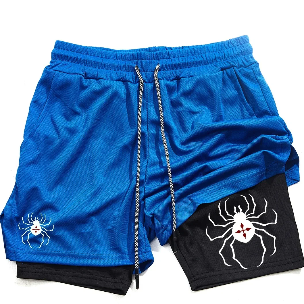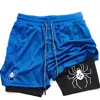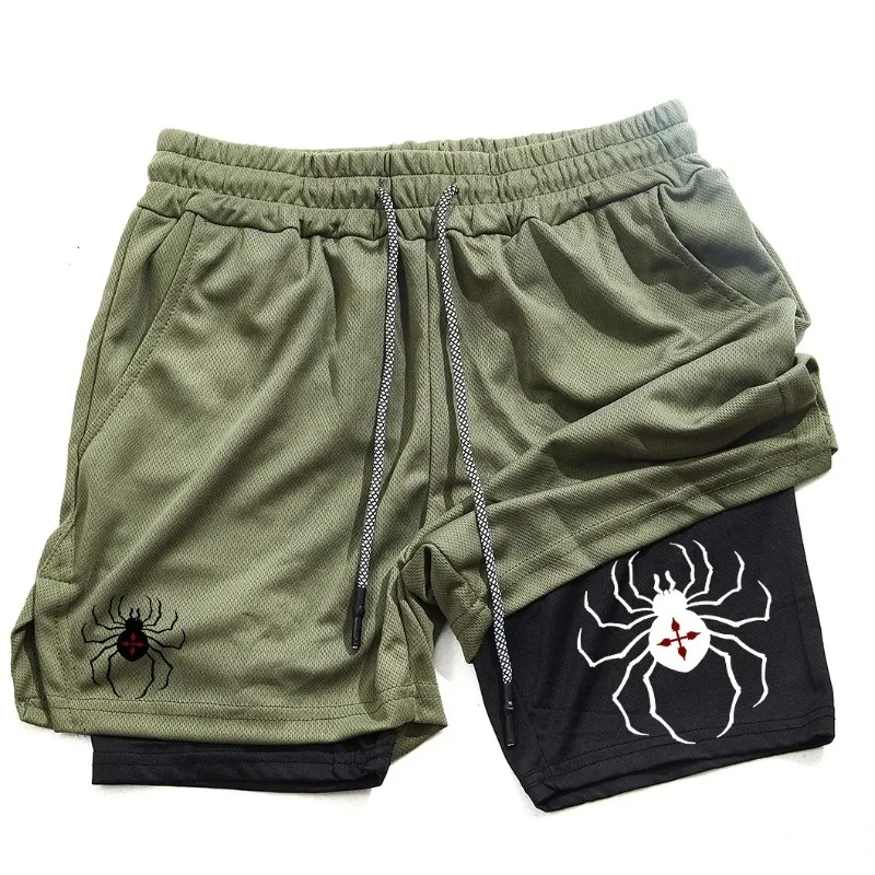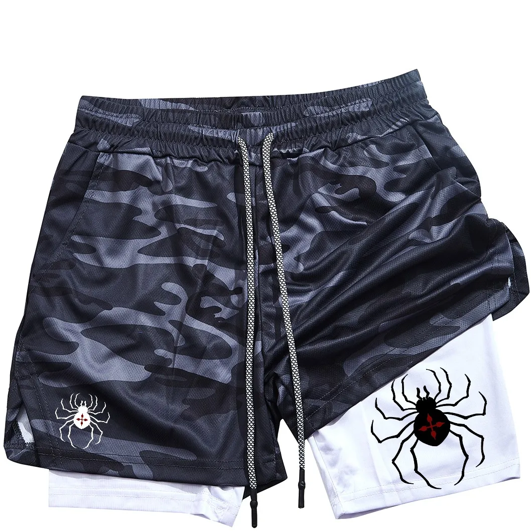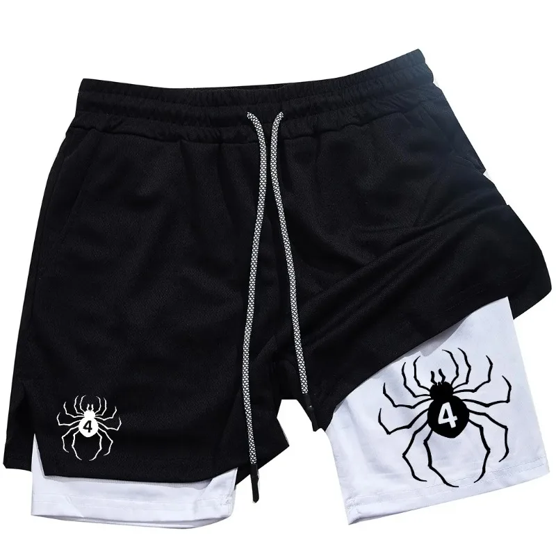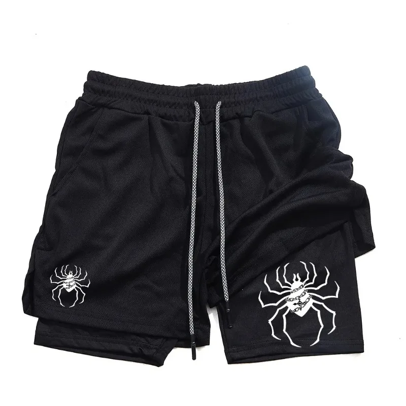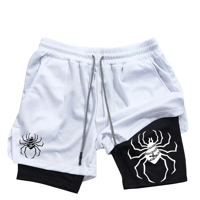 2026 new men’s sports shorts with quick drying, breathable spider print, fitness running shorts, fake two-piece square shorts