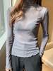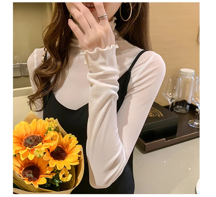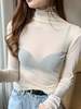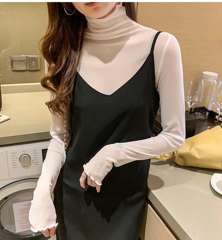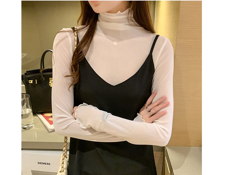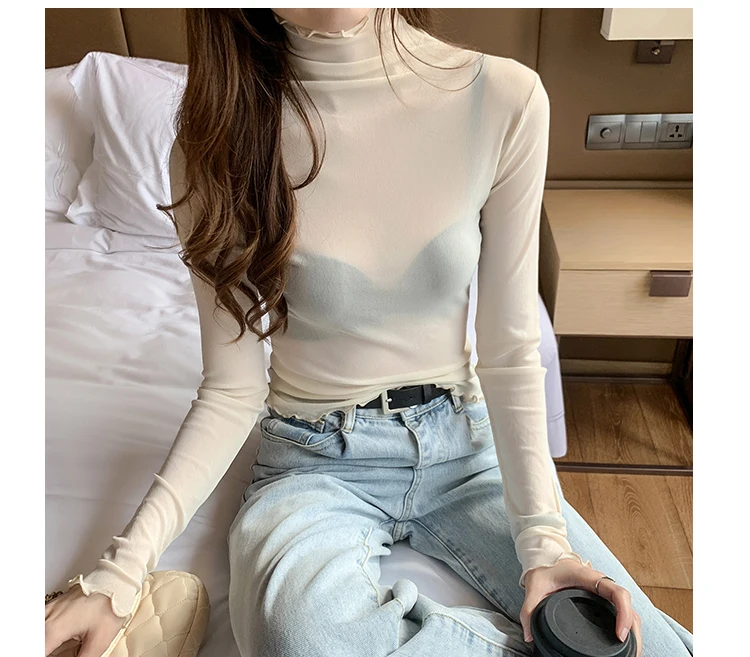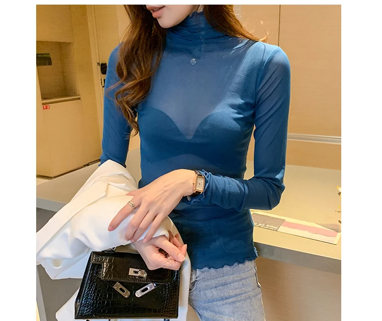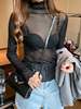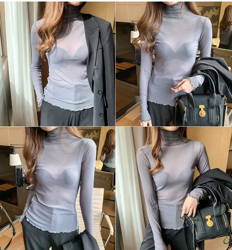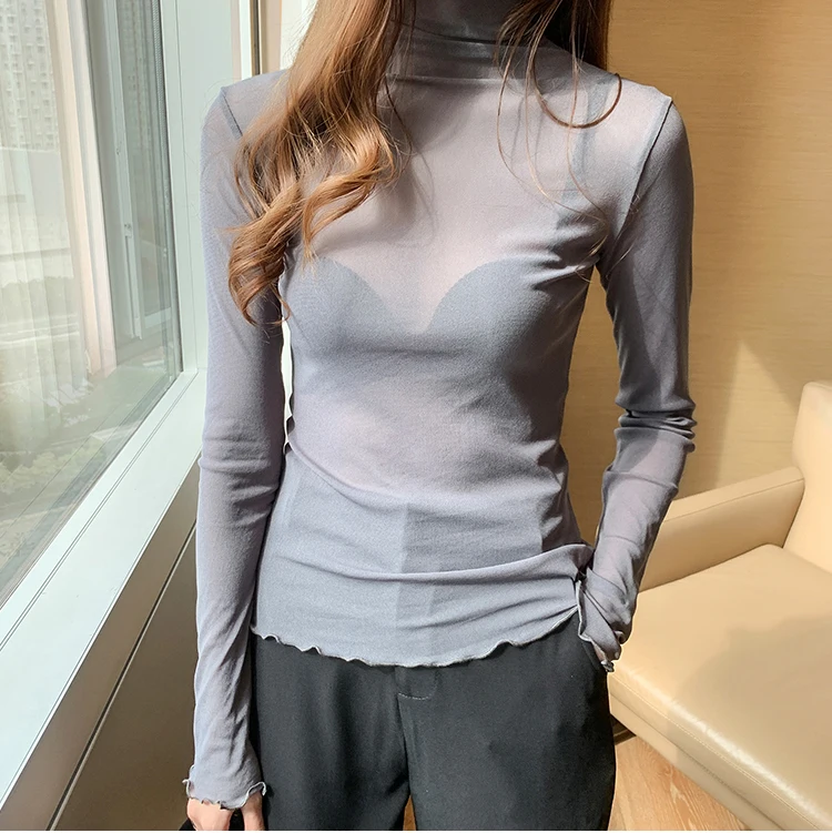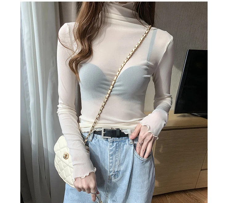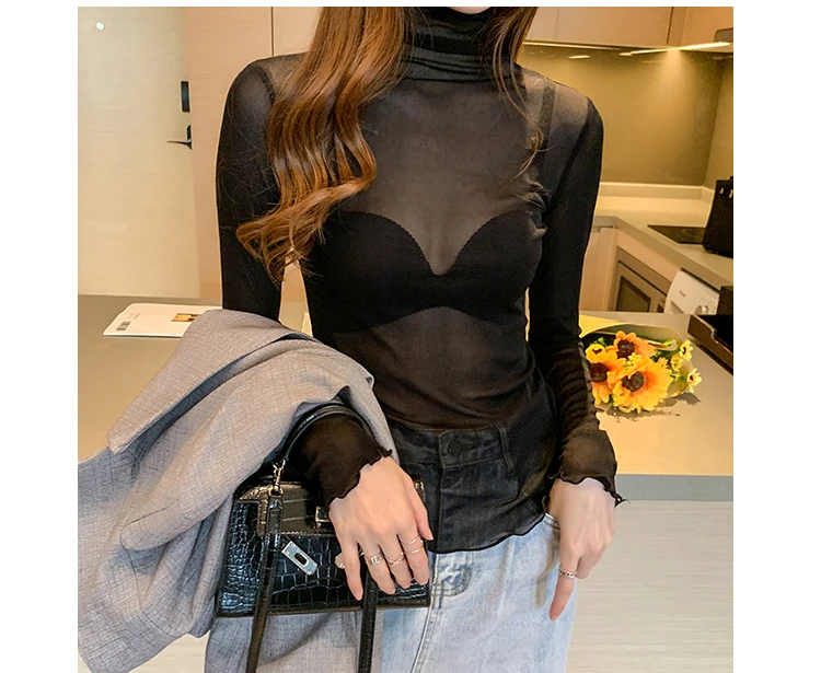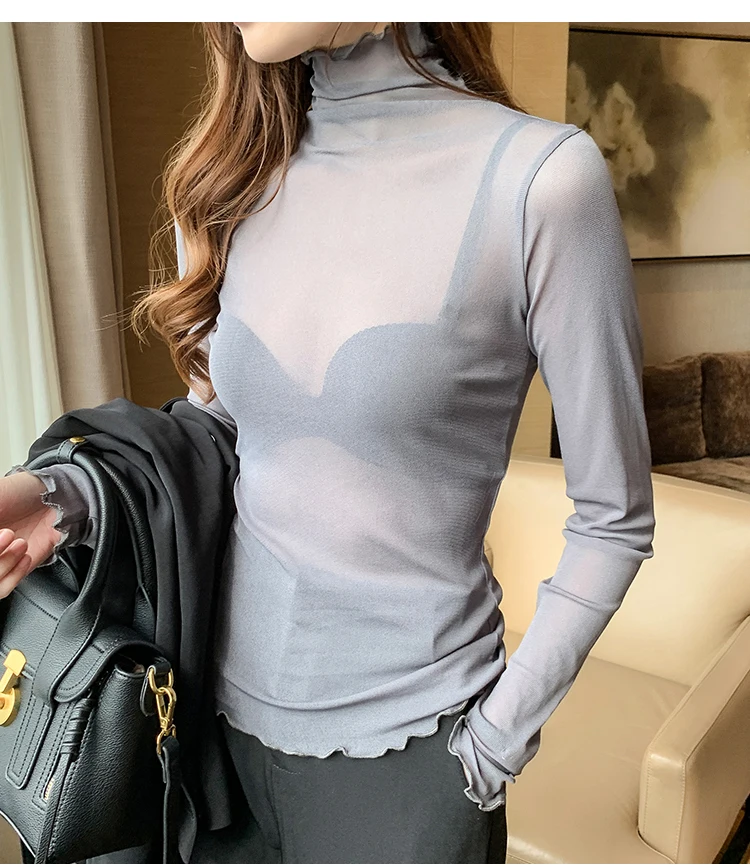 2026 Spring Summer Women’s Sexy See Through Mesh Blouse Long Sleeve Transparent Turtleneck Shirt Fashion Women Tops