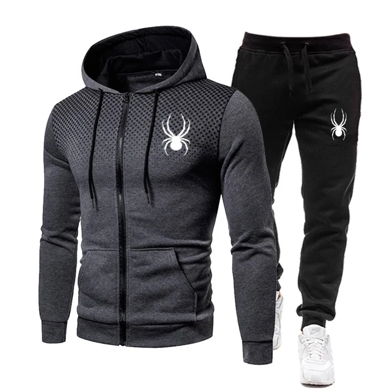 2026 Spring Winter spider print zipper long-sleeved hoodie + stretch waist pants two-piece men’s sports jogging fitness suit