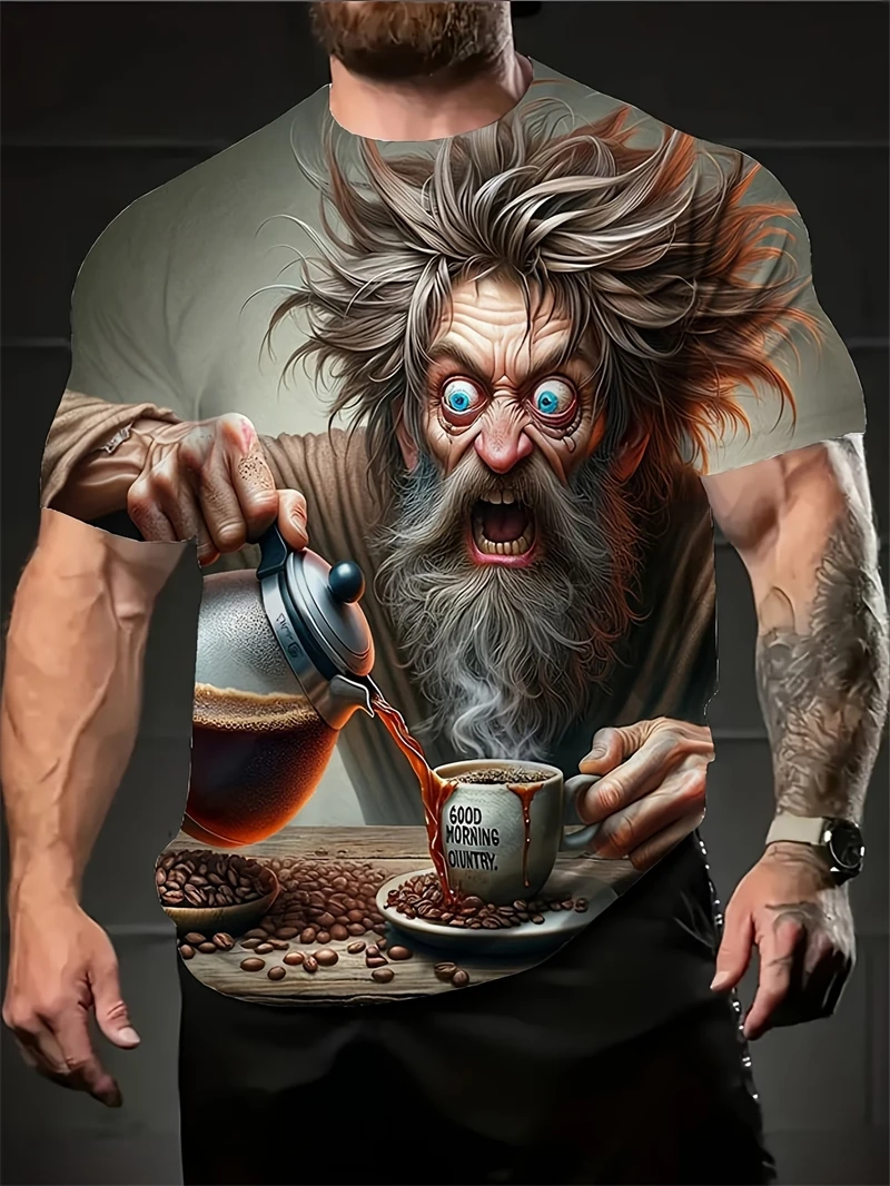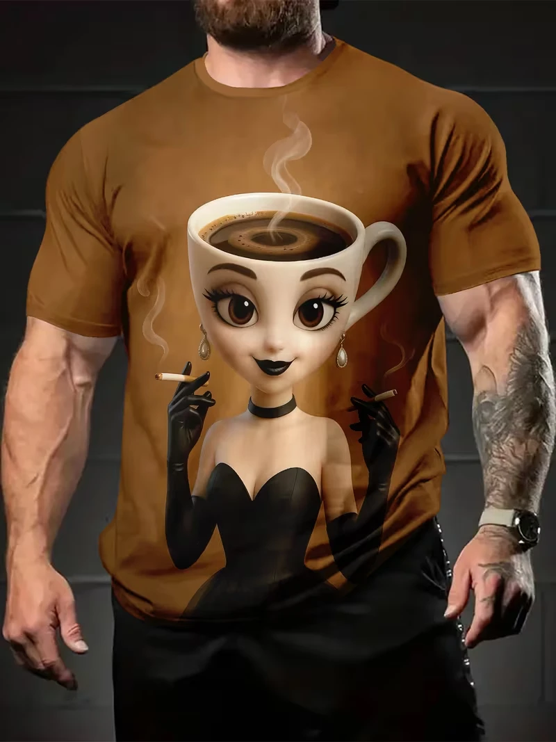 3D Printed Exhausted Character Graphic T Shirt For Men Coffee Pattern T-Shirts Summer Fashion Round Neck Loose Short Sleeve Tees