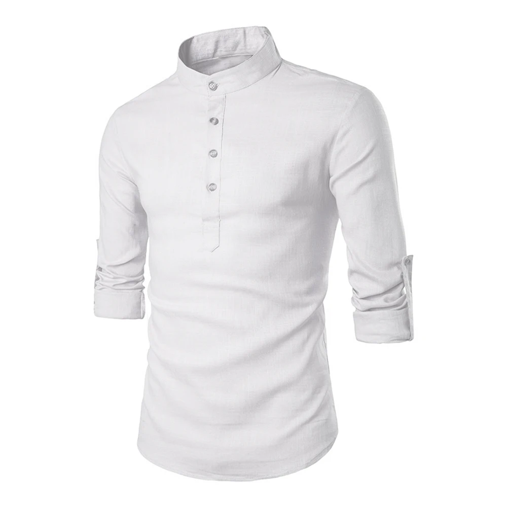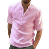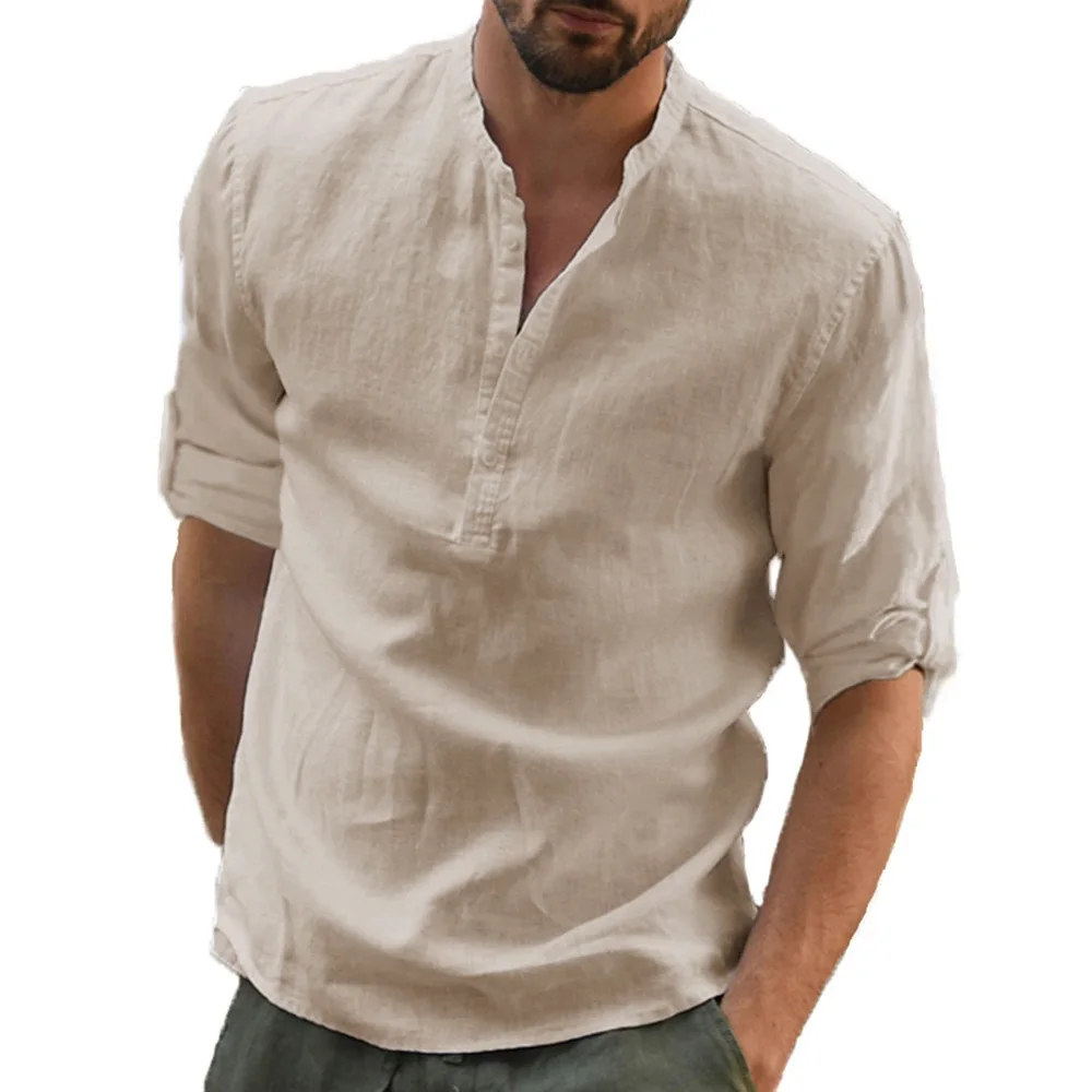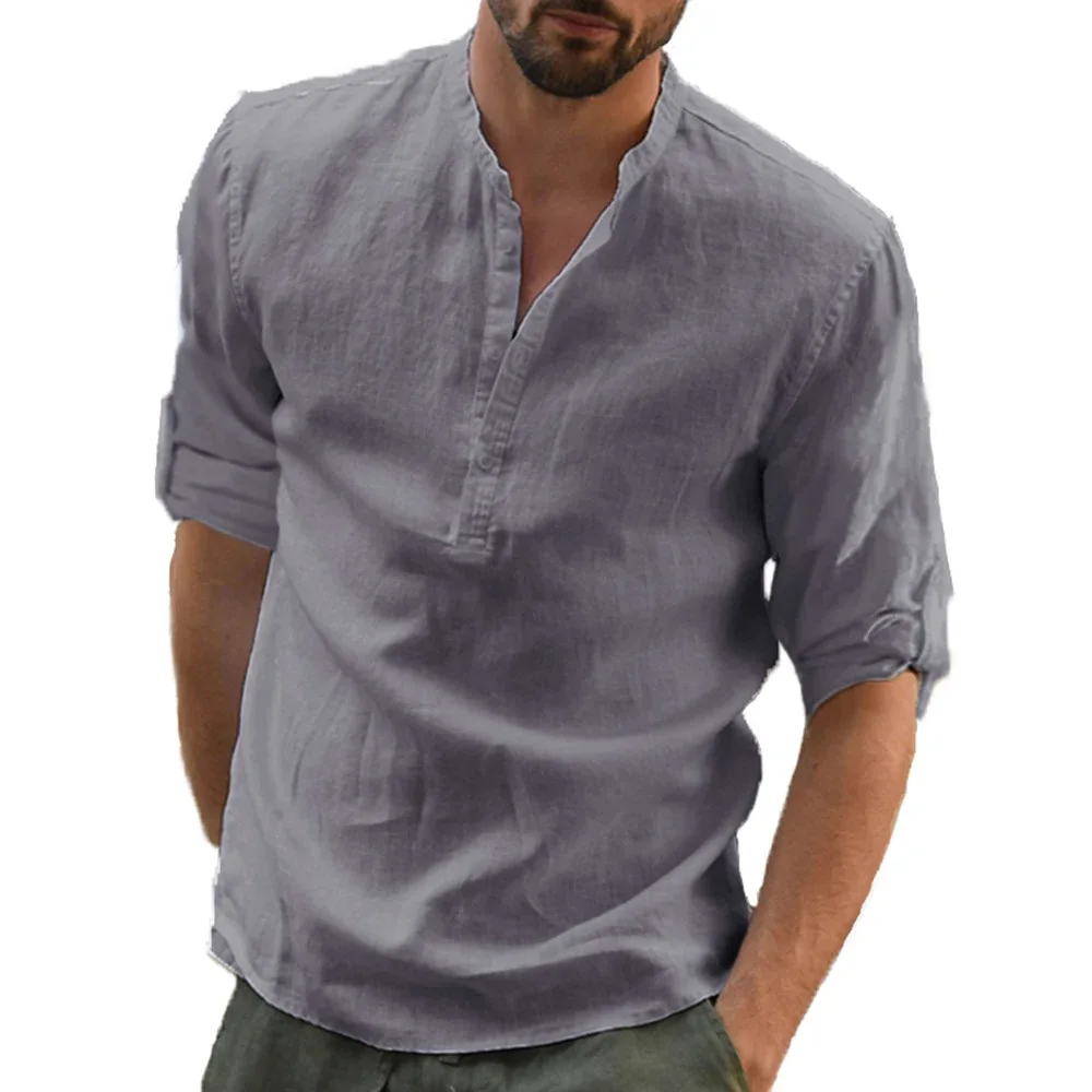 Autumn New Men’s Cotton Linen Shirt Loose Fit Casual Long Sleeve Tees Stylish Breathable Solid Color Henley Neck Tops
