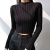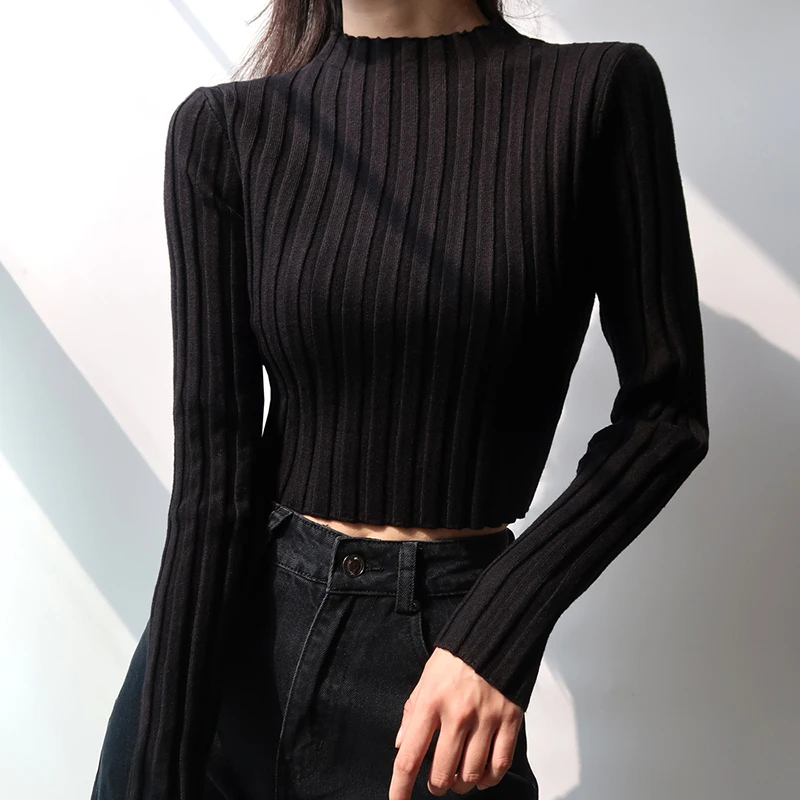 Autumn Winter American Retro Stand Collar Solid Color Simple Slim Fit Fashion Short Knitted Long Sleeve Sweater