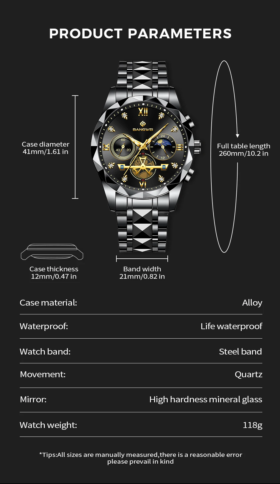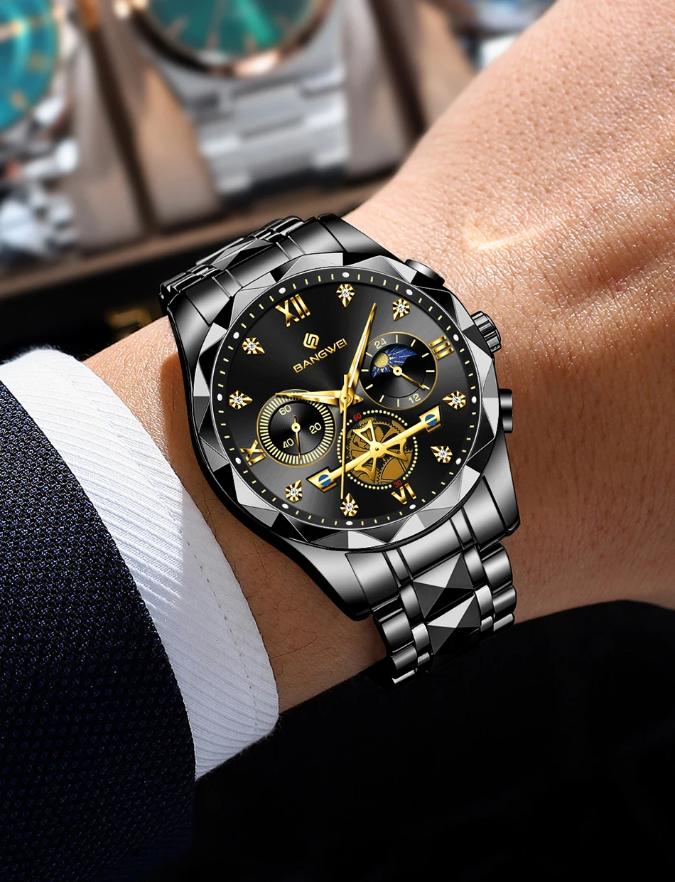 BANGWEI 2026 Men’s Quartz Watch Multifunctional Moon Phase Stainless Steel Wristwatch Luminous Waterproof Business Watch for Men