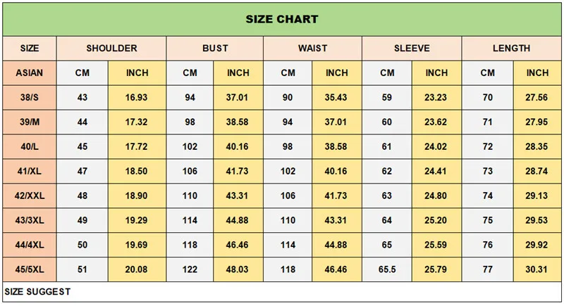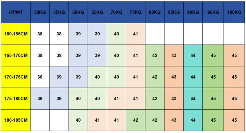 {"sizeInfoList":[{"length":{"cm":"43","inch":"16.93"},"size":"38 Size 160CM 50KG","vid":-81},{"length":{"cm":"44","inch":"17.32"},"size":"39 Size 165CM 60KG","vid":-82},{"length":{"cm":"45","inch":"17.72"},"size":"40 Size 170CM 65KG","vid":-83},{"length":