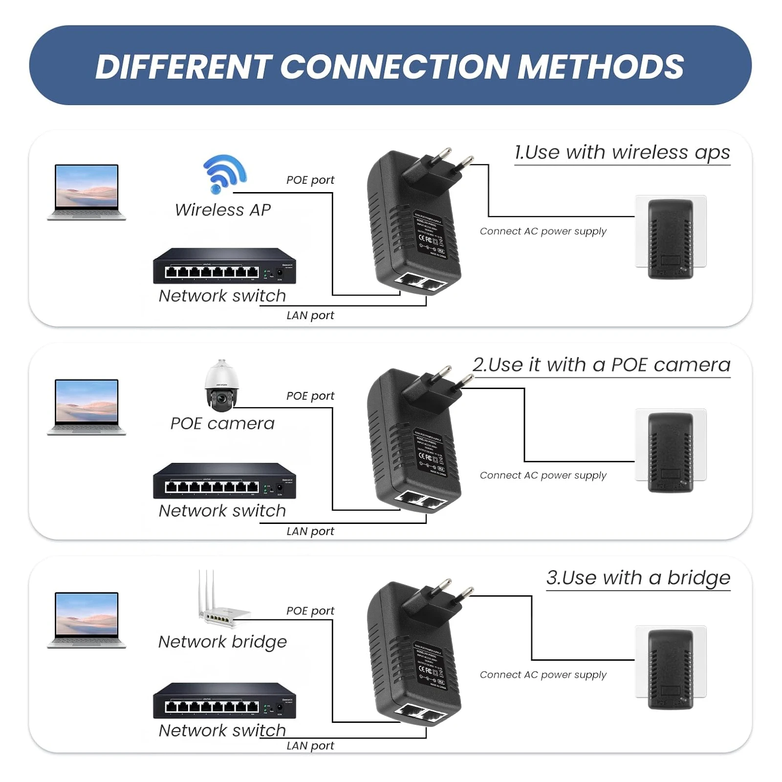 The ideal solution for applications in which an electrical outlet may not be available, the injector adapter can be used to power devices with poe support, such as POE IP cameras . Compact, Wall-mounted design makes it easy to install the adapter in areas where space is limited, and can be set in seconds without the need for configuration.