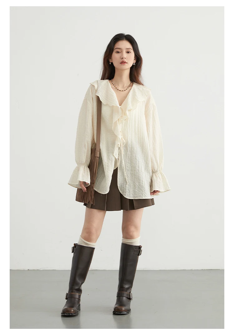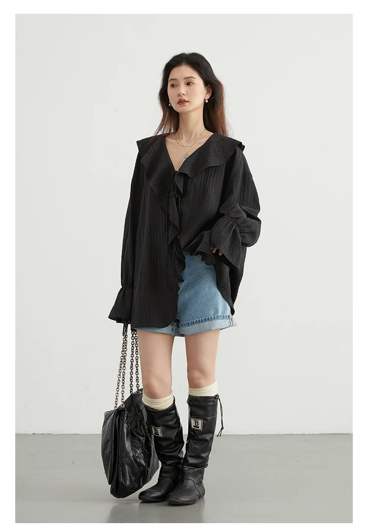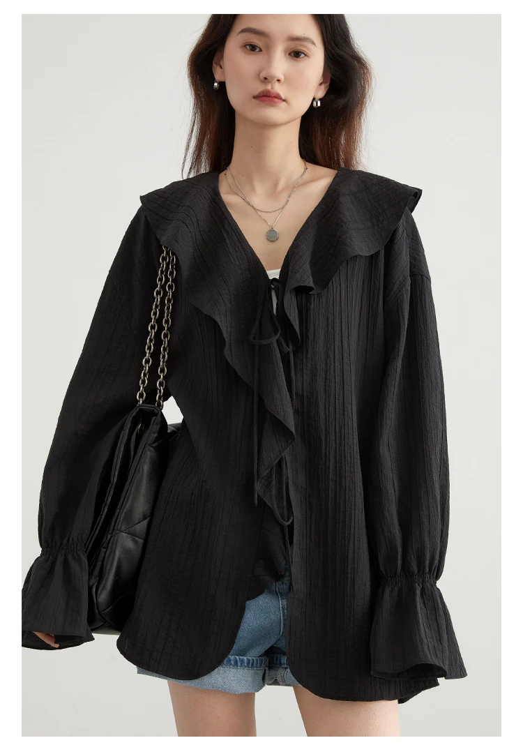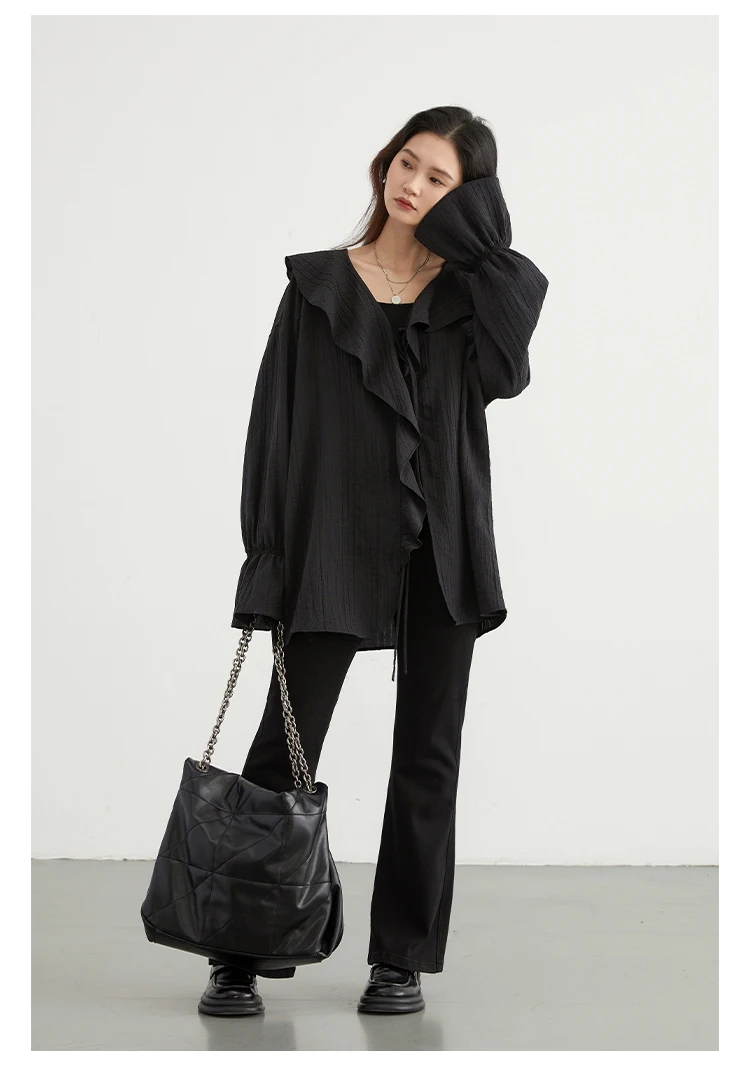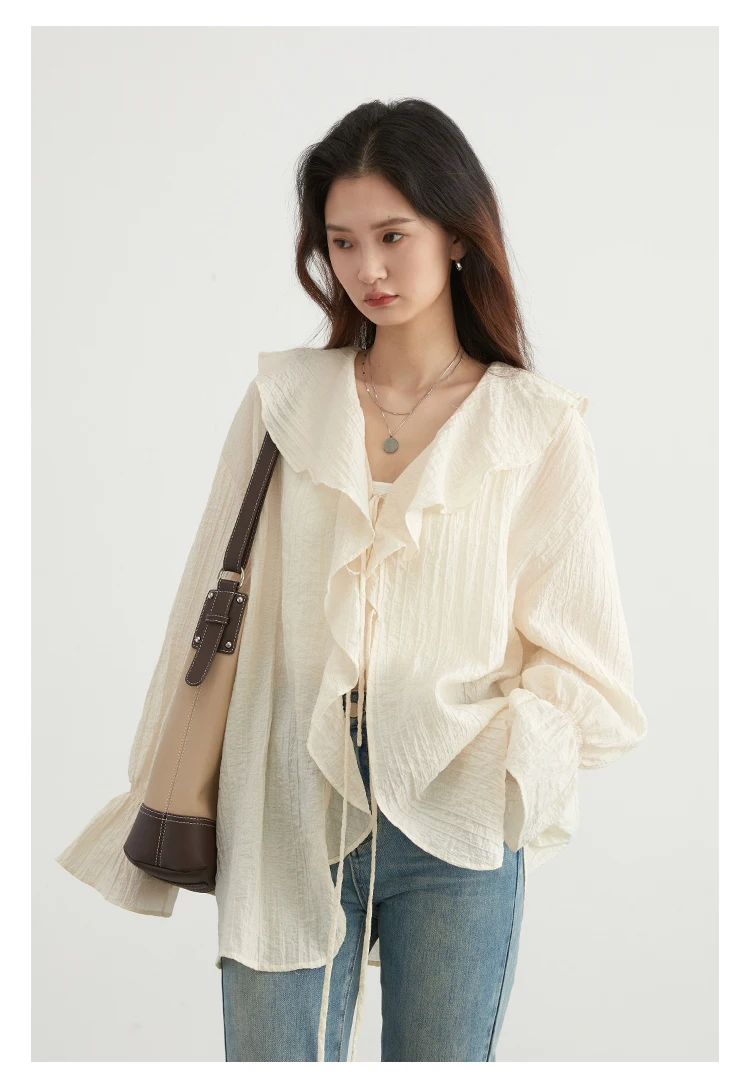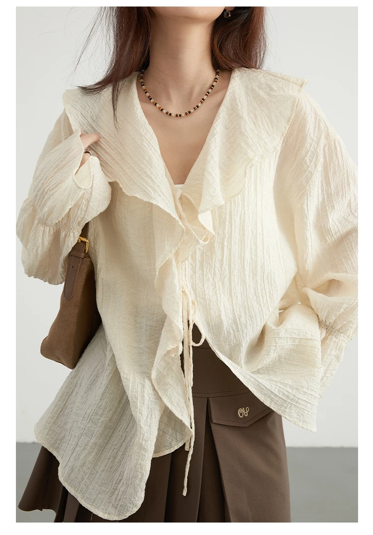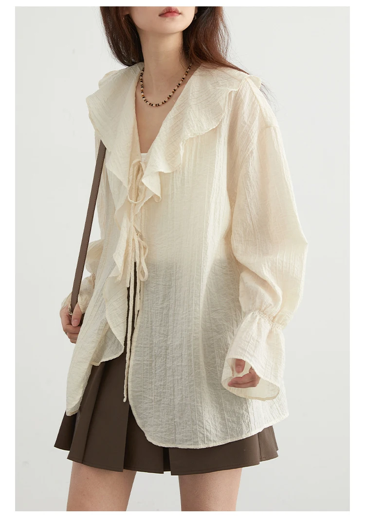 CHIC VEN Women Shirt Loose Casual Ruffled Edges Female Blouses V Neck Lace Up Mid Length Woman Shirts Spring Summer 2026