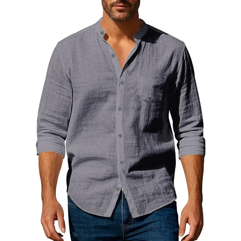 Cotton Linen Shirt for Men Henley Neck Solid Color Lightweight Breathable Single Breasted Slim Fit Casual Long Sleeve Button Top