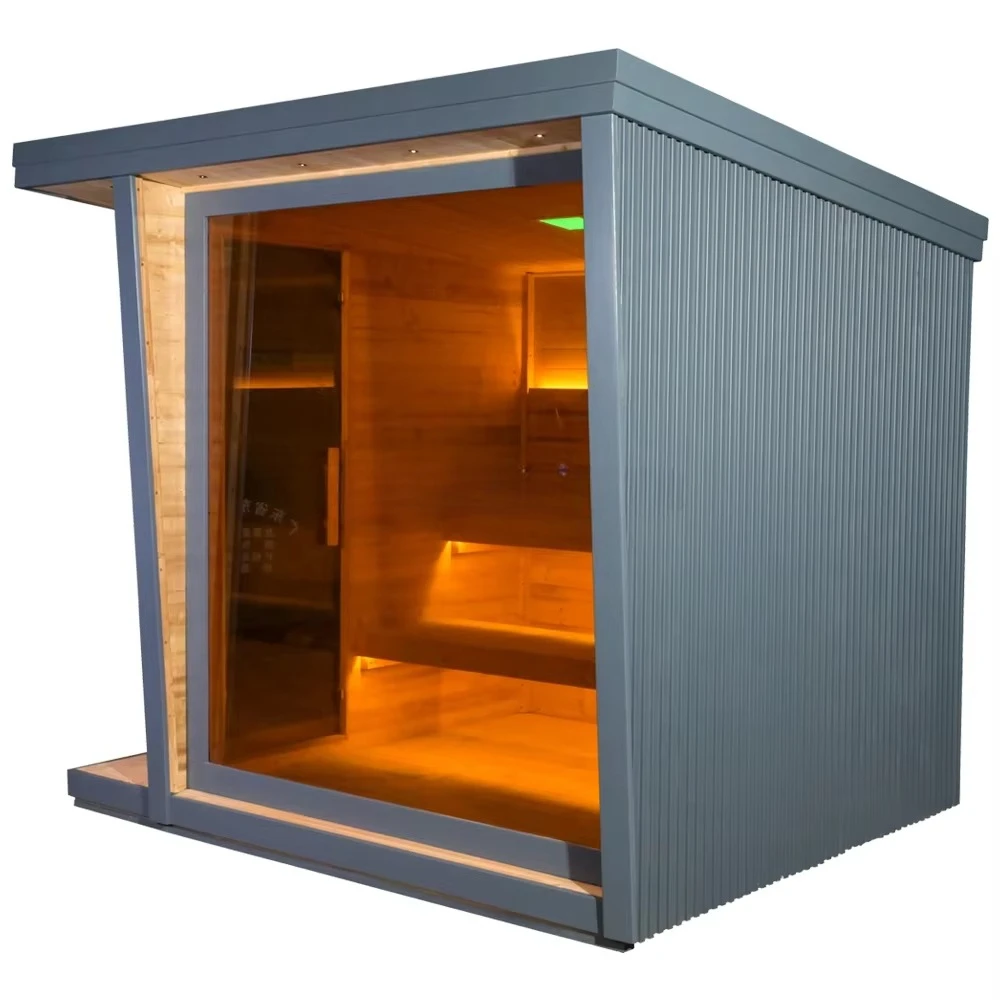 Custom-made gray outdoor modern dry sauna, made of eco-friendly solid wood, suitable for 4-6 people.