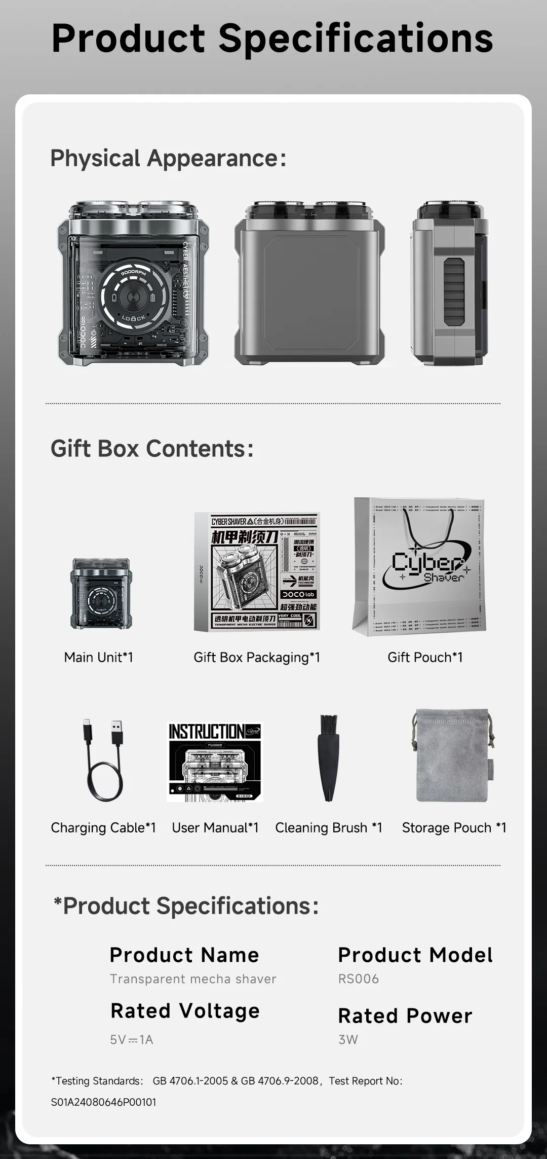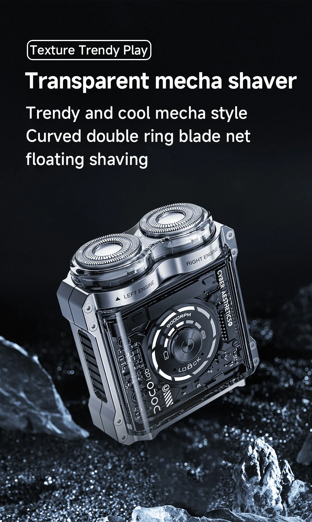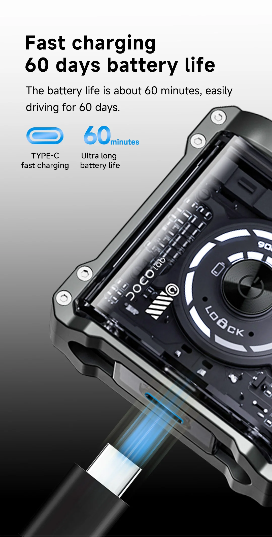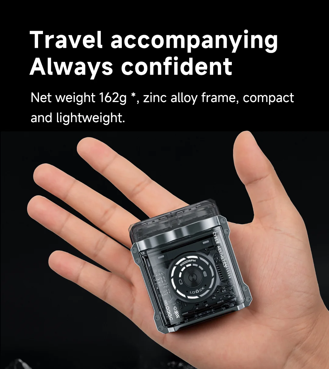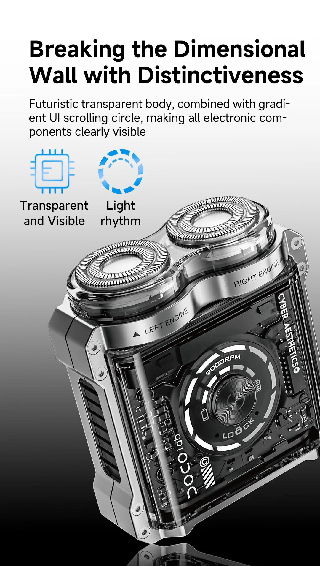 2. The transparent body, combined with a gradient UI scrolling circle, makes all electronic components clearly visible and full of technological sense.