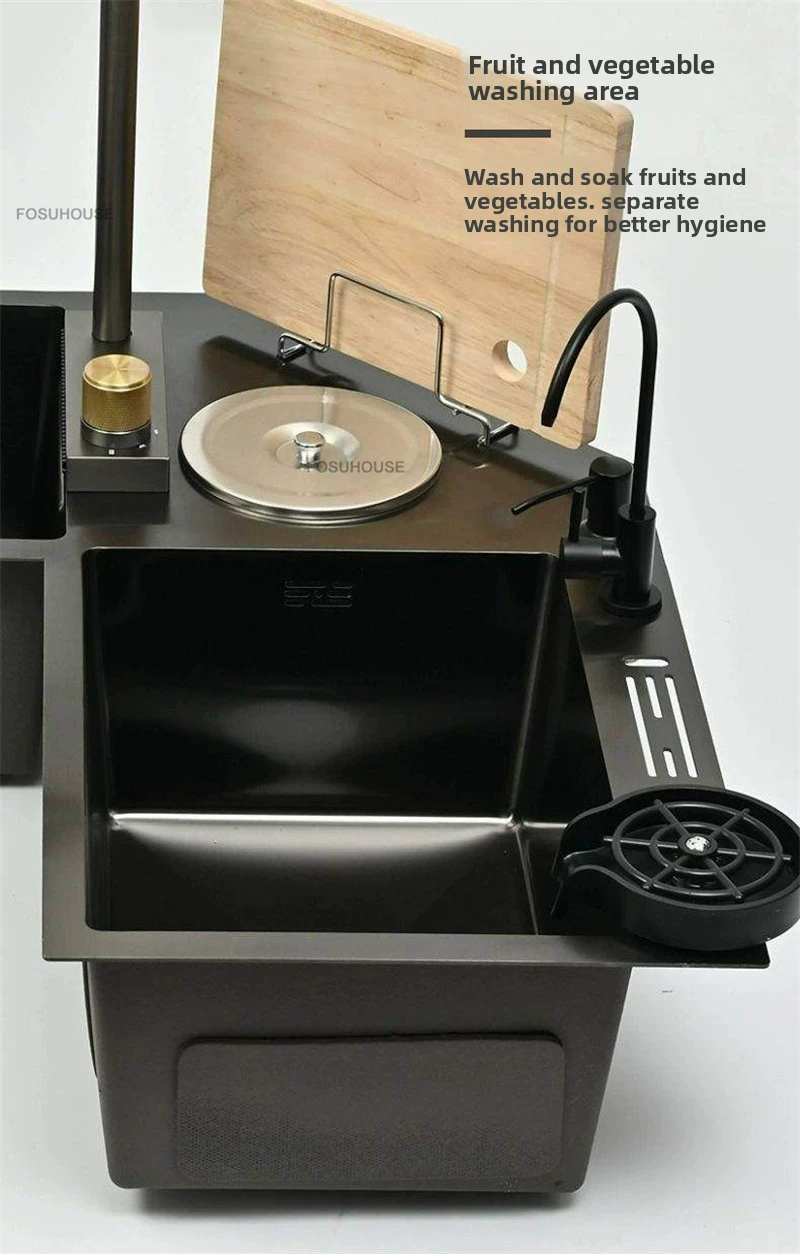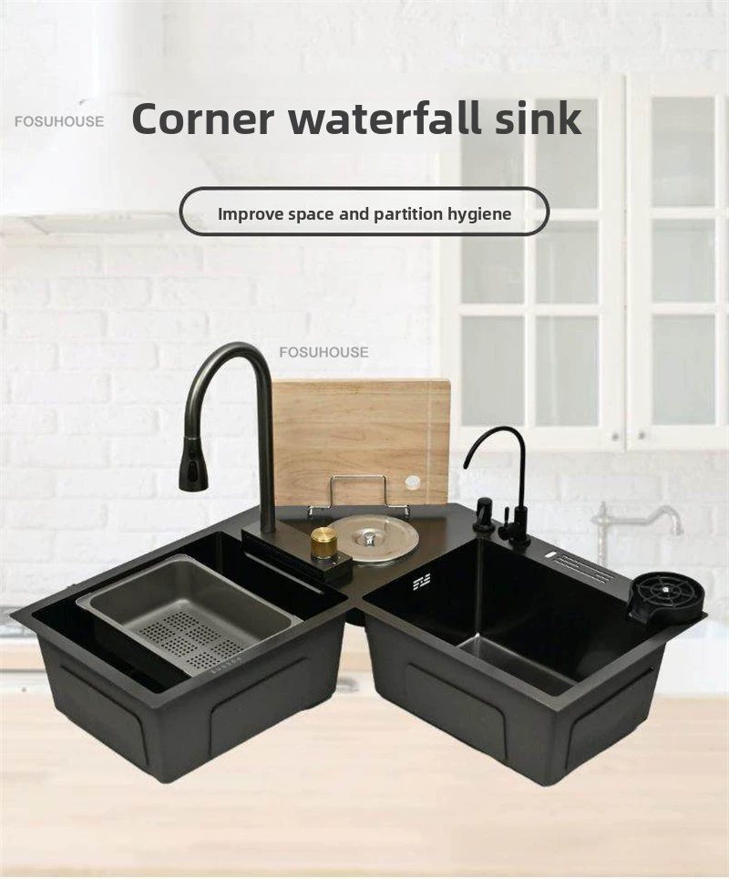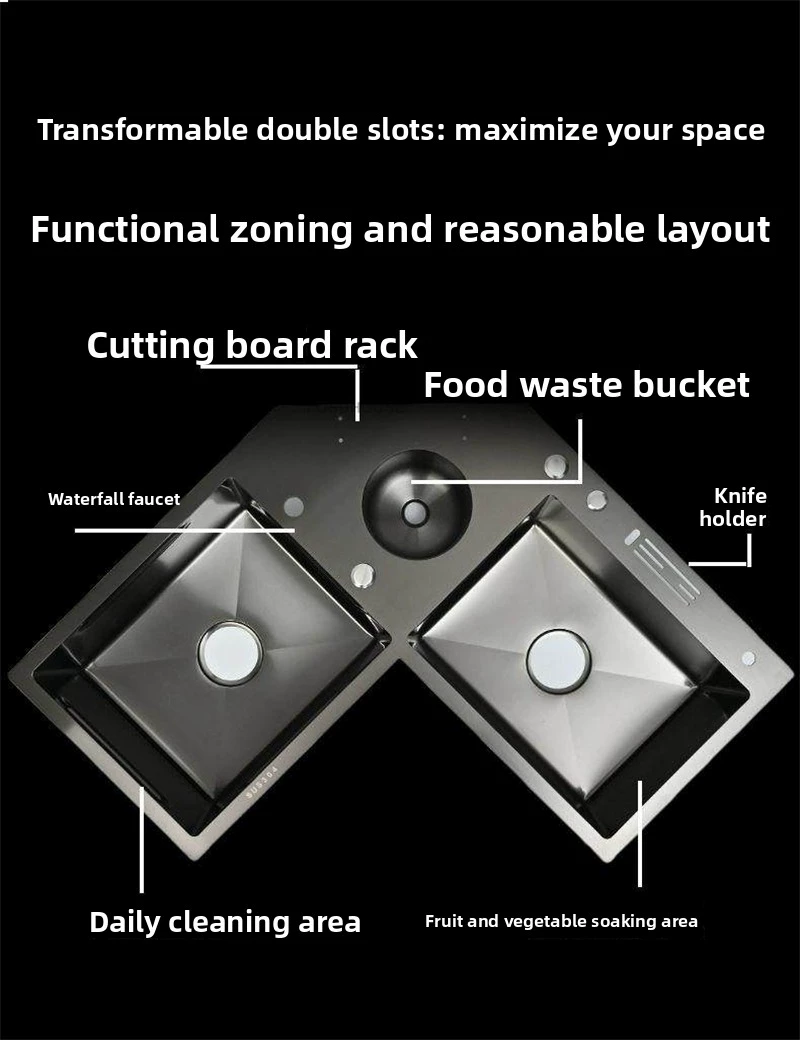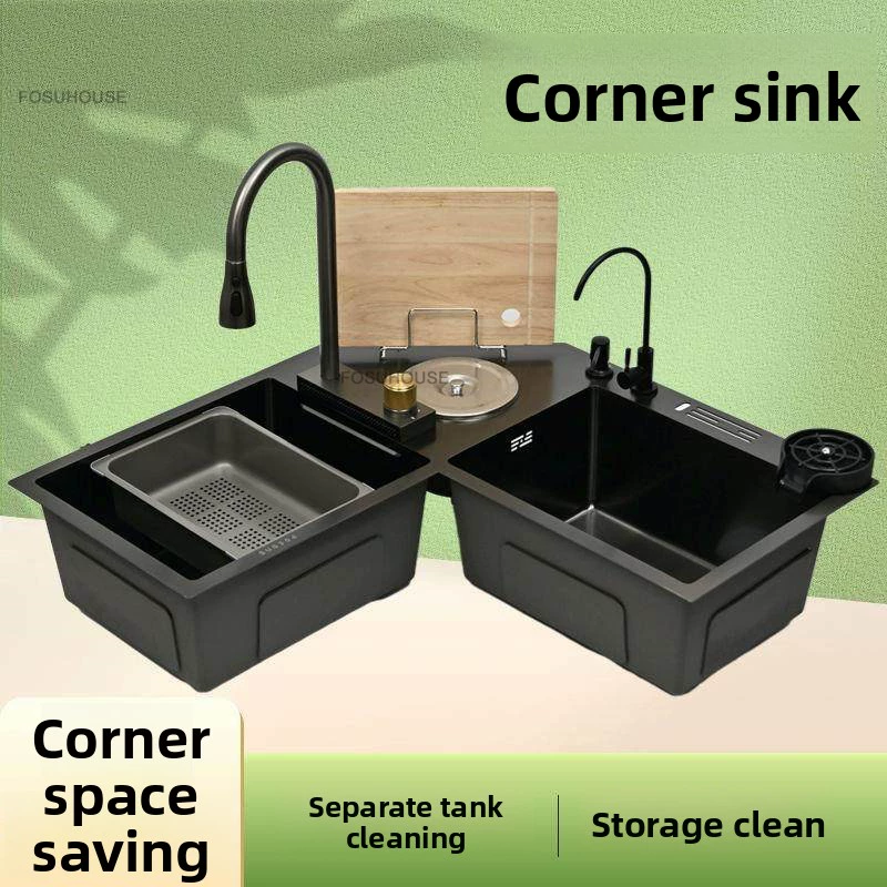 Double-slot Washbasin Nano Corner Kitchen Sinks Creative Kitchen Accessories Thickened Shaped Handmade Basin with Knife Holder H