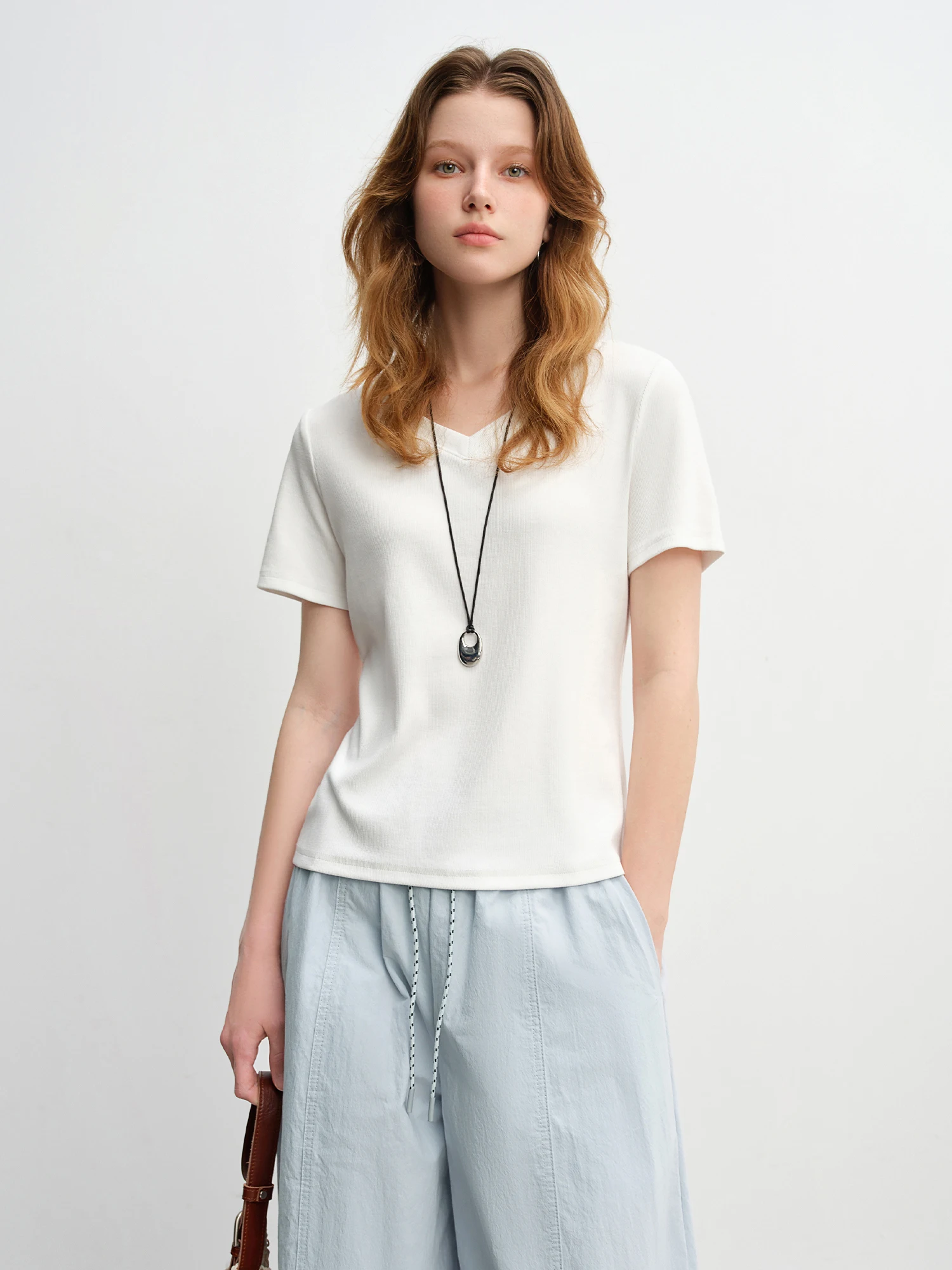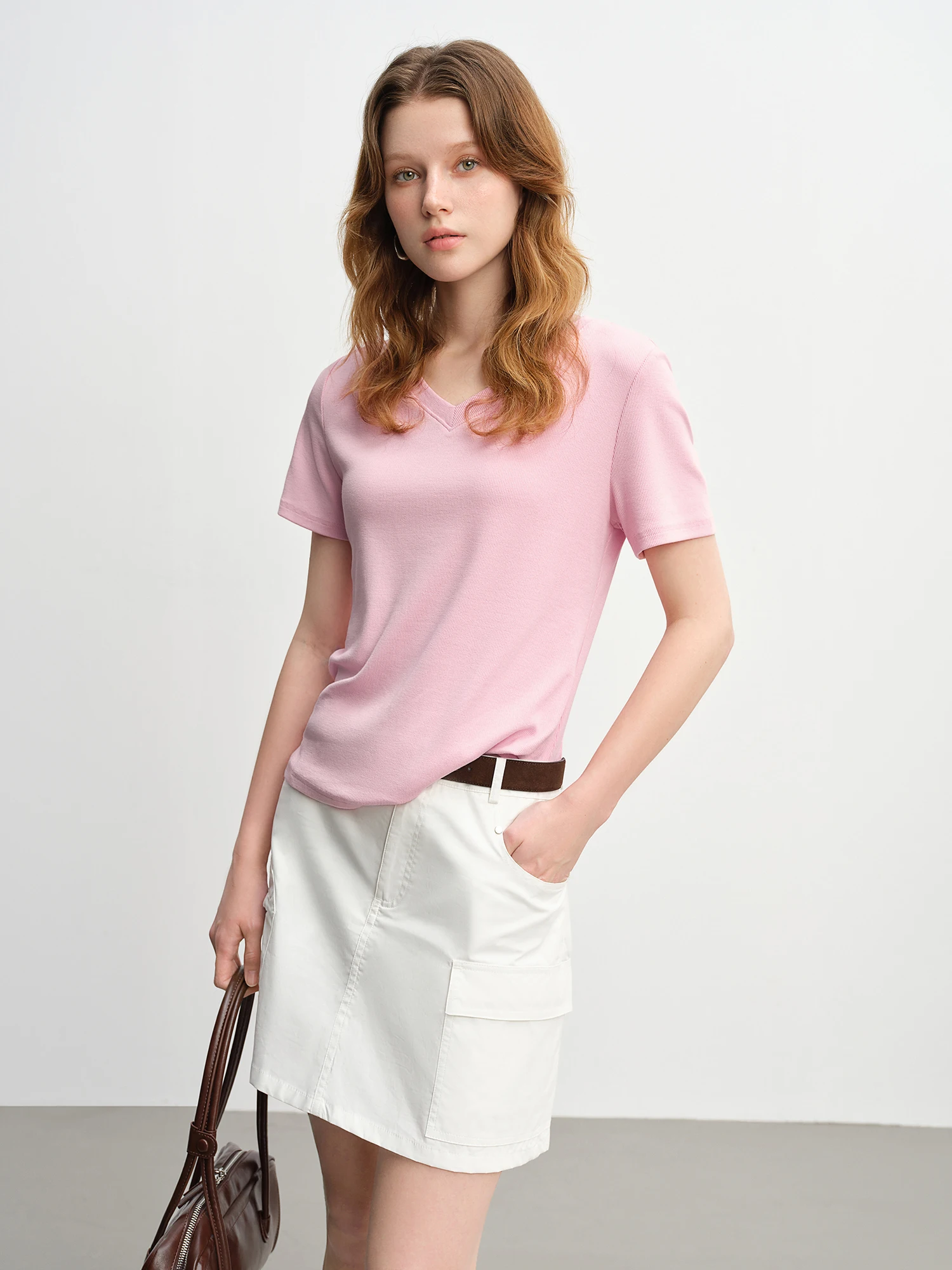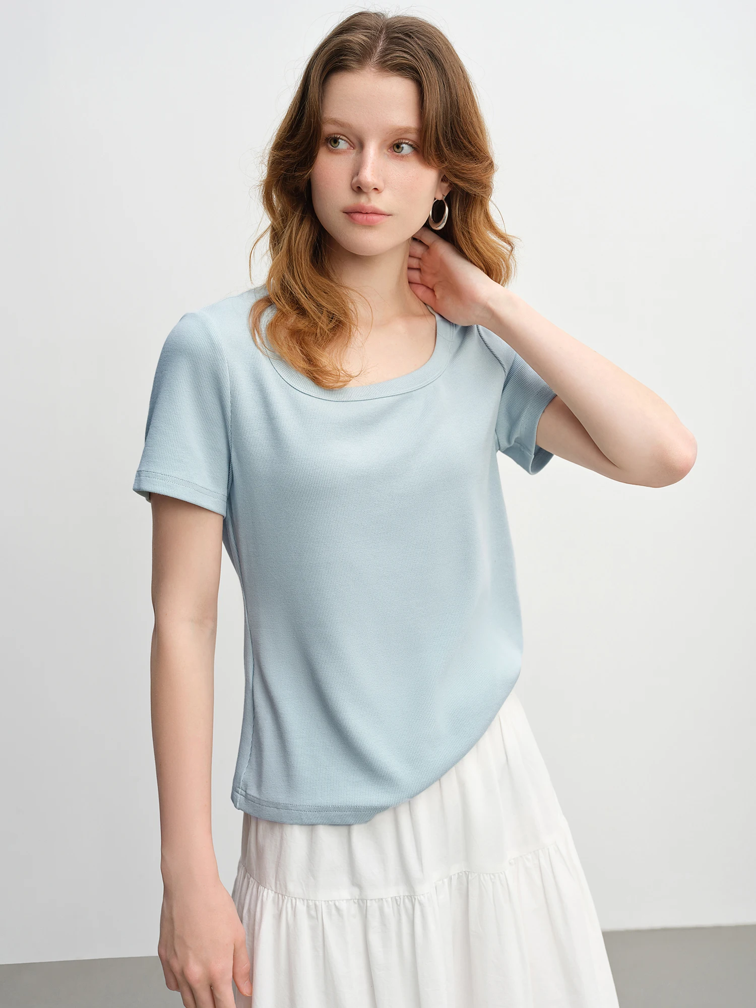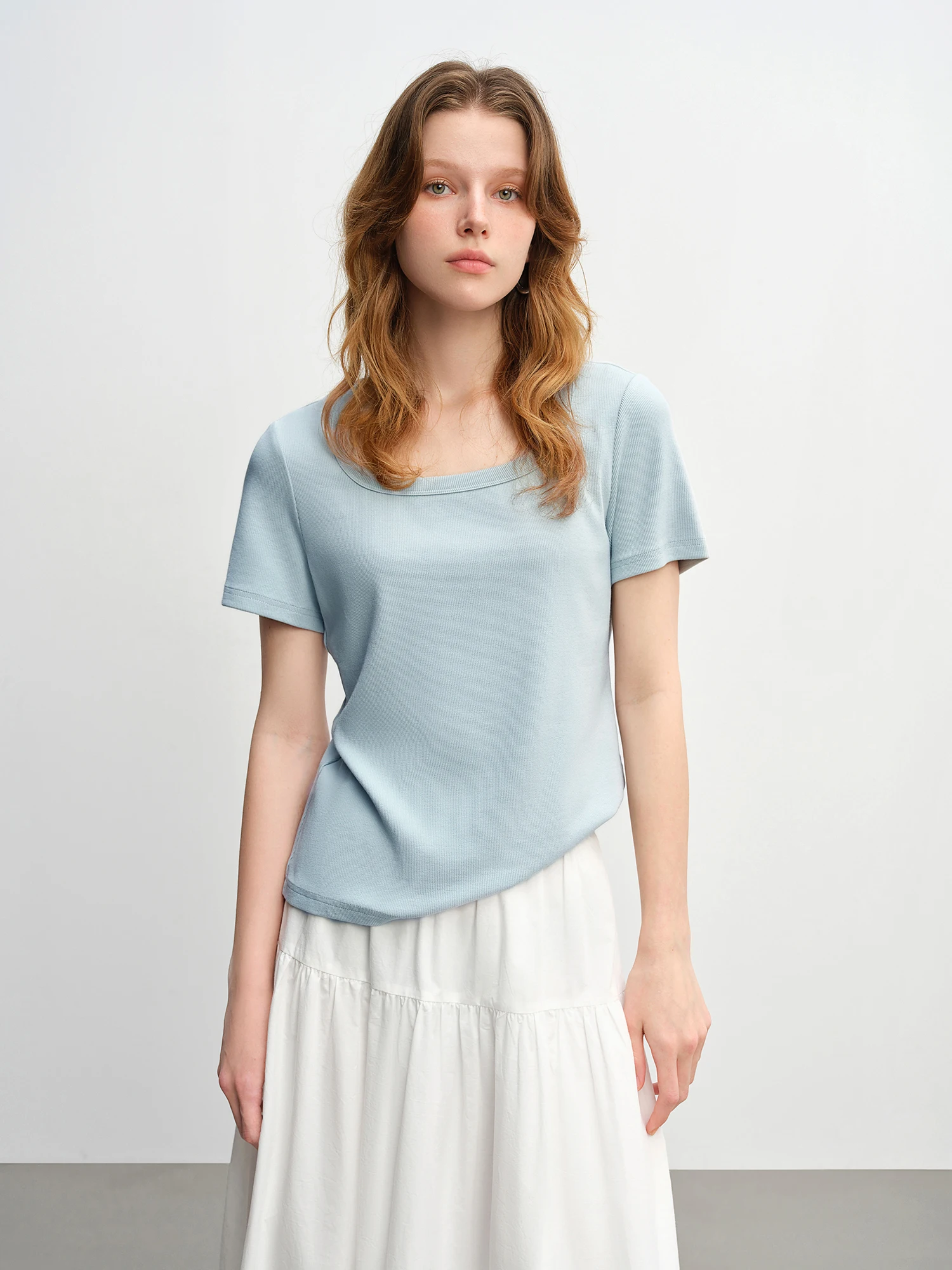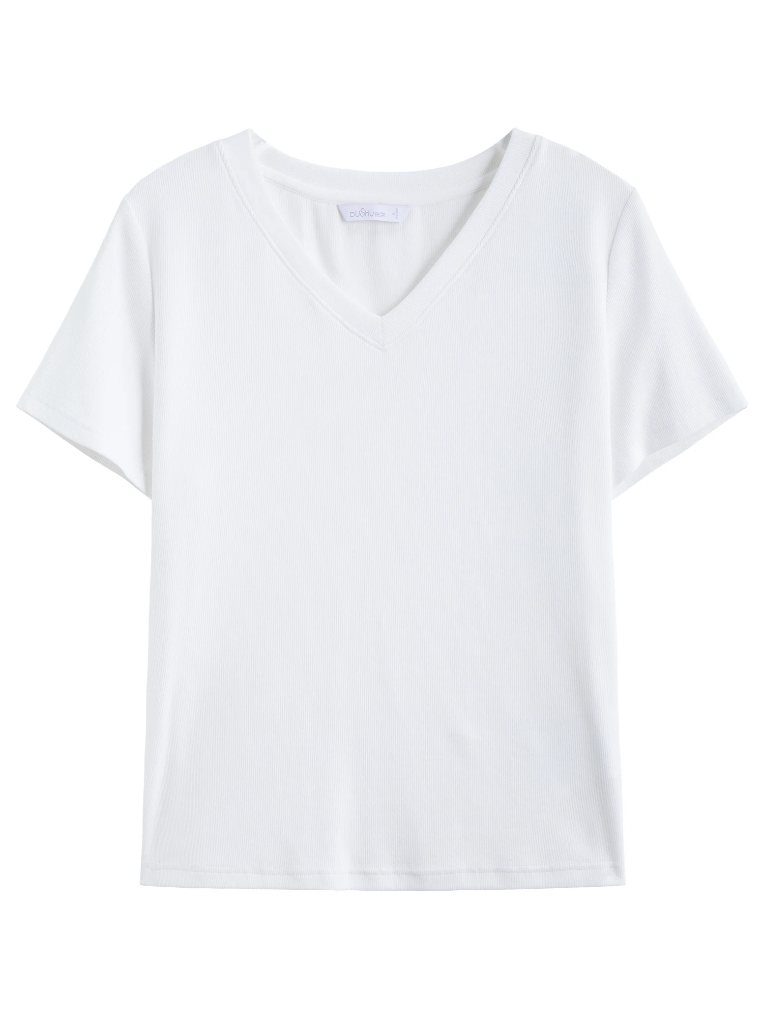 DUSHU Women High-Stretch Structured Shoulder V/U Neck Tee 2025 Summer Casual T-Shirt Elastic Cotton Y2K Fashion New Arrival
