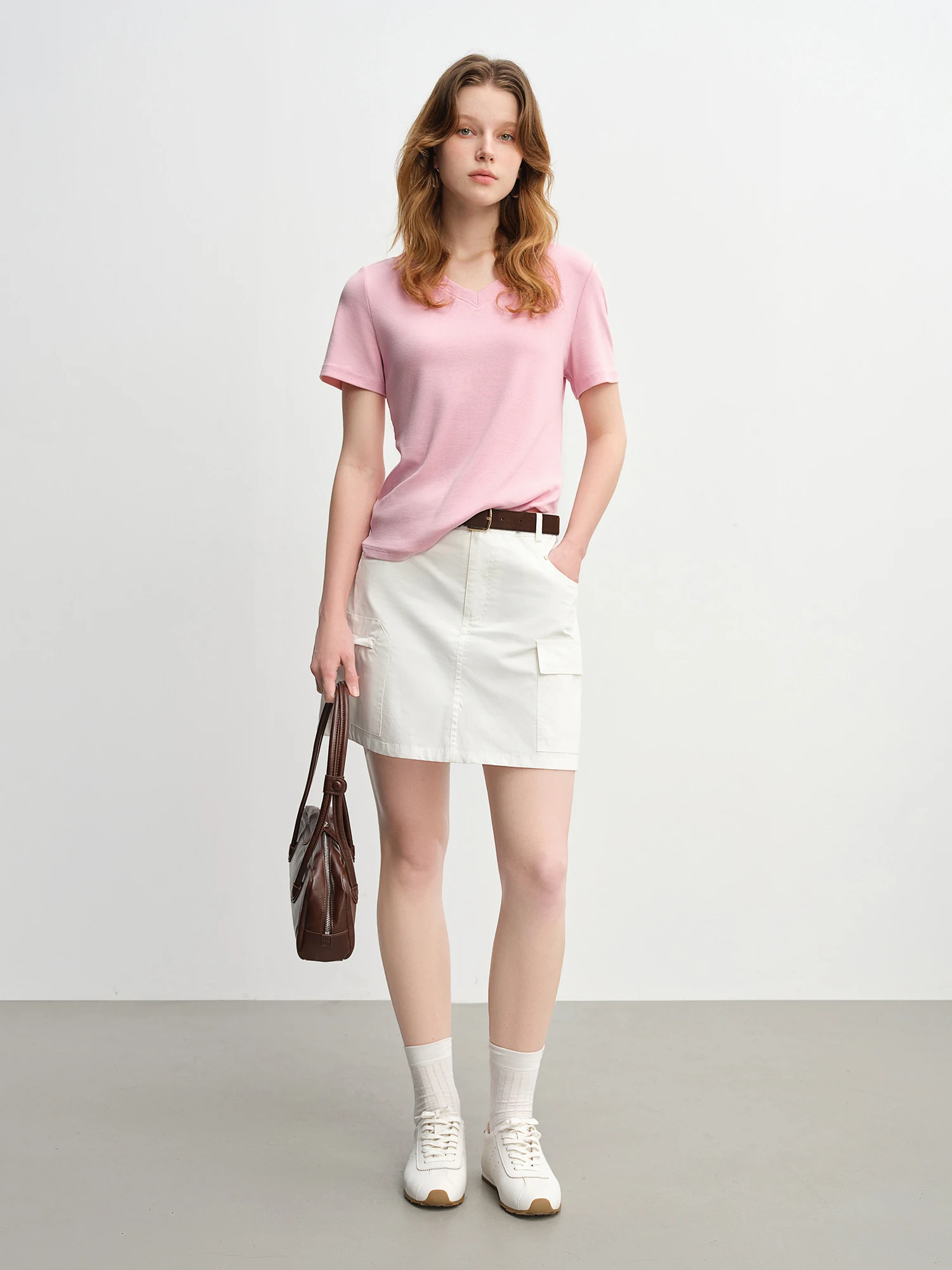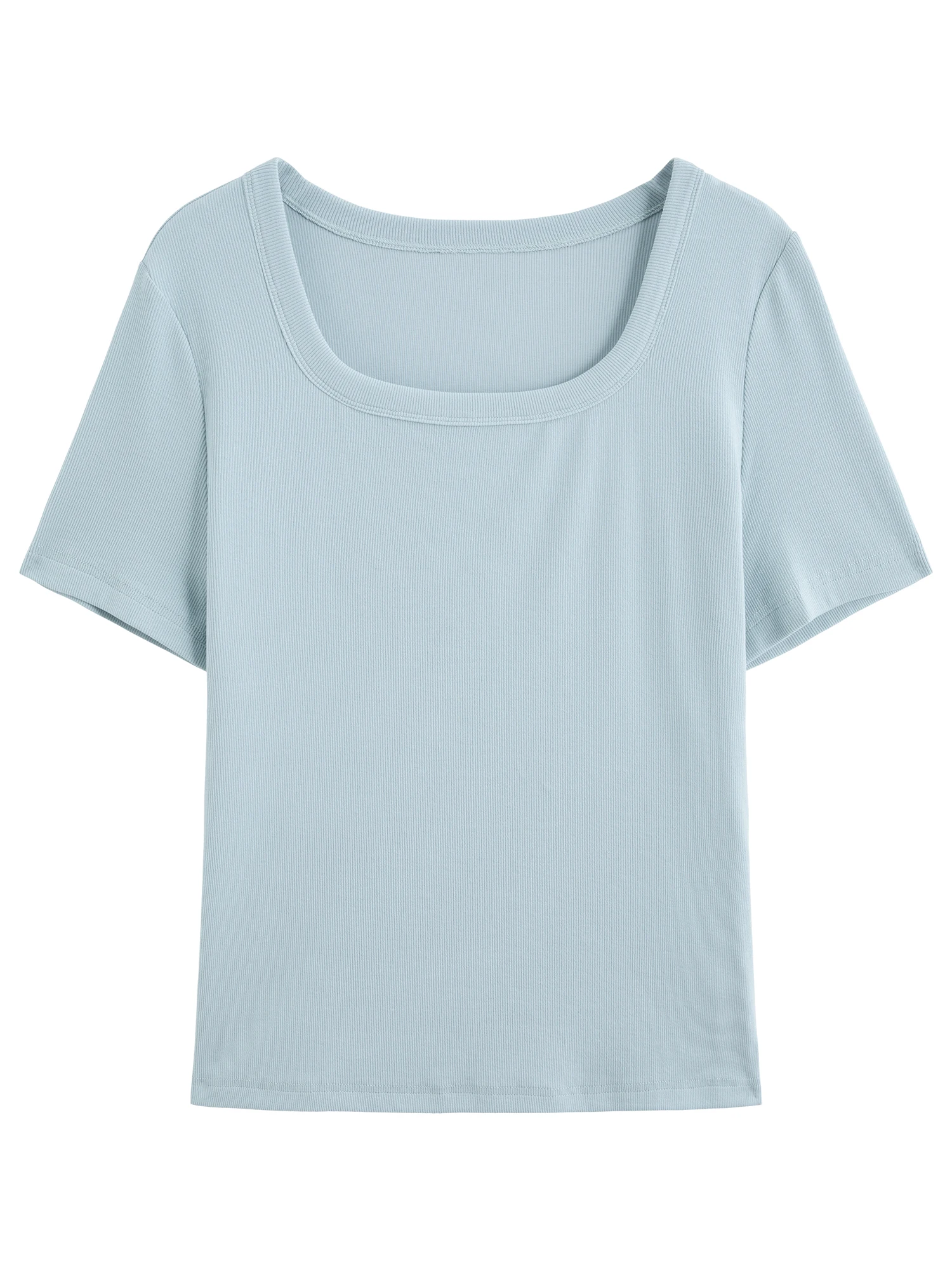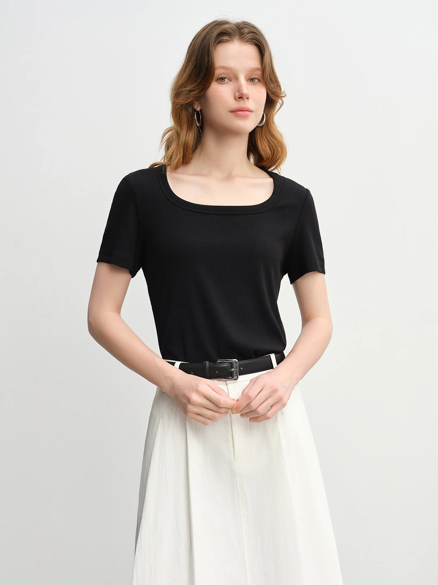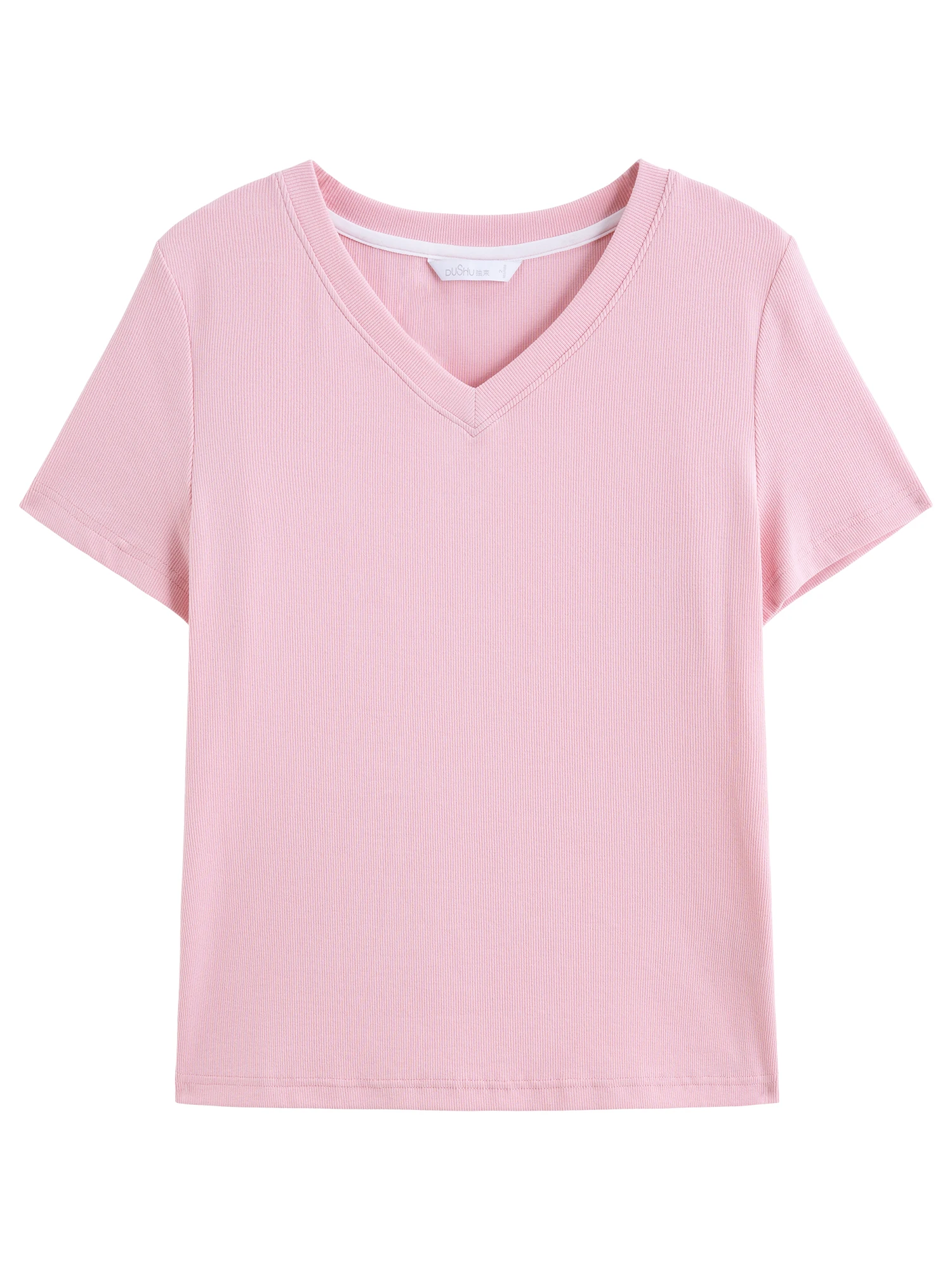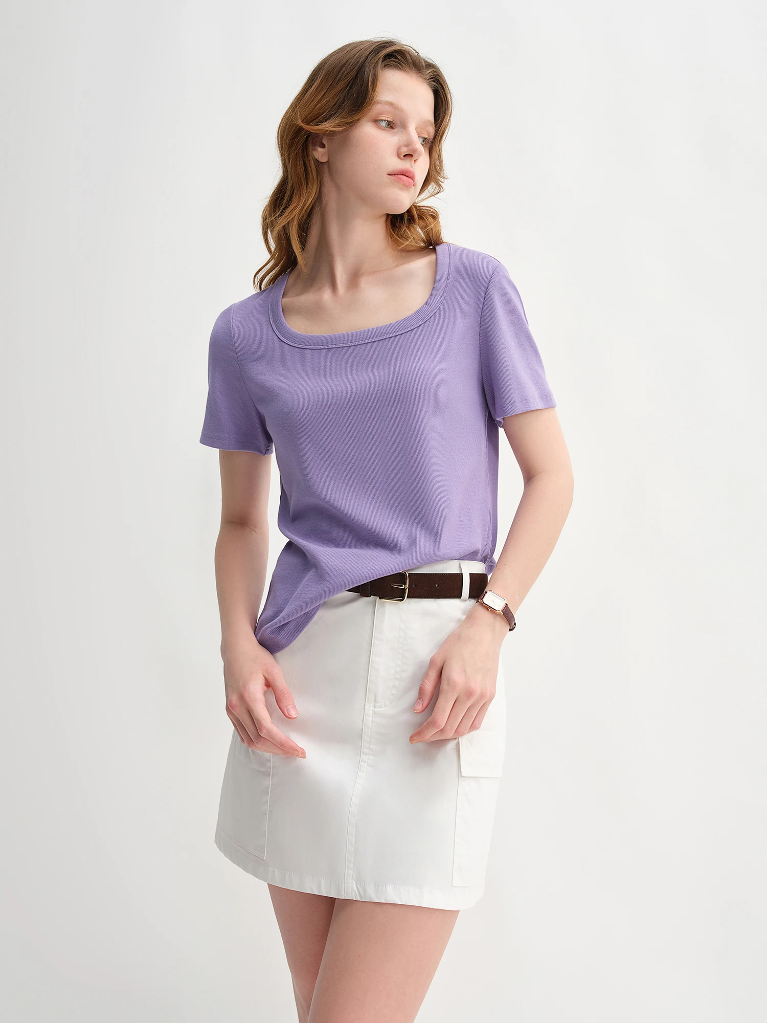 DUSHU Women High-Stretch Structured Shoulder V/U Neck Tee 2025 Summer Casual T-Shirt Elastic Cotton Y2K Fashion New Arrival