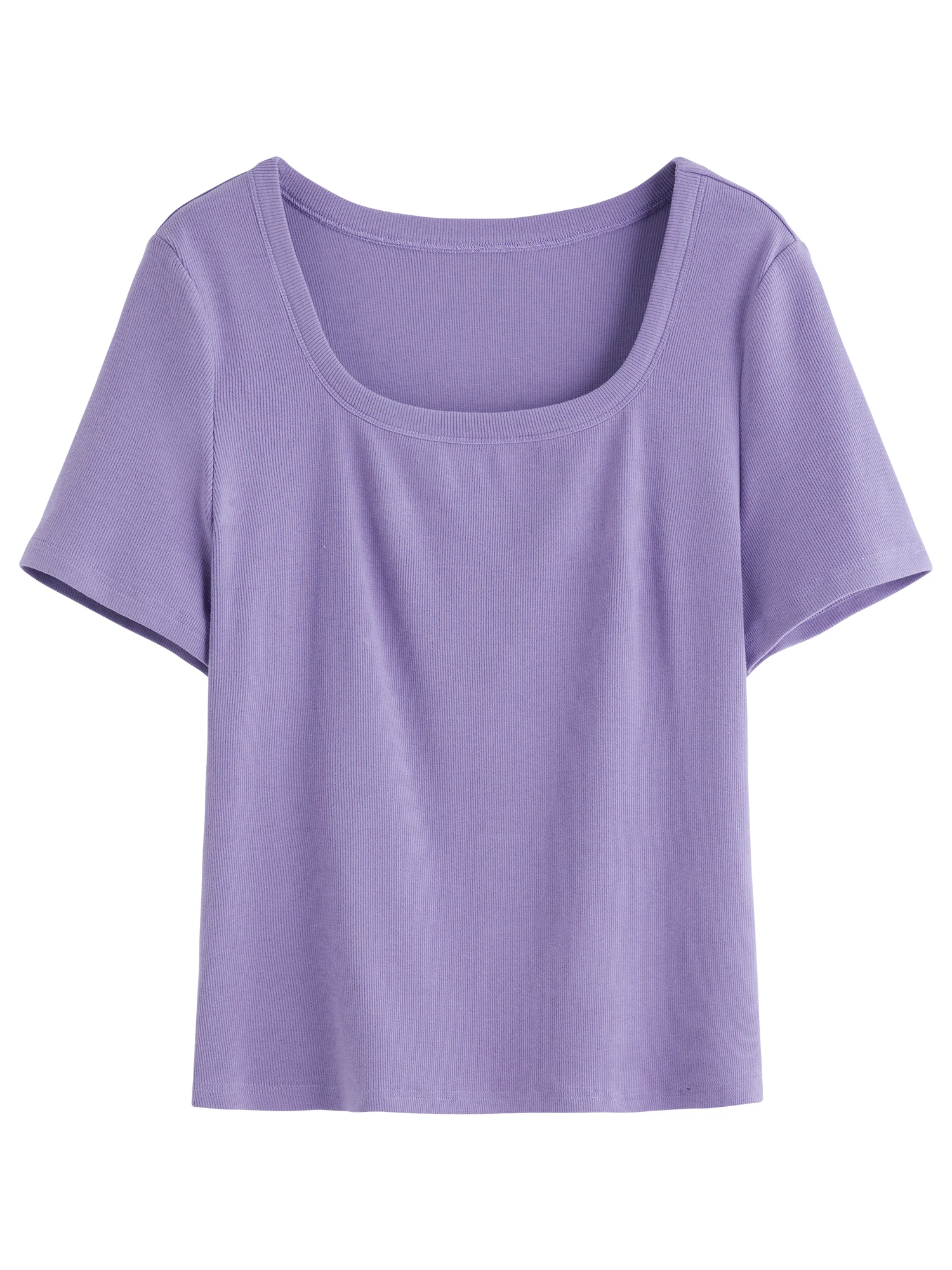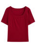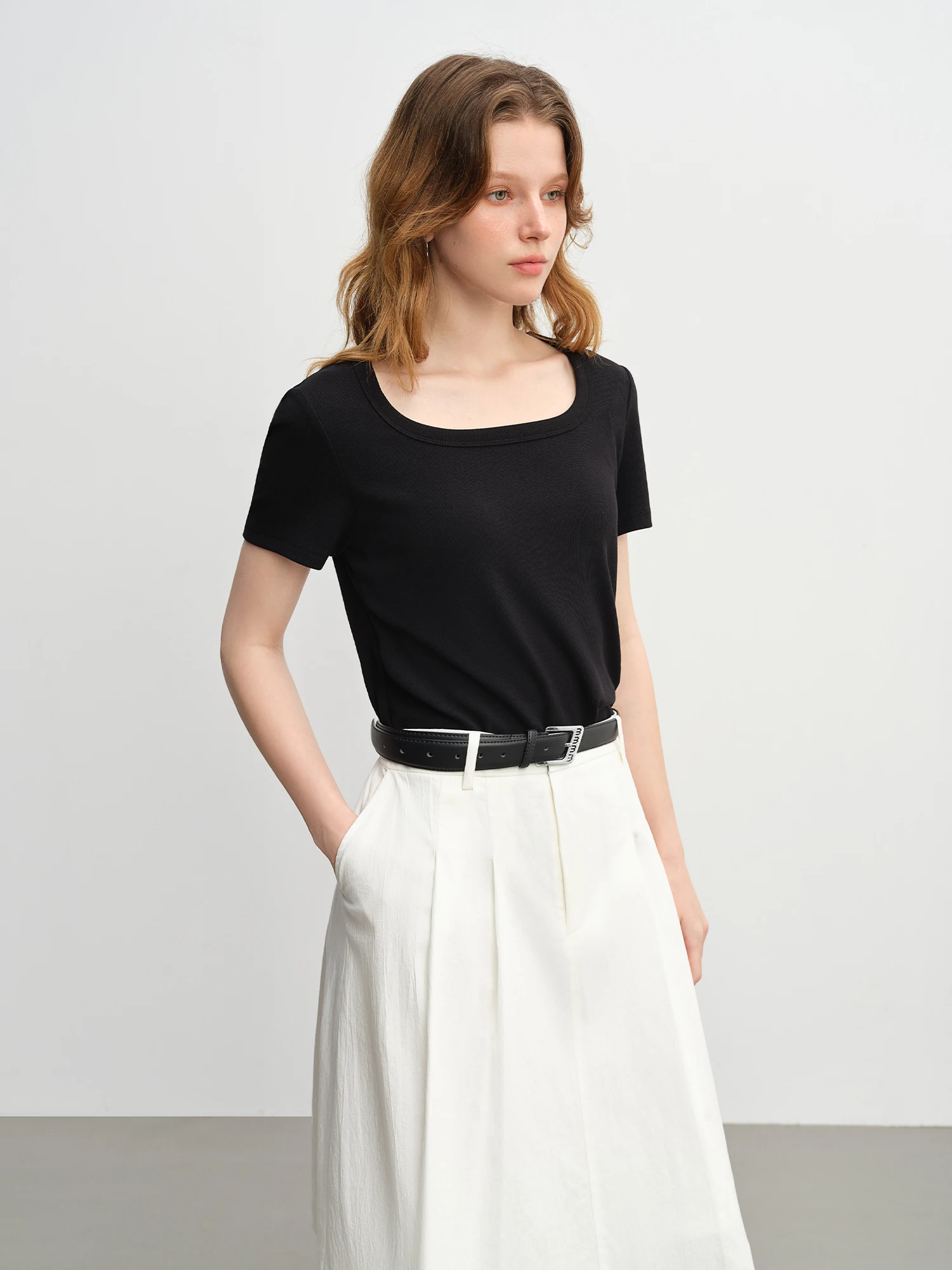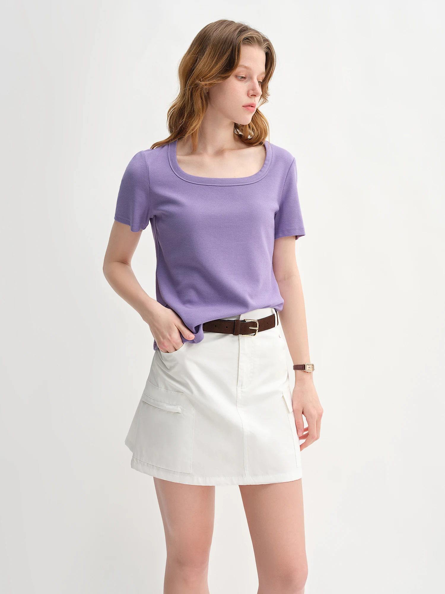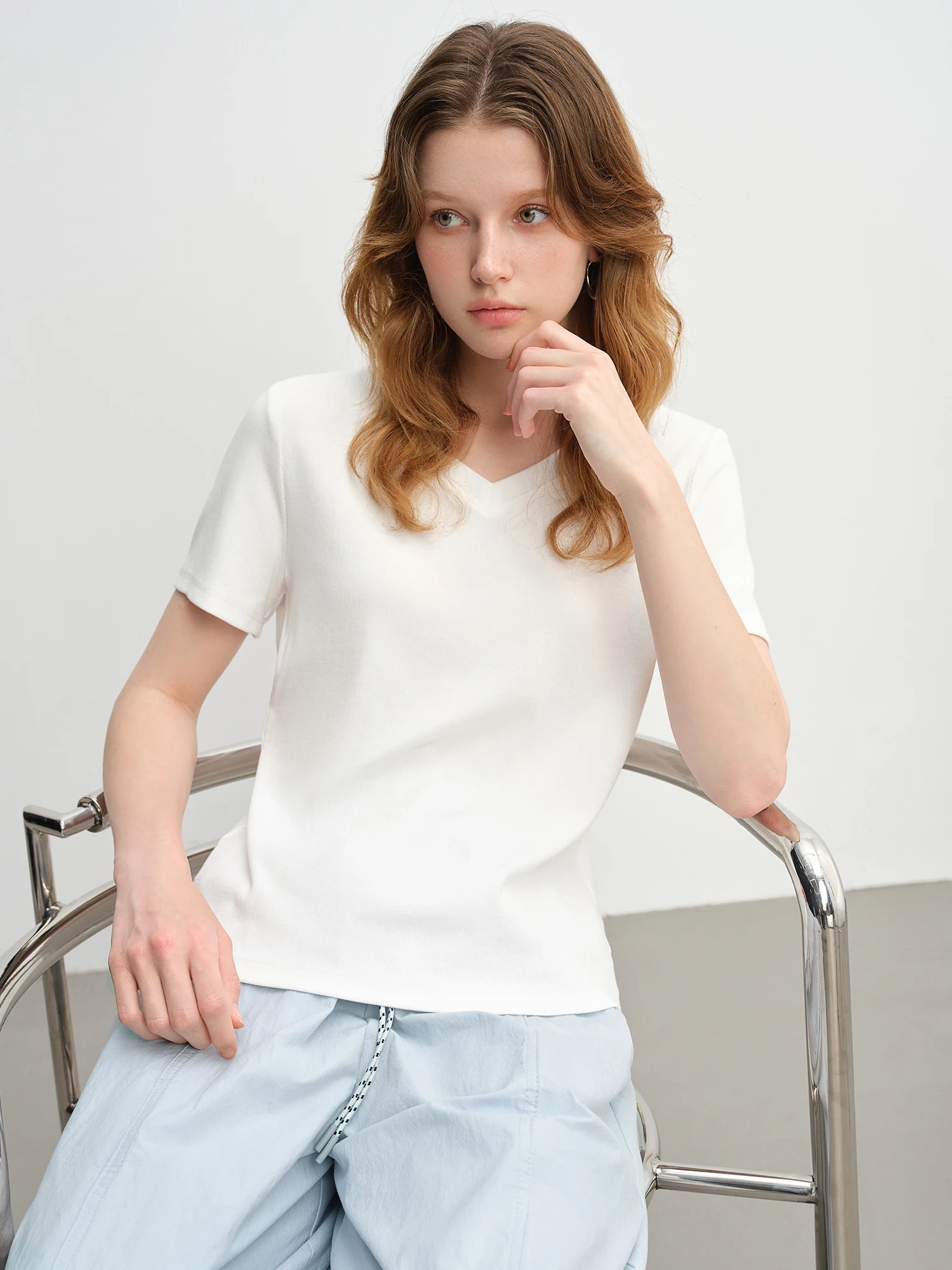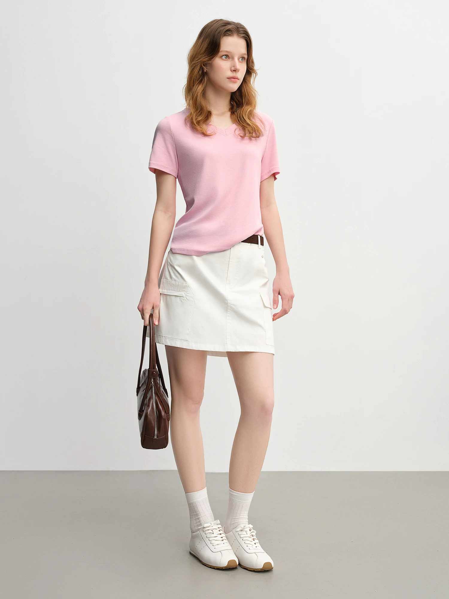 DUSHU Women High-Stretch Structured Shoulder V/U Neck Tee 2025 Summer Casual T-Shirt Elastic Cotton Y2K Fashion New Arrival