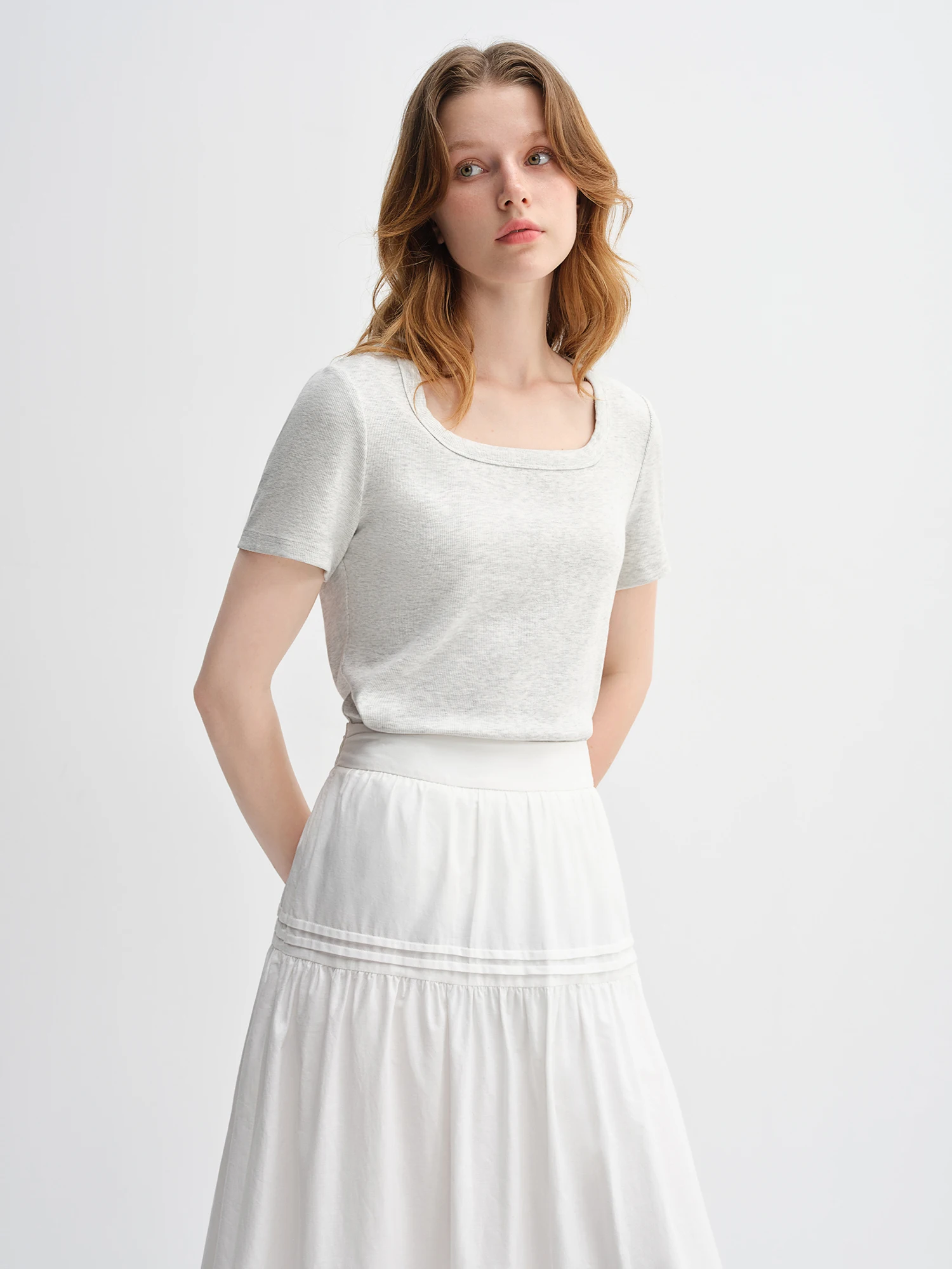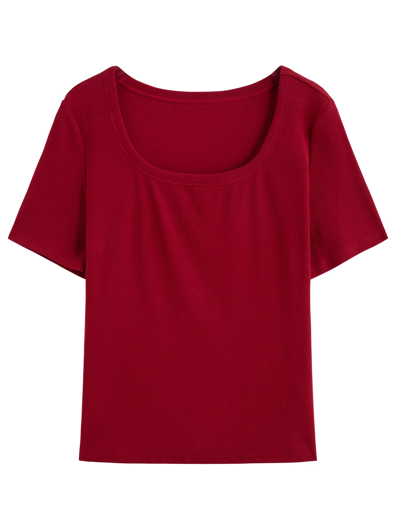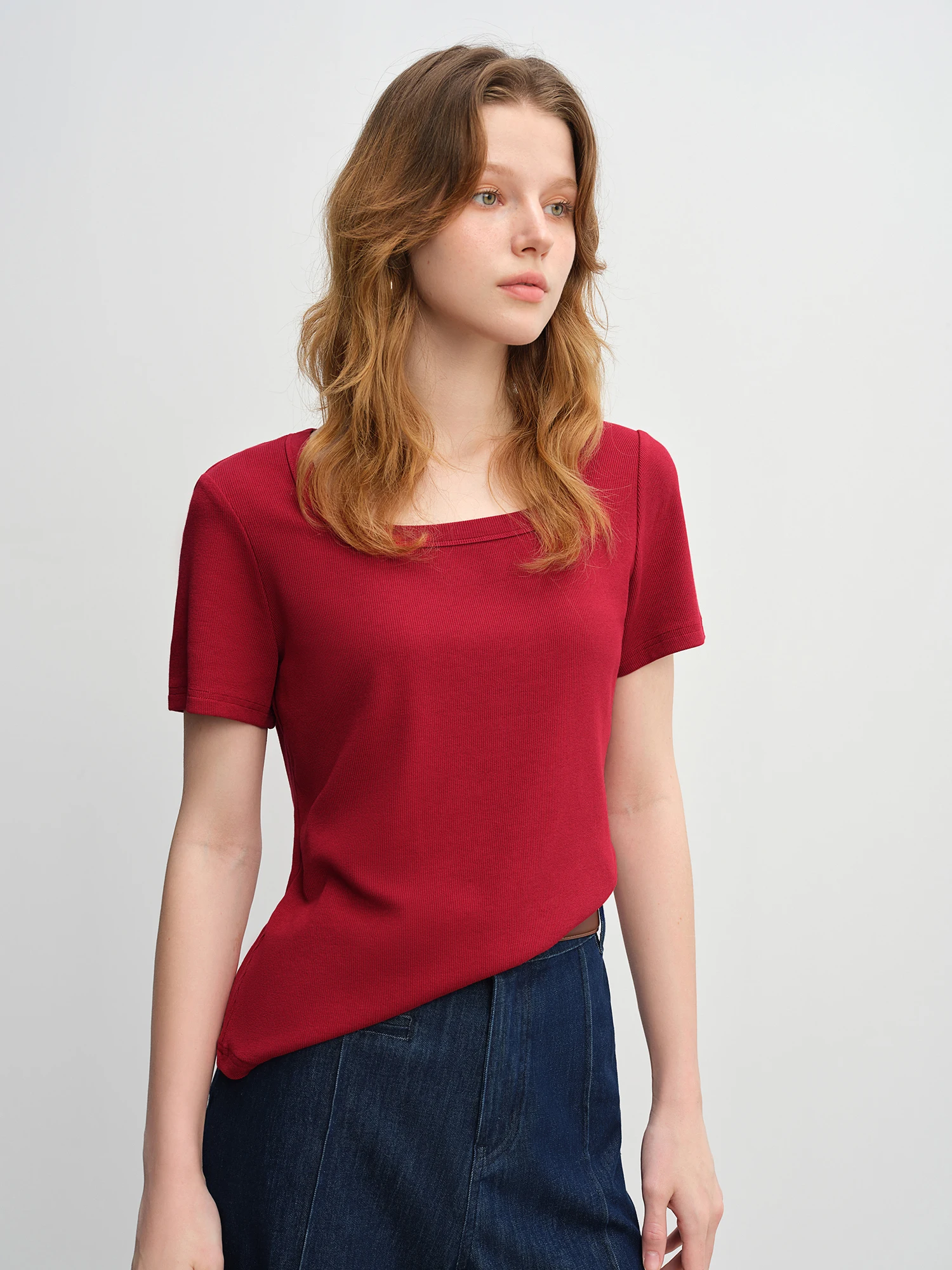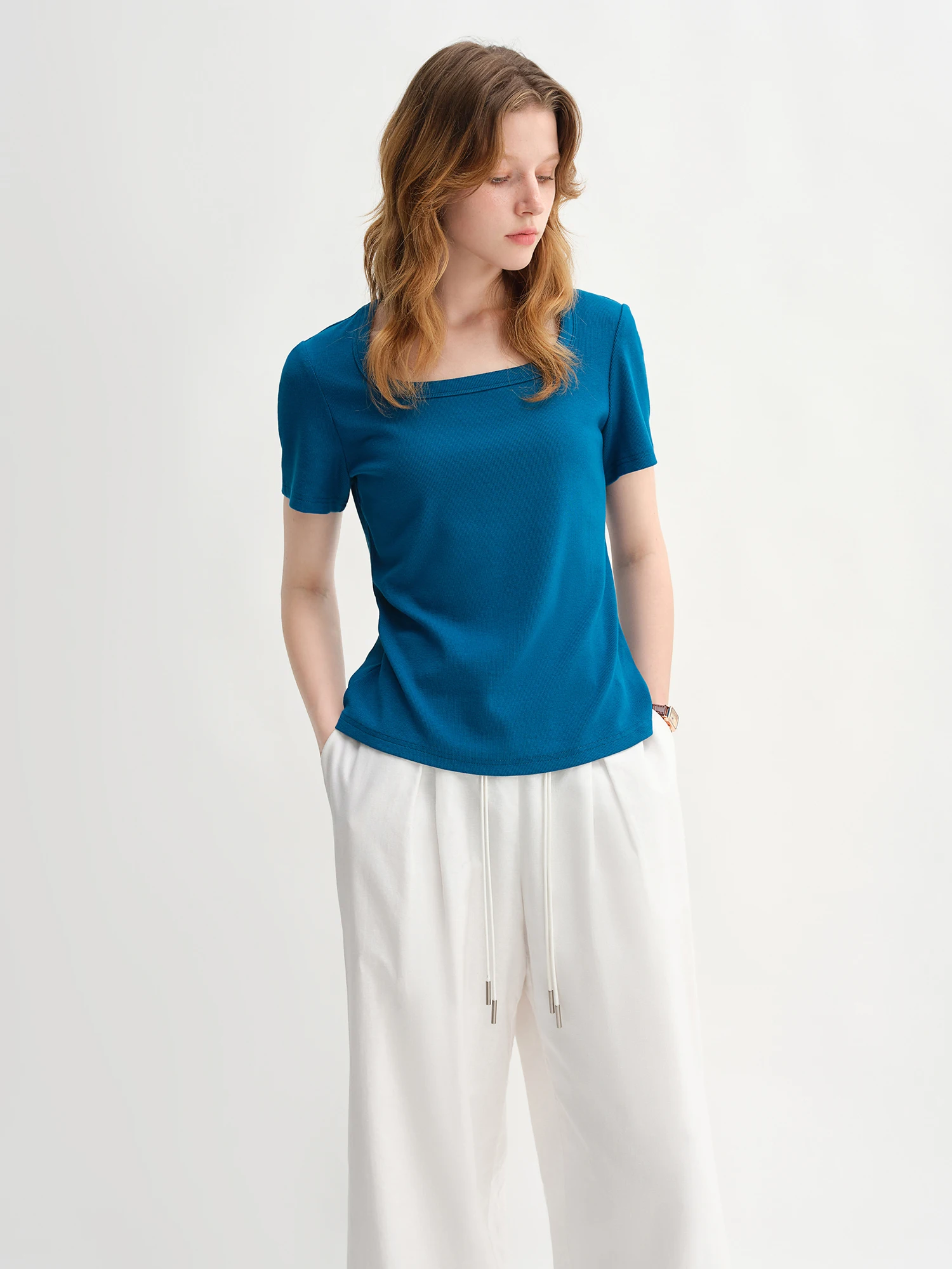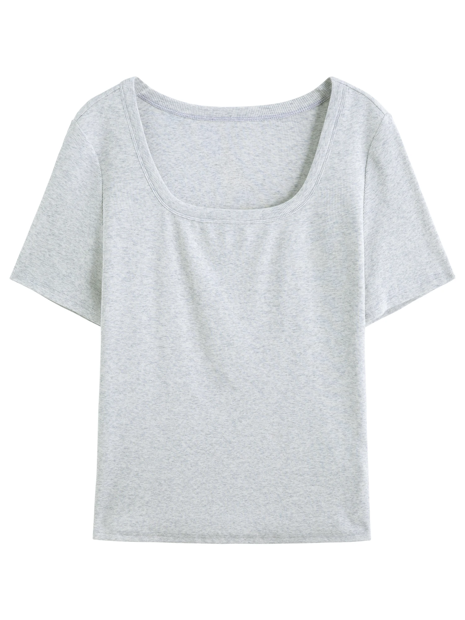 DUSHU Women High-Stretch Structured Shoulder V/U Neck Tee 2025 Summer Casual T-Shirt Elastic Cotton Y2K Fashion New Arrival