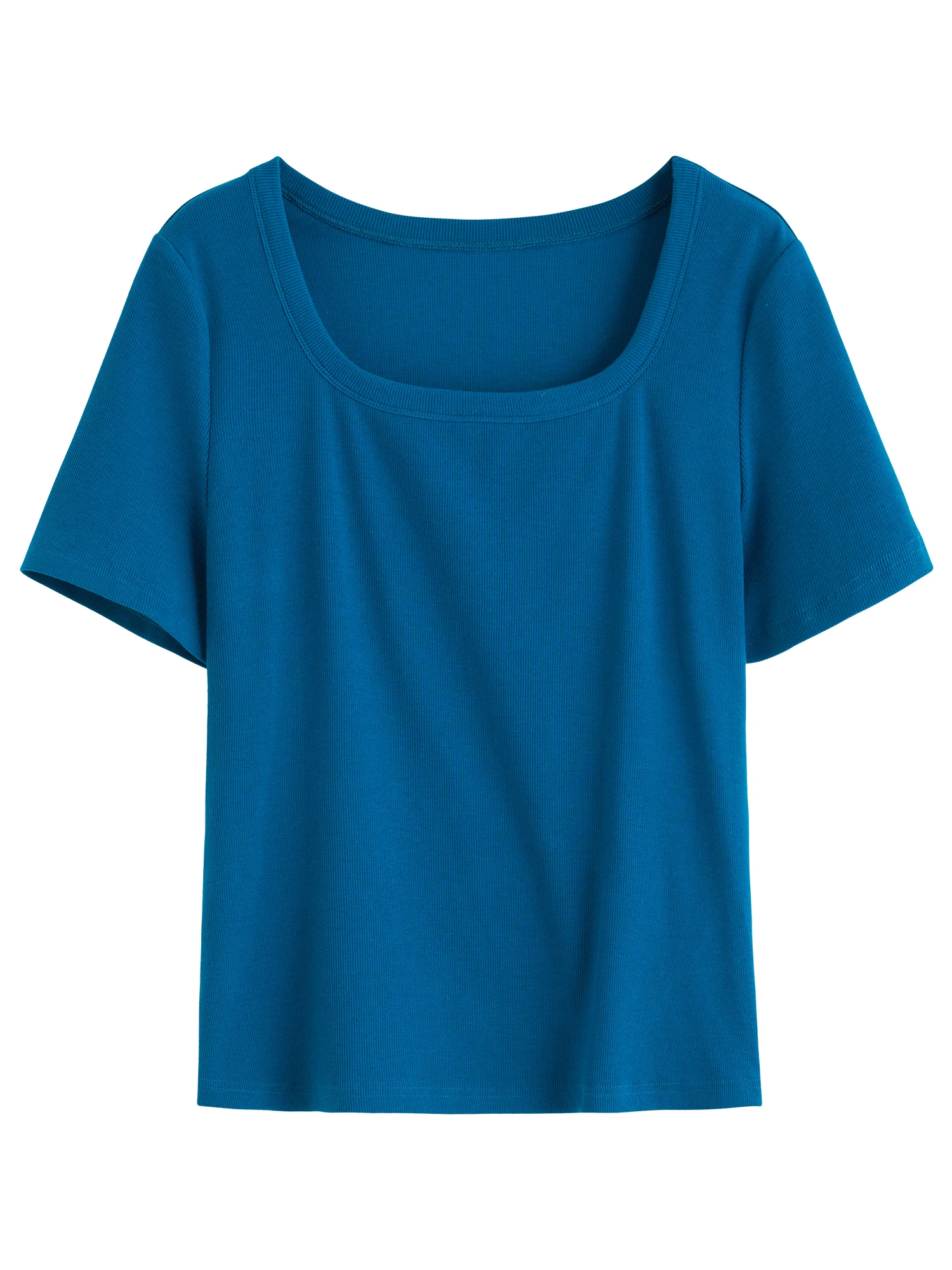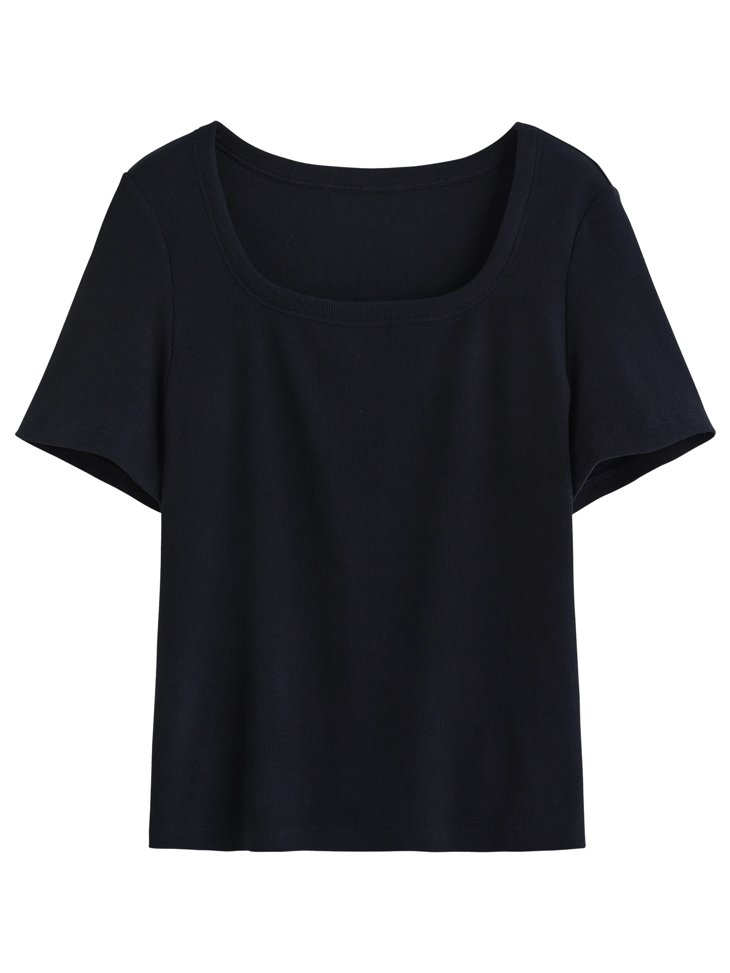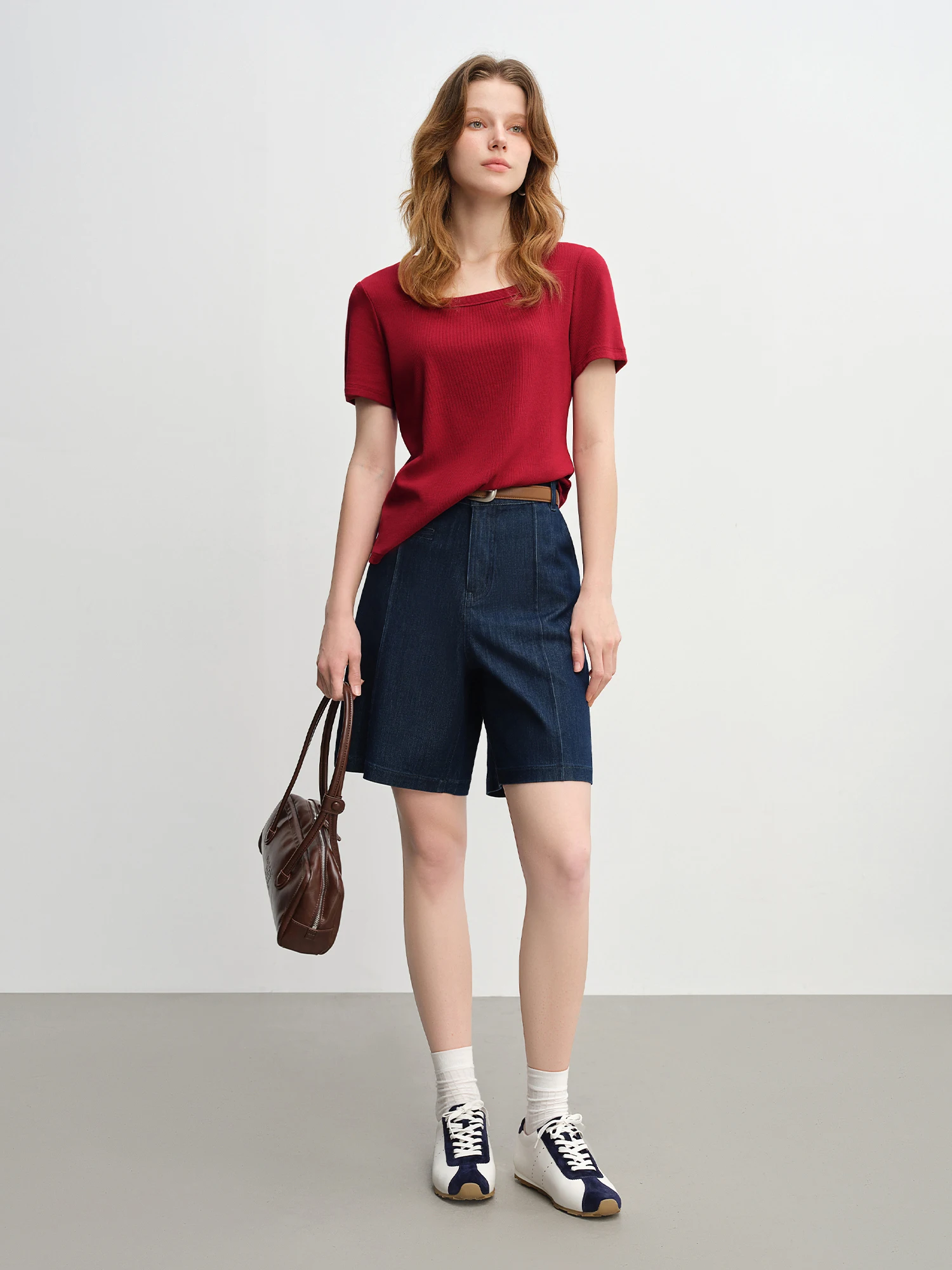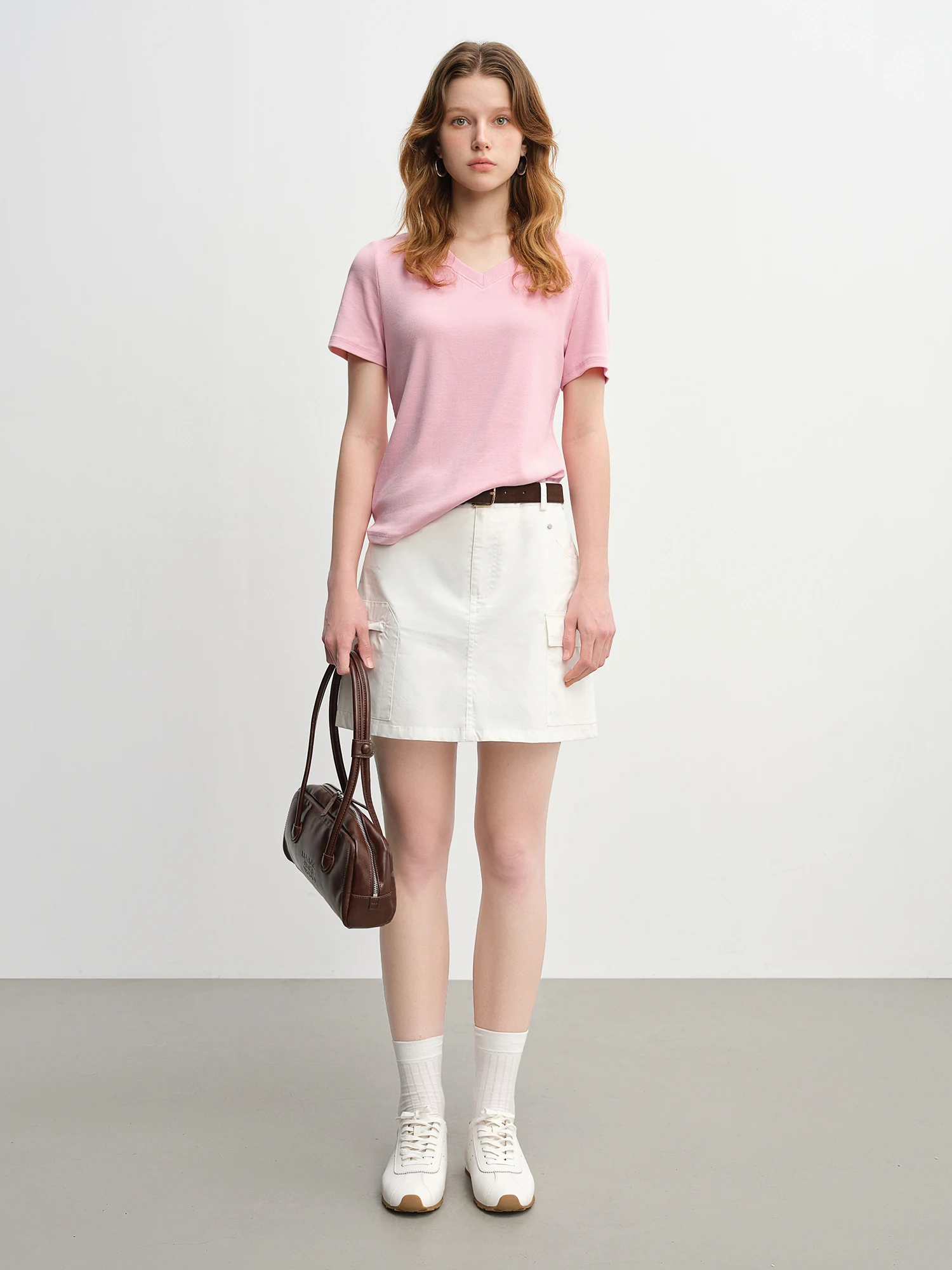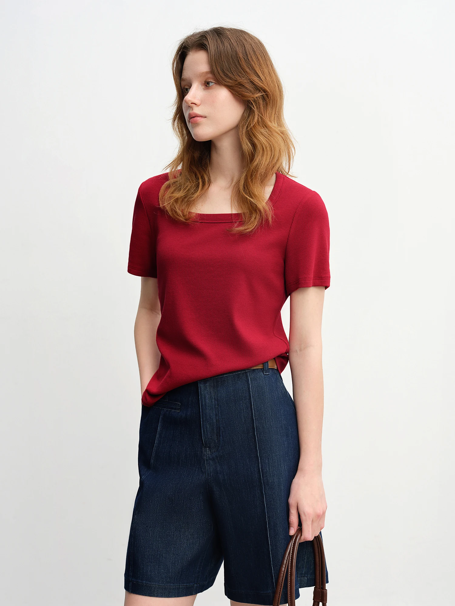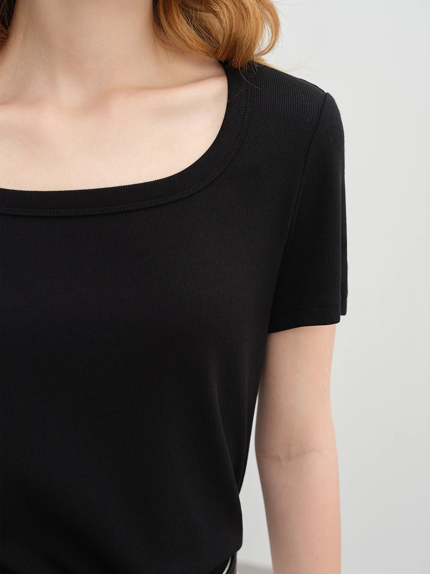 DUSHU Women High-Stretch Structured Shoulder V/U Neck Tee 2025 Summer Casual T-Shirt Elastic Cotton Y2K Fashion New Arrival