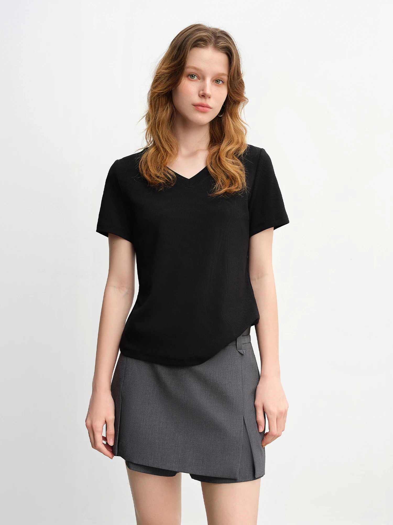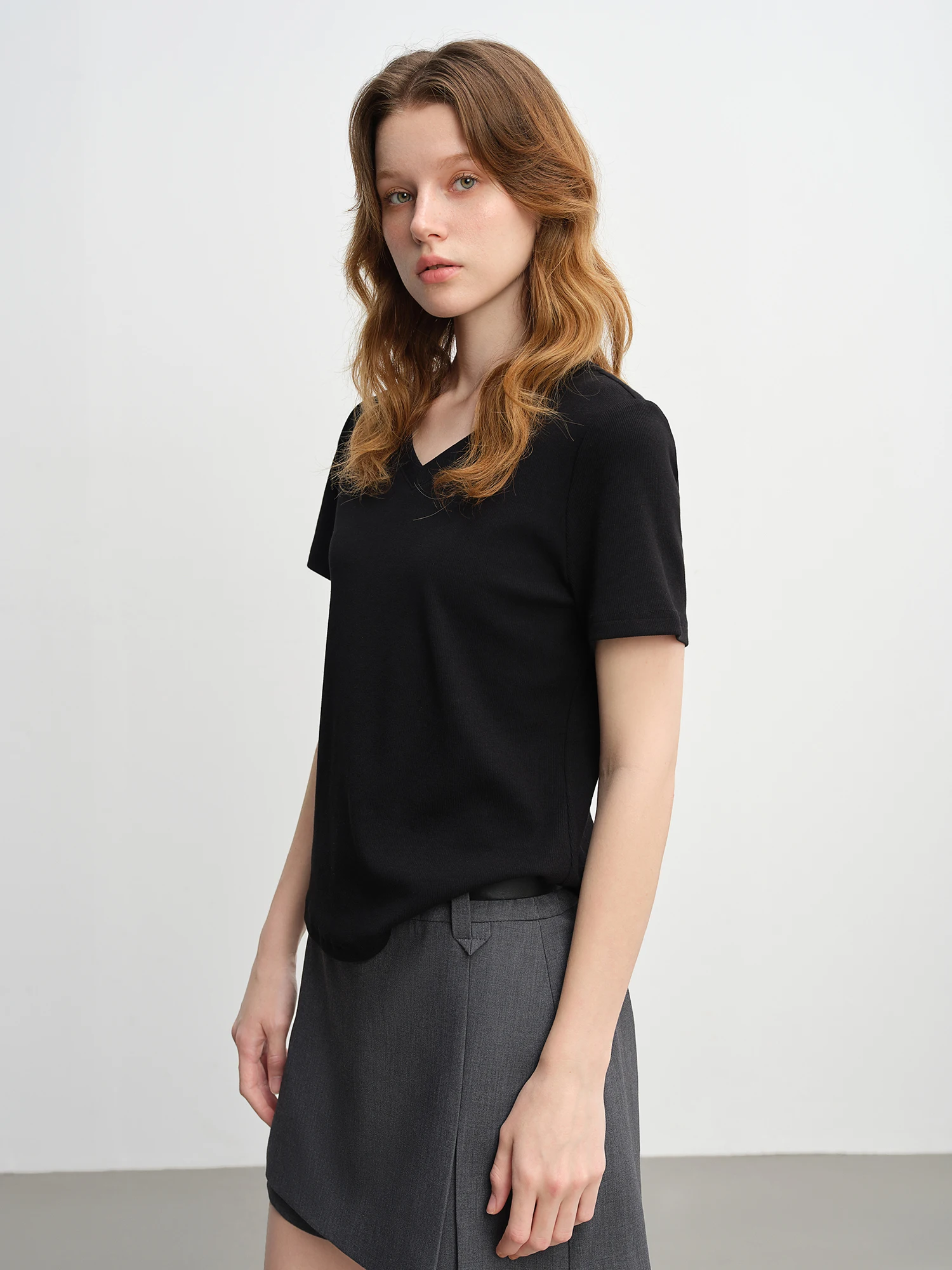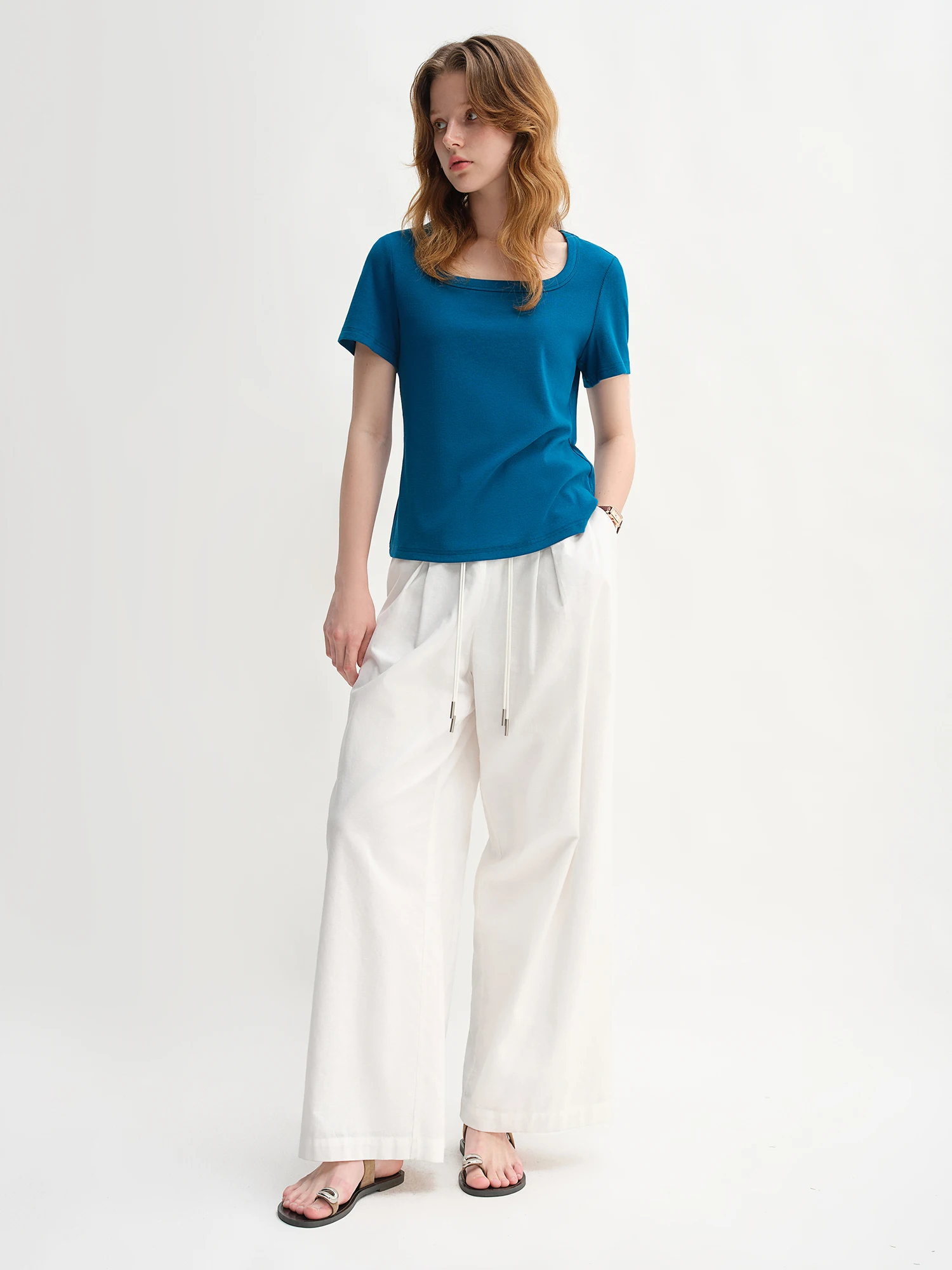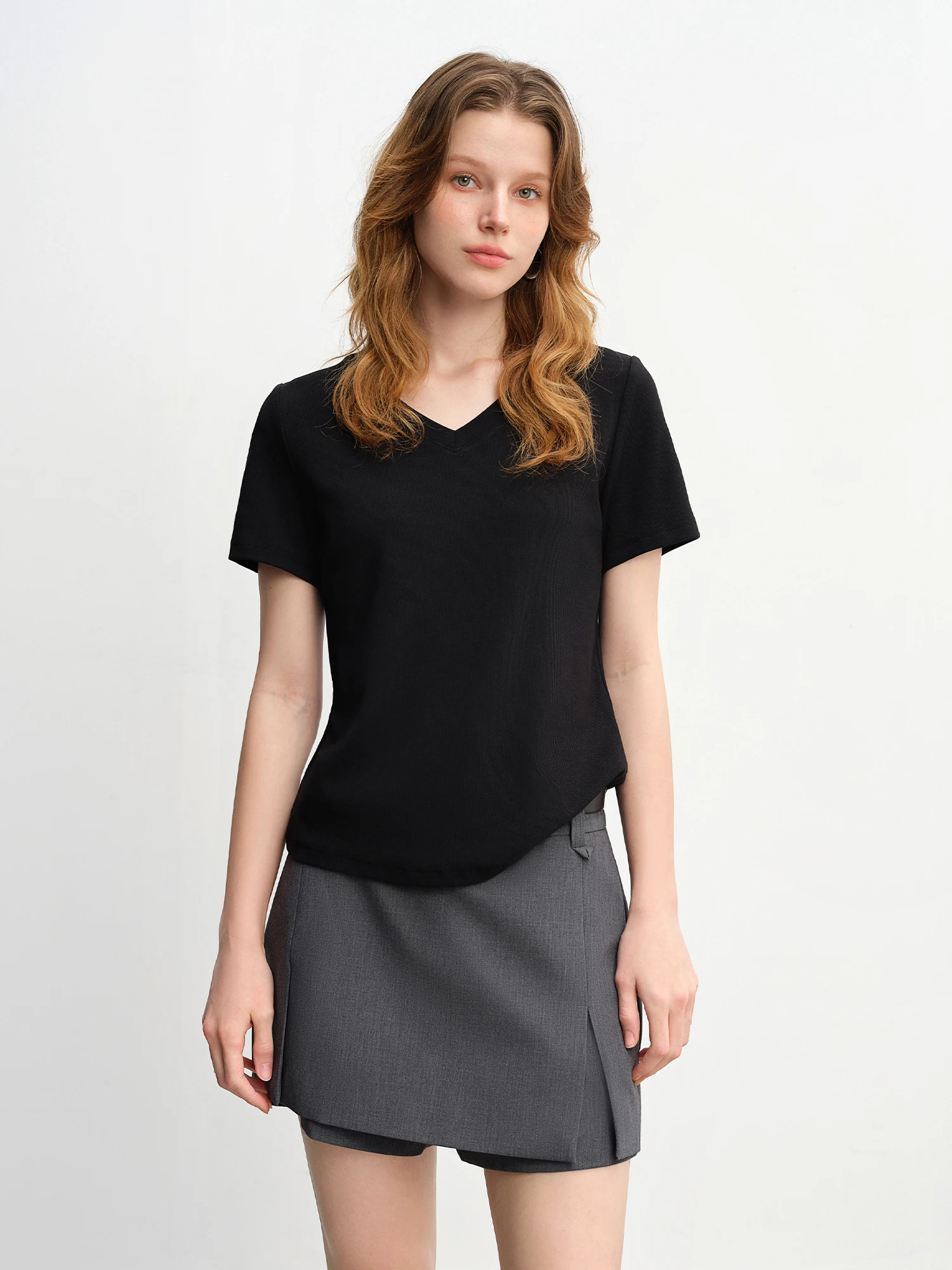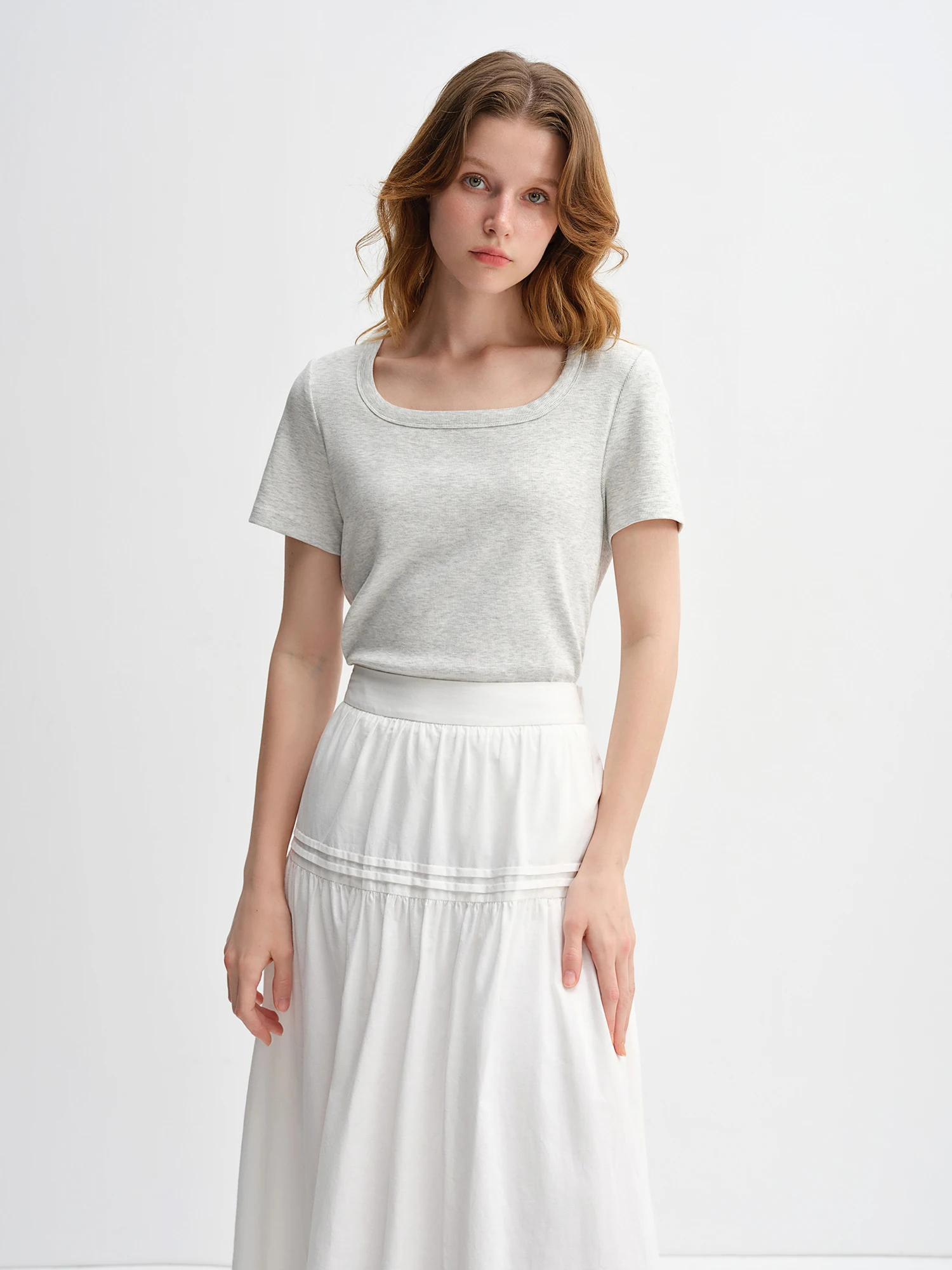 DUSHU Women High-Stretch Structured Shoulder V/U Neck Tee 2025 Summer Casual T-Shirt Elastic Cotton Y2K Fashion New Arrival