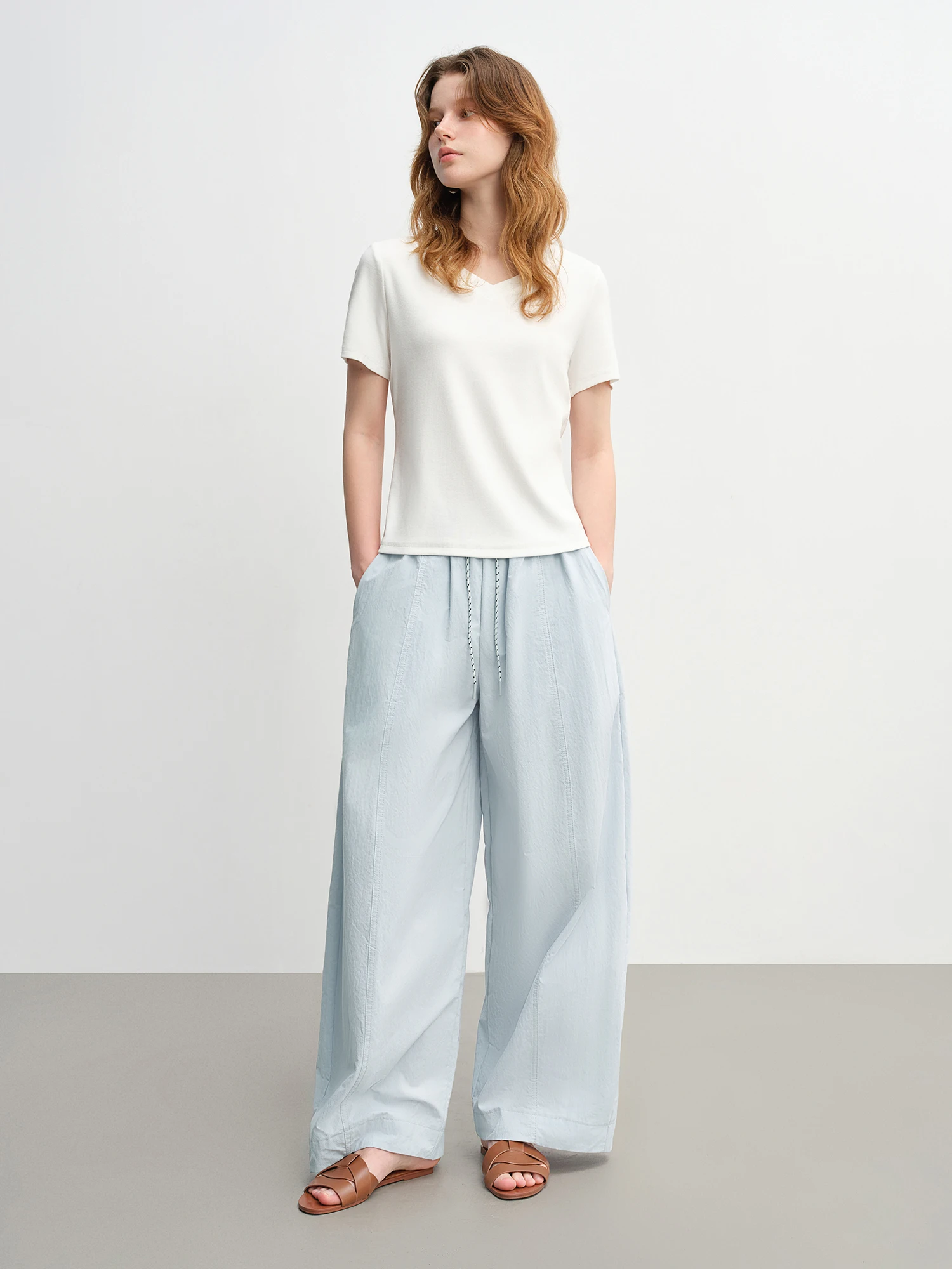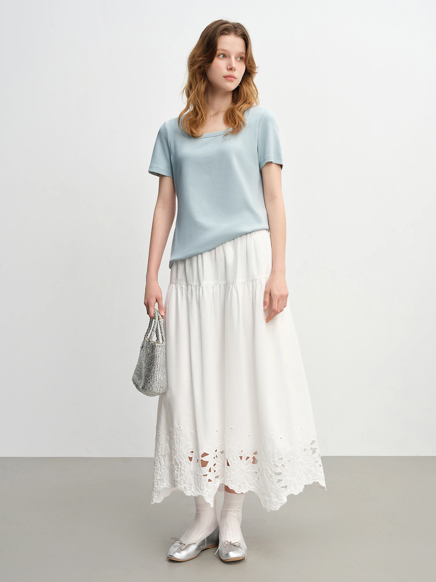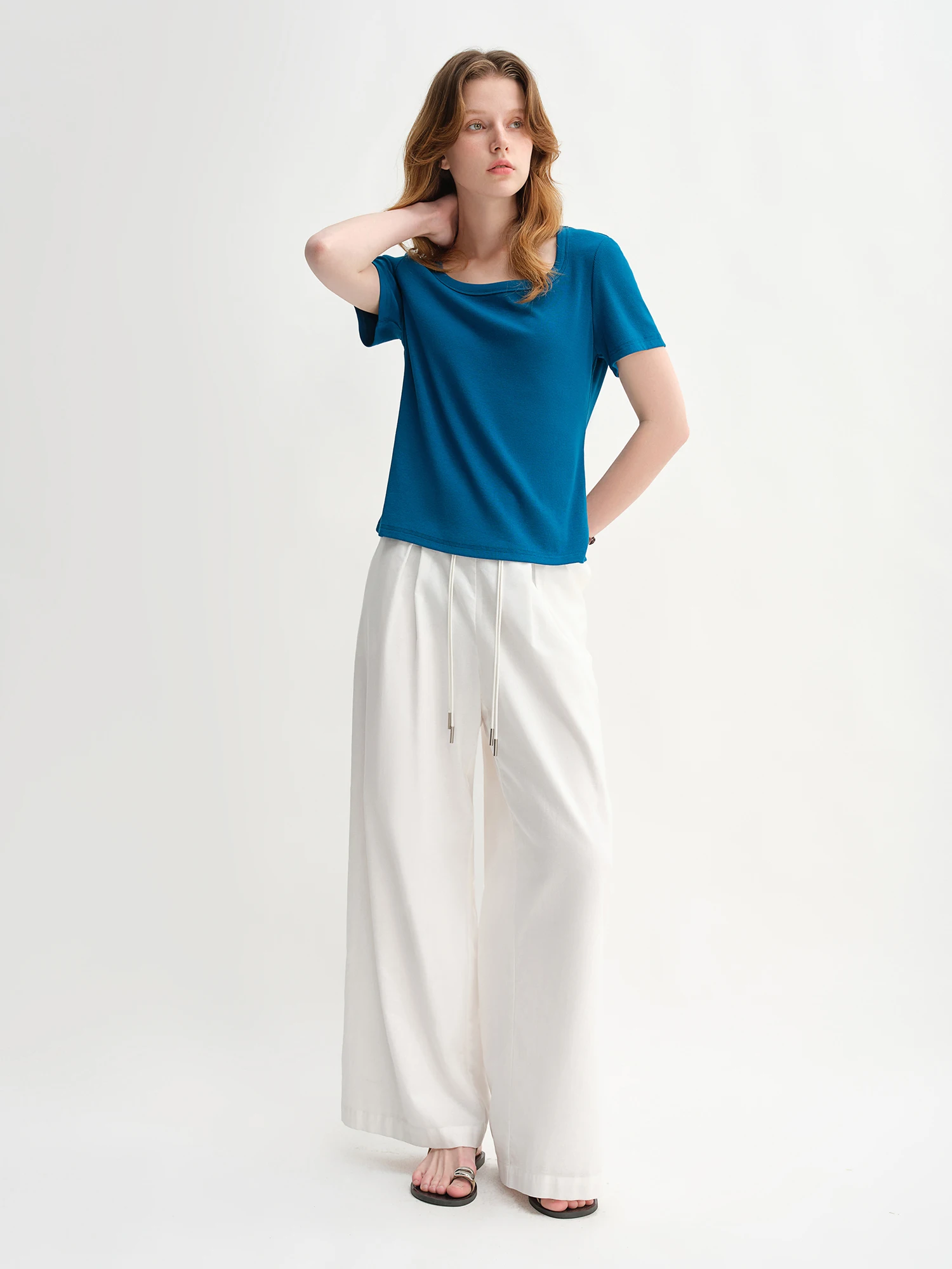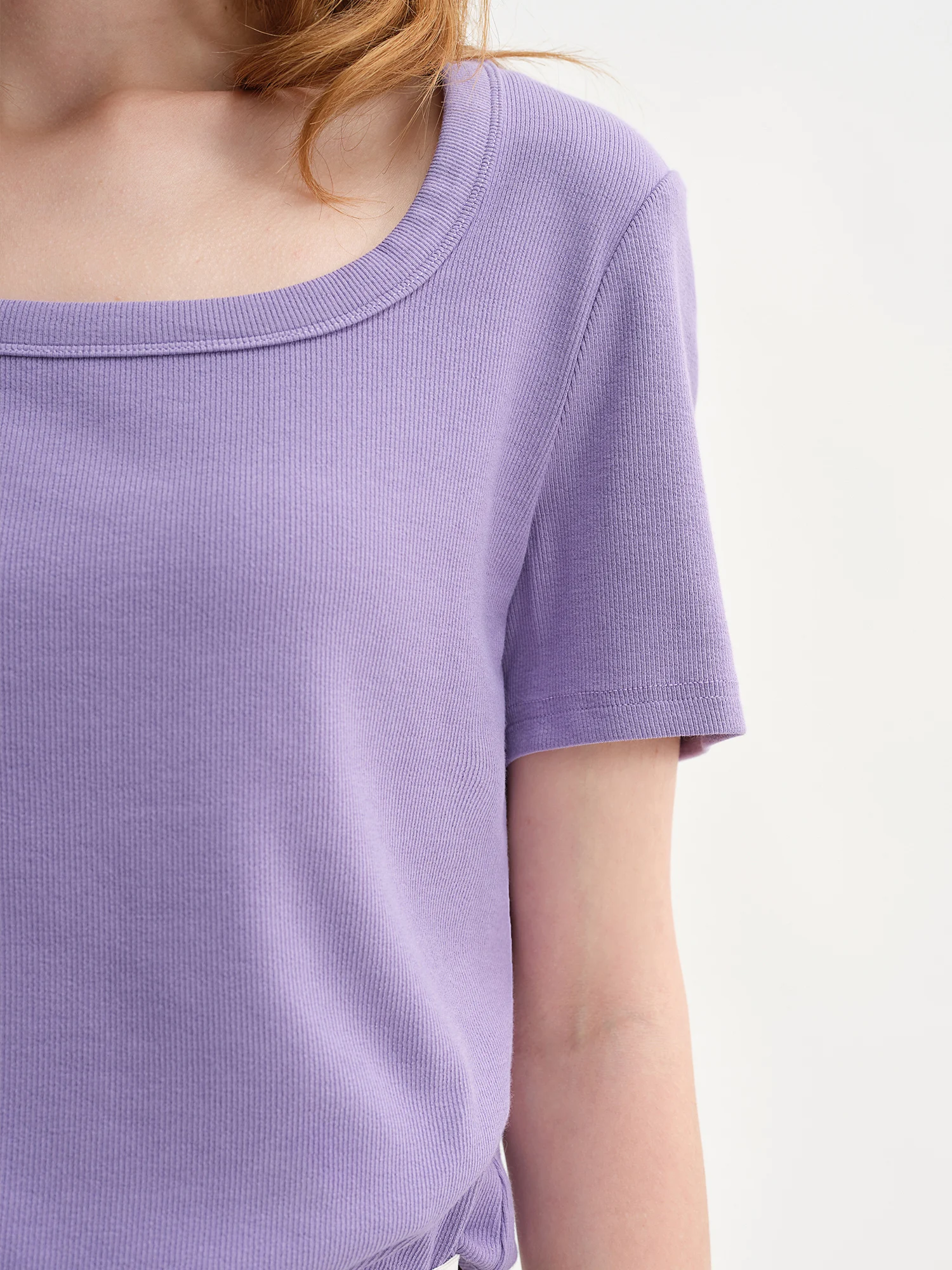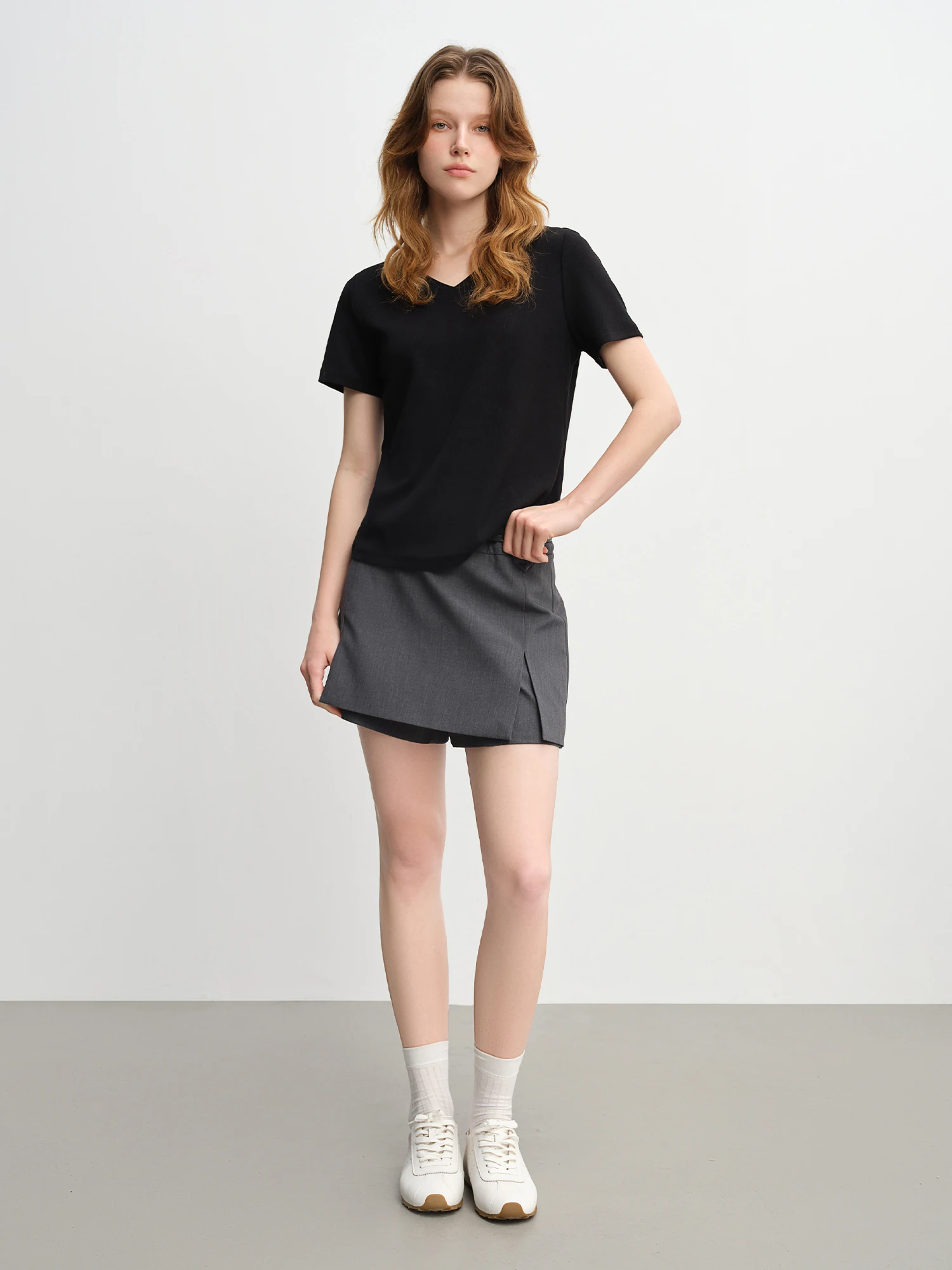 DUSHU Women High-Stretch Structured Shoulder V/U Neck Tee 2025 Summer Casual T-Shirt Elastic Cotton Y2K Fashion New Arrival