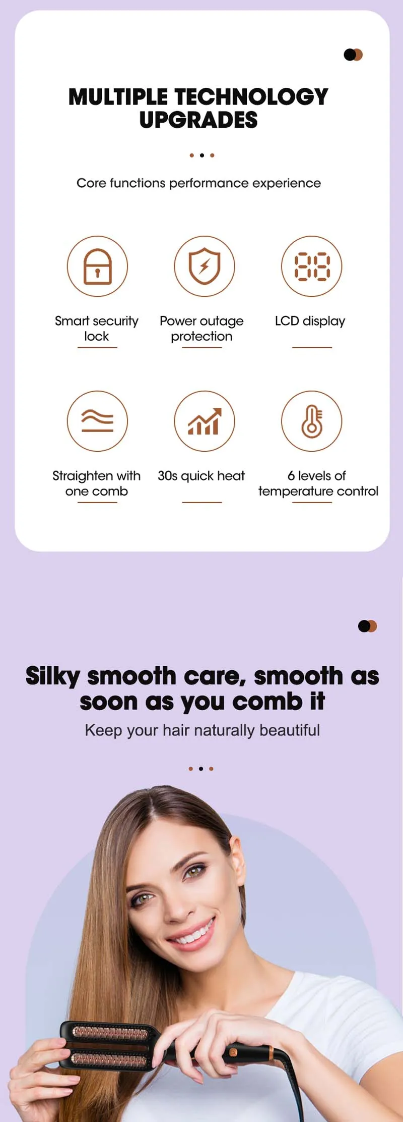 【Adjustable 6 Temp Settings】To cater to the diversity of hair types, the hair straightening brush is equipped with 6 adjustable heat settings, and reach optimal temperature within a short time, this hair brush straightener not only helps you achieve the desired hairstyle effortlessly, but also saves you valuable time.
