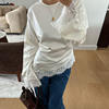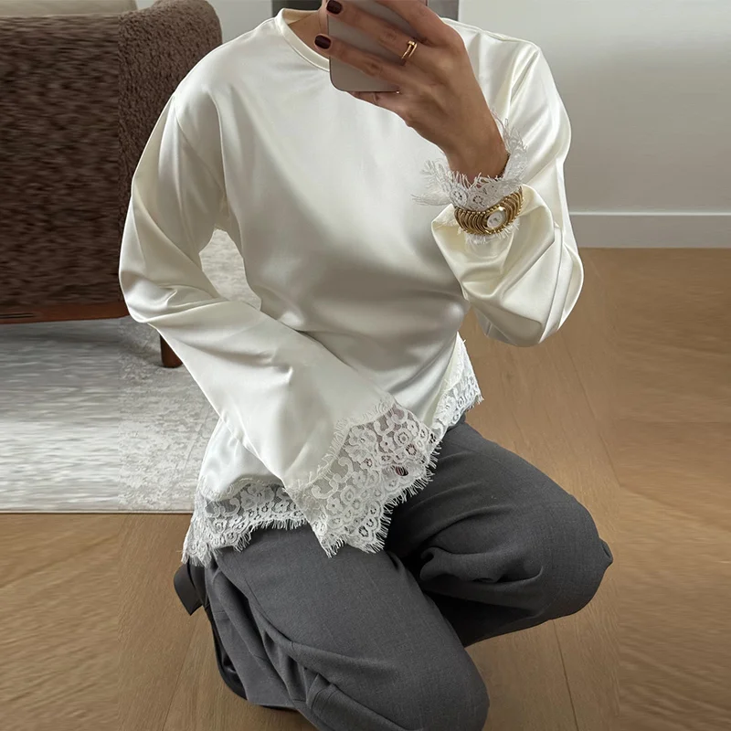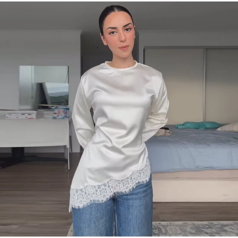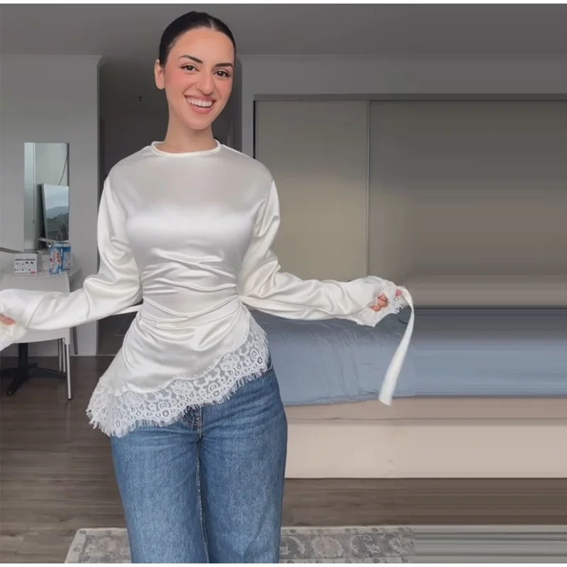 Elegant Satin Women’s Tops Fashion Lace Patchwork Dip Hem Long Sleeve Female Blouse 2026 Spring Summer O-neck Pleated Lady Tops