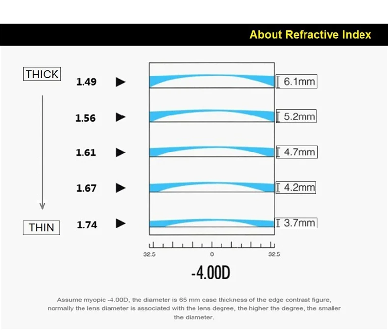 (The higher the refractive index of the lens, the thinner the lens, and the more comfortable it is to wear)
