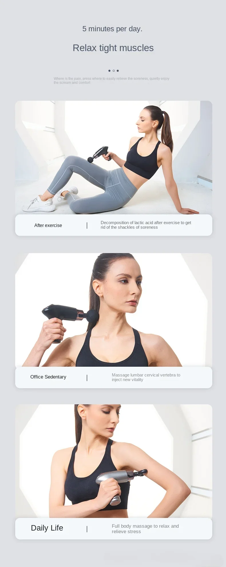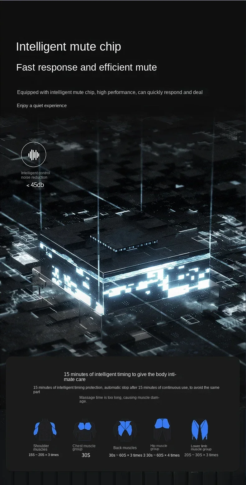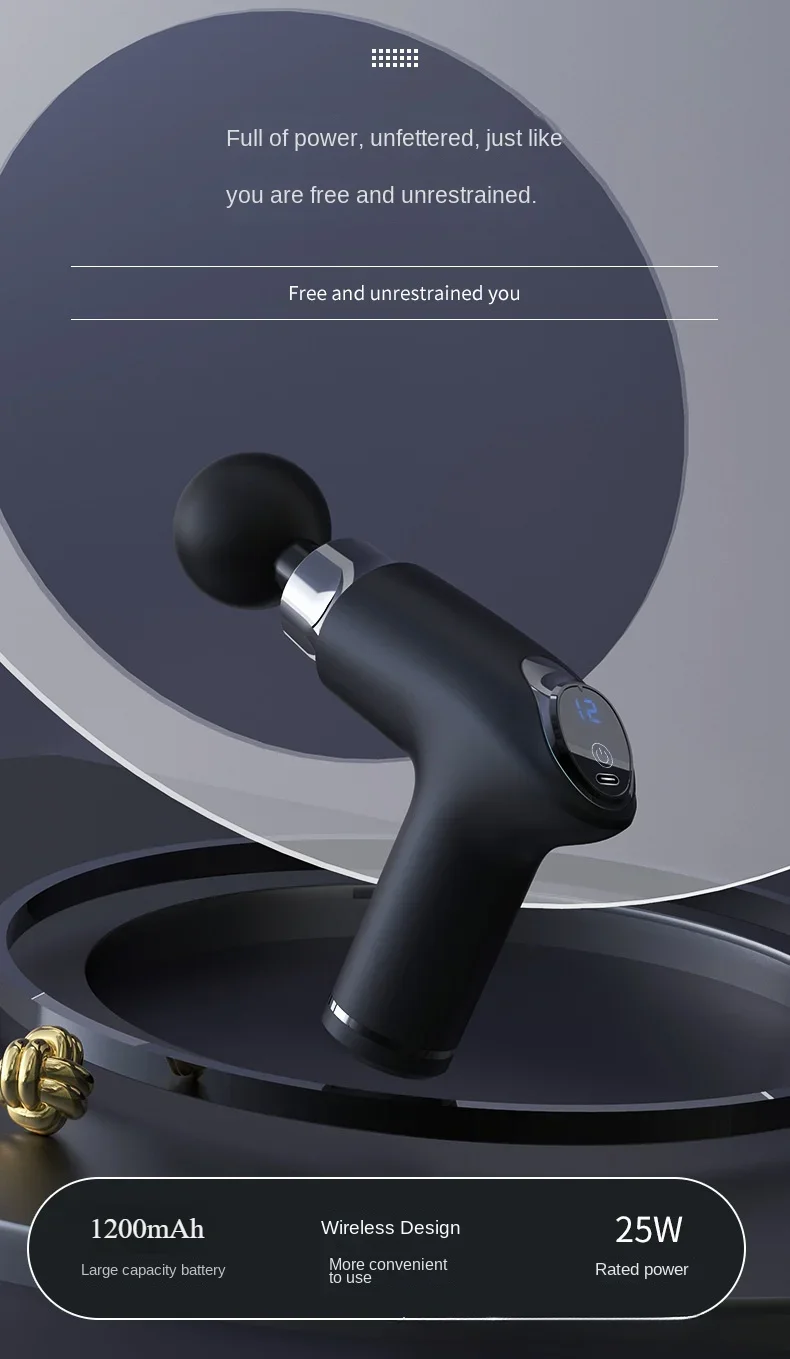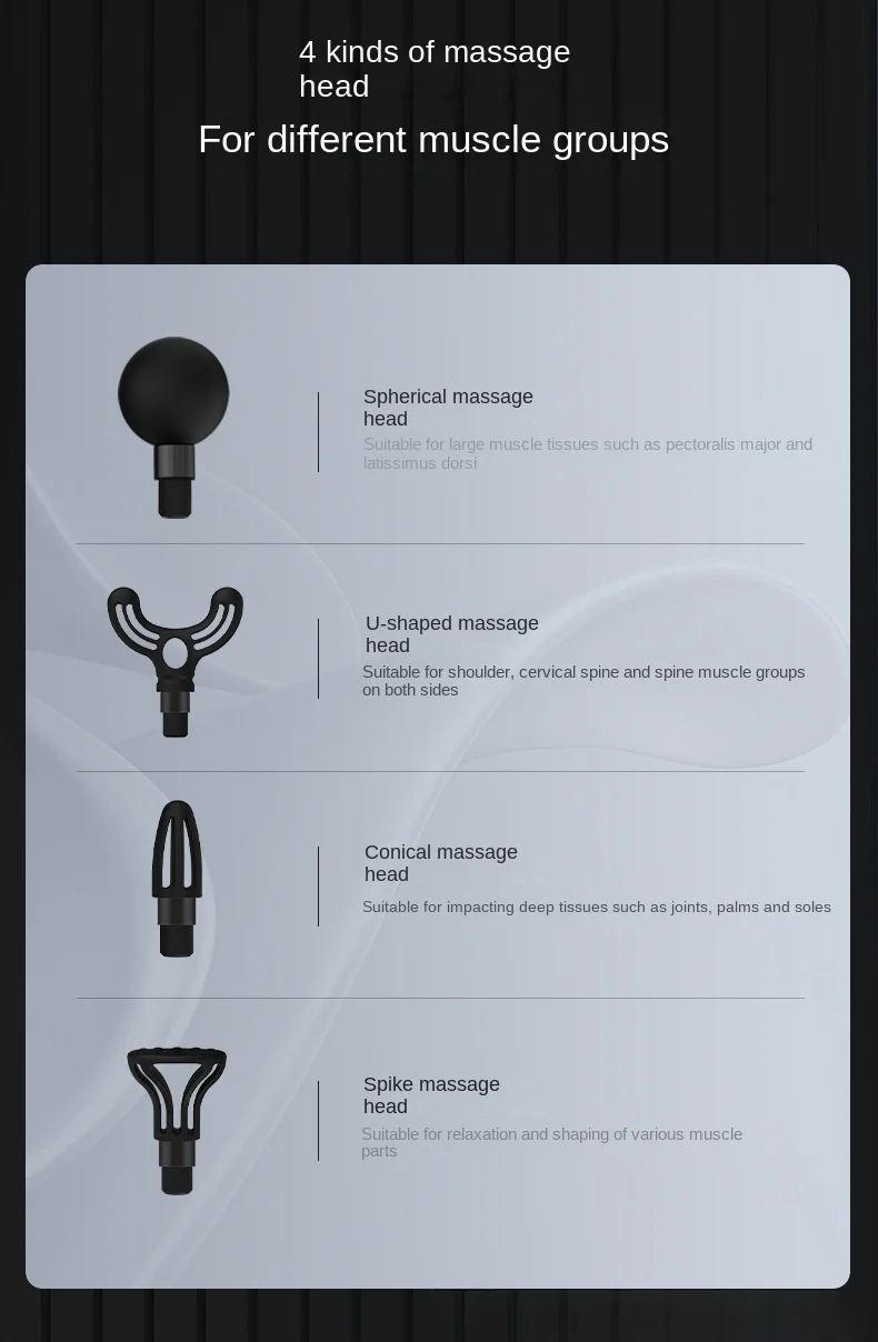 Equipped with a powerful brushless motor, it can achieve high-frequency vibration and reach deep fascia, helping to decompose lactic acid and eliminate muscle fatigue. It only takes 5 minutes a day to relax and tighten muscles. And it uses an intelligent noise reduction chip, which is quiet and does not disturb people. Equipped with 4 types of massage heads, the spherical massage head is suitable for large muscle tissues such as pectoralis major and latissimus dorsi; The U-shaped massage head can be used for the neck, spine, and muscular groups; There are also two other types of massage heads that can cater to different muscle groups and meet diverse massage needs. At the same time, it has a 1800mAh large capacity battery, wireless design, easy to use, with a rated power of 25W, strong power, and excellent endurance. Whether it is after exercise, sitting for a long time in the office, or in daily life, it can relieve muscle soreness, release stress, and rejuvenate you.