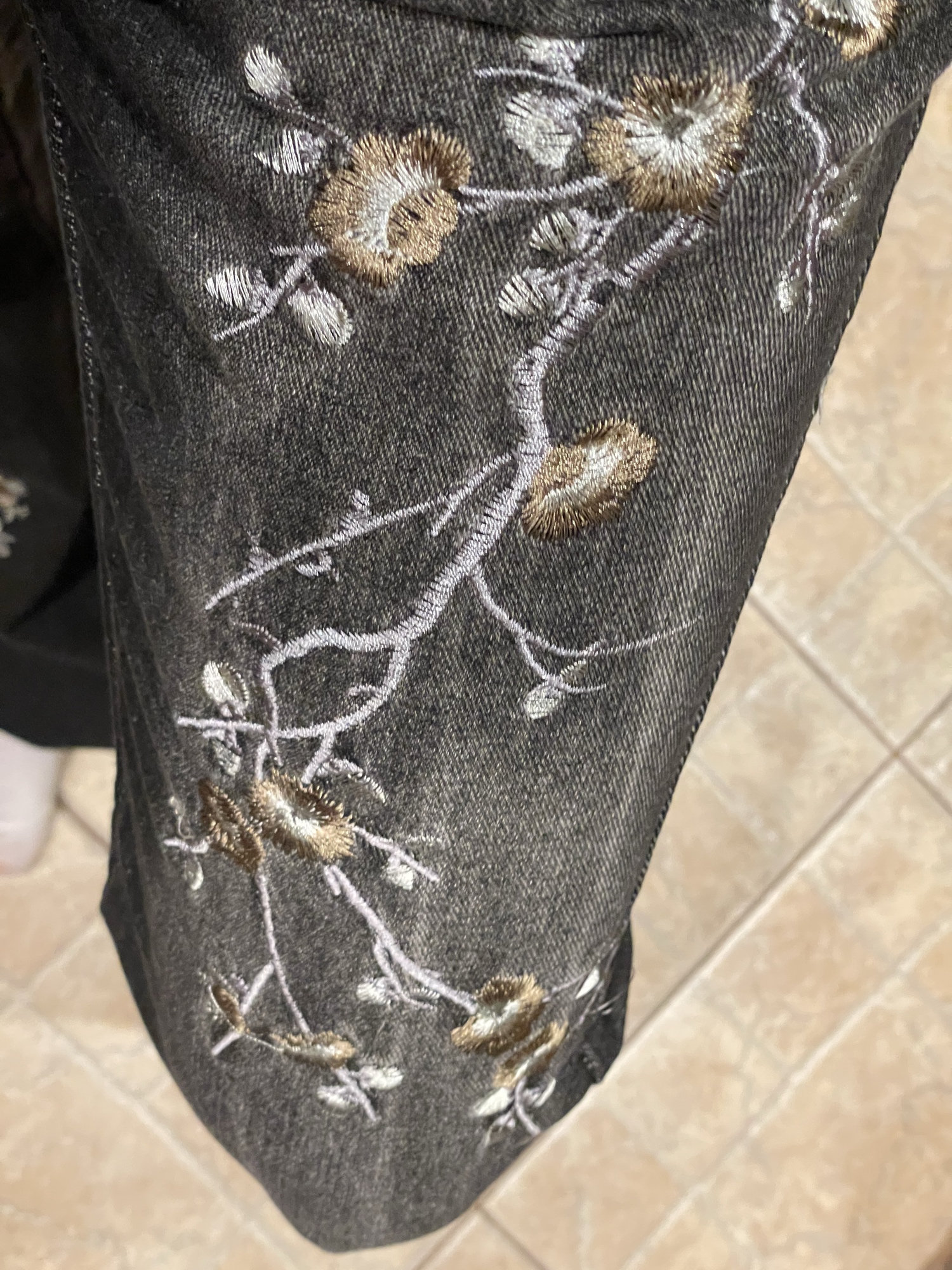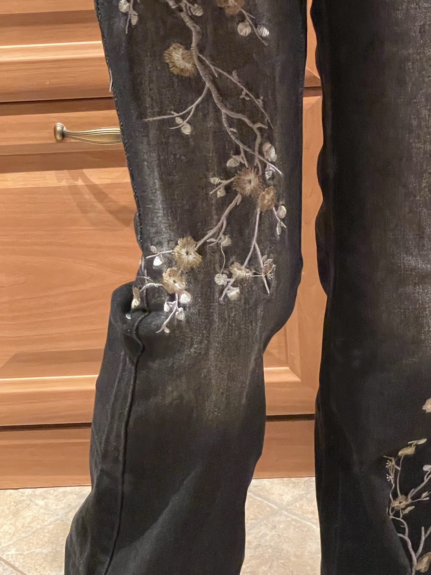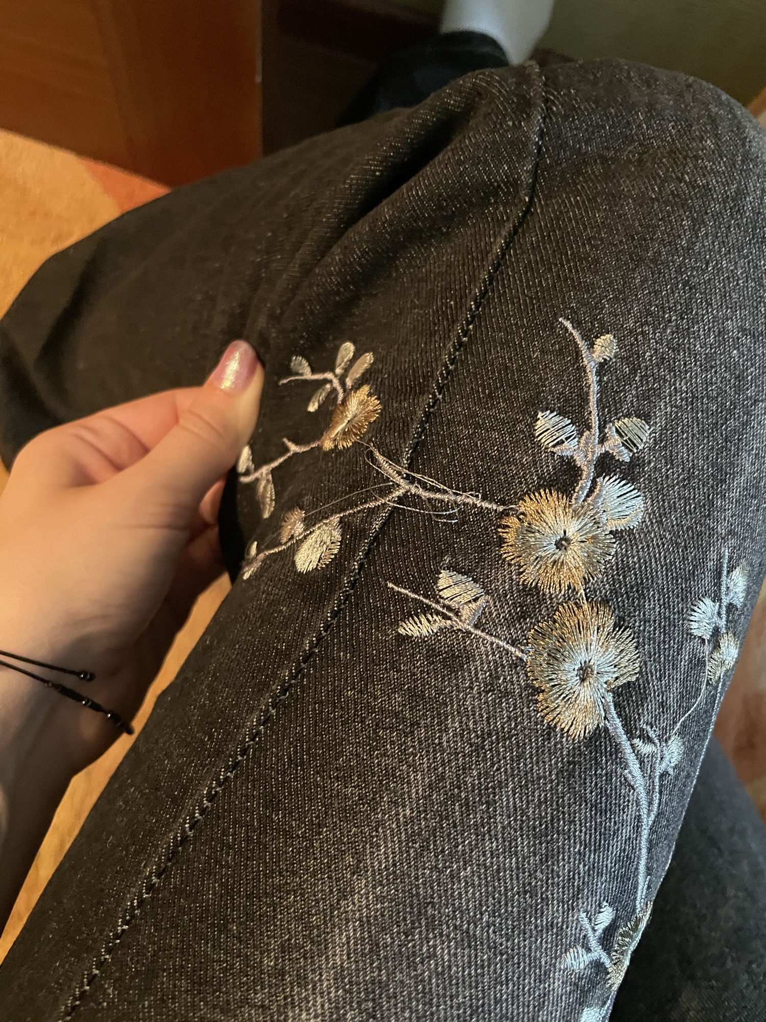 Несмотря на мой низкий рост сели хорошо (рост 154см, талия 60см), клеш выглядит красиво, что для моего роста большая редкость!! Вышивка очень качественная. Не понравились только белые полоски на левой штанине и торчащие в некоторых местах рисунка нитки. Но связалась с продавцом и мне одобрили частичную компенсацию. Однозначно рекомендую!☺️