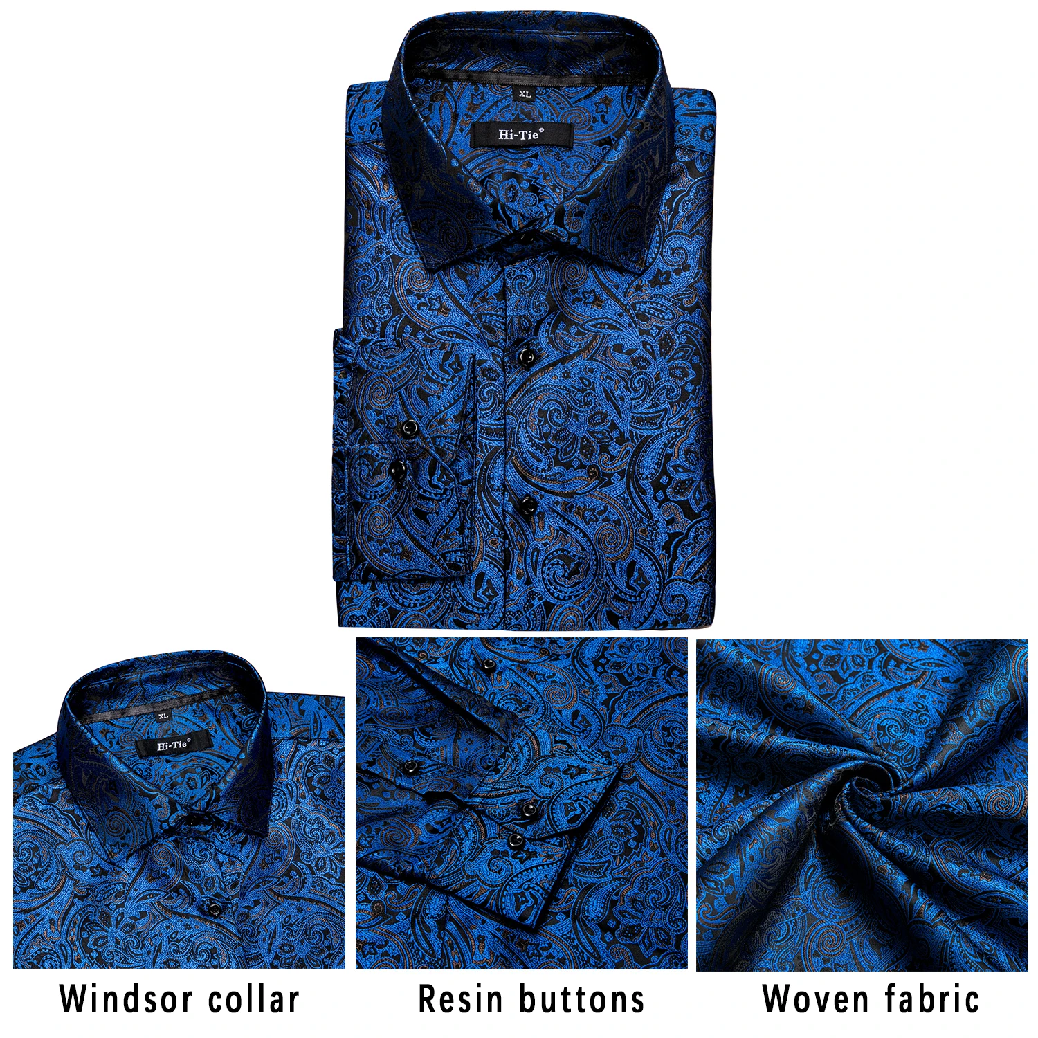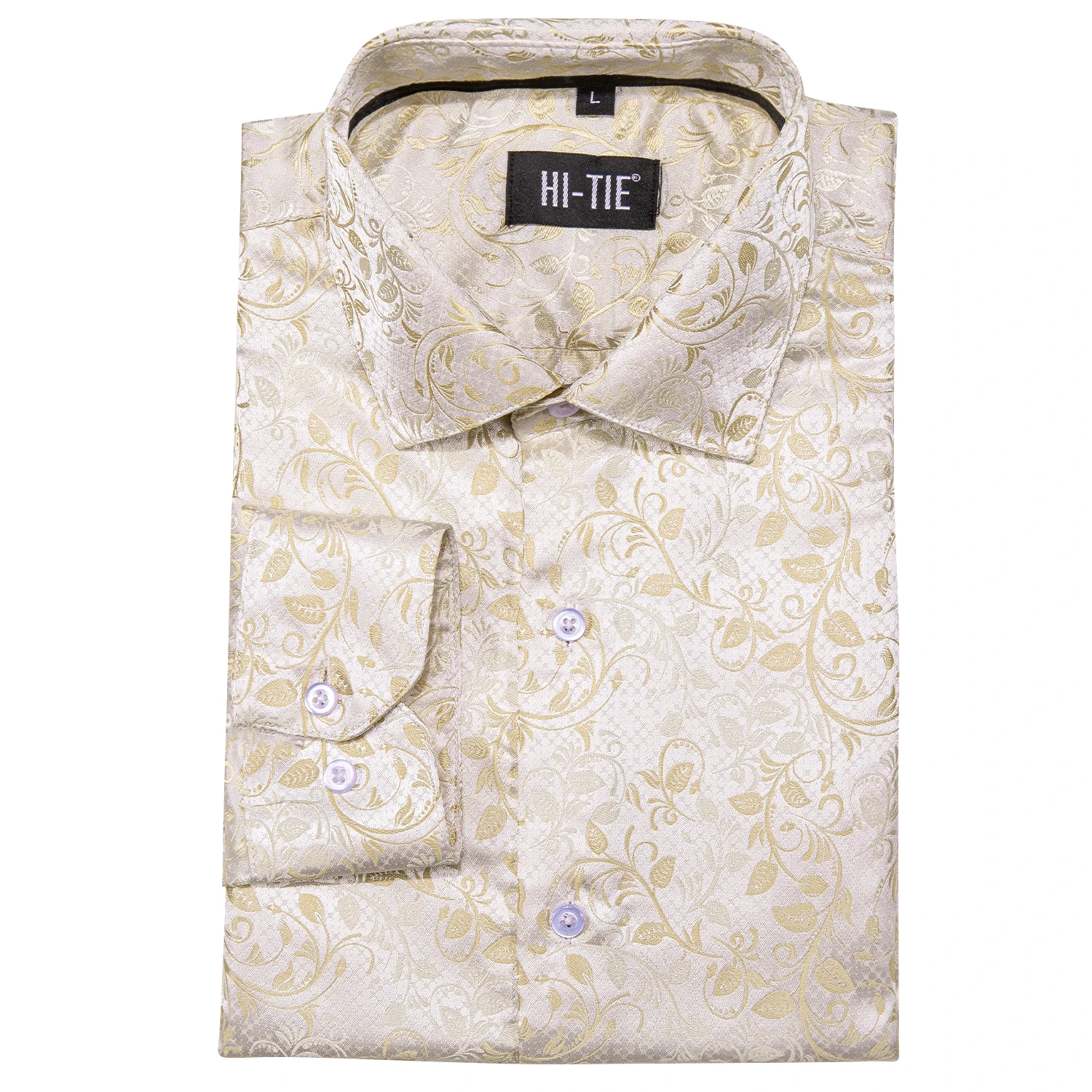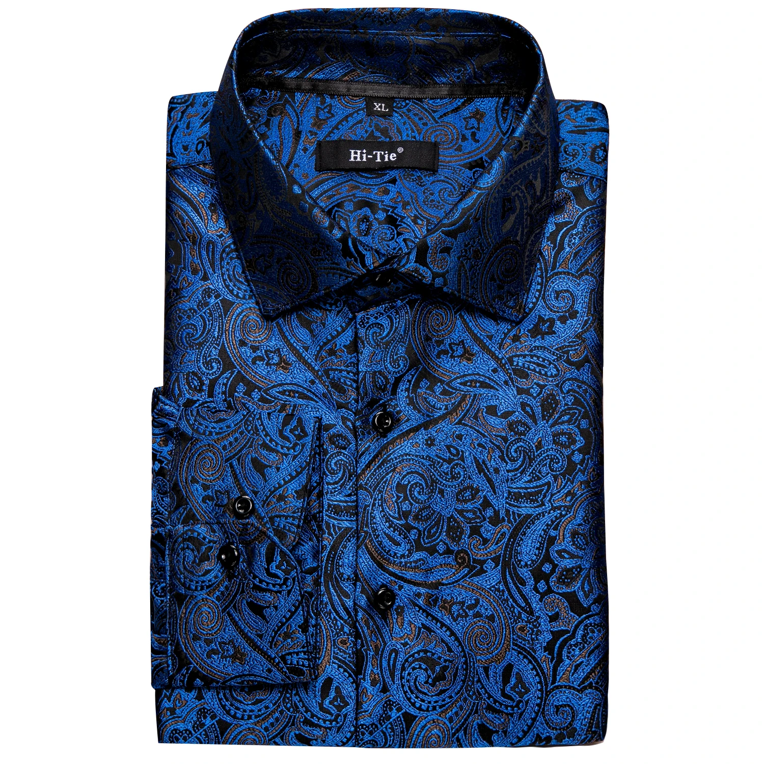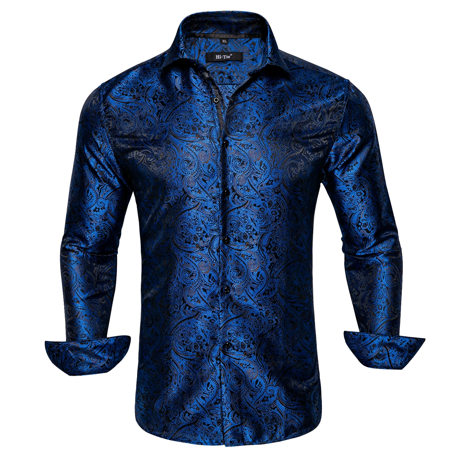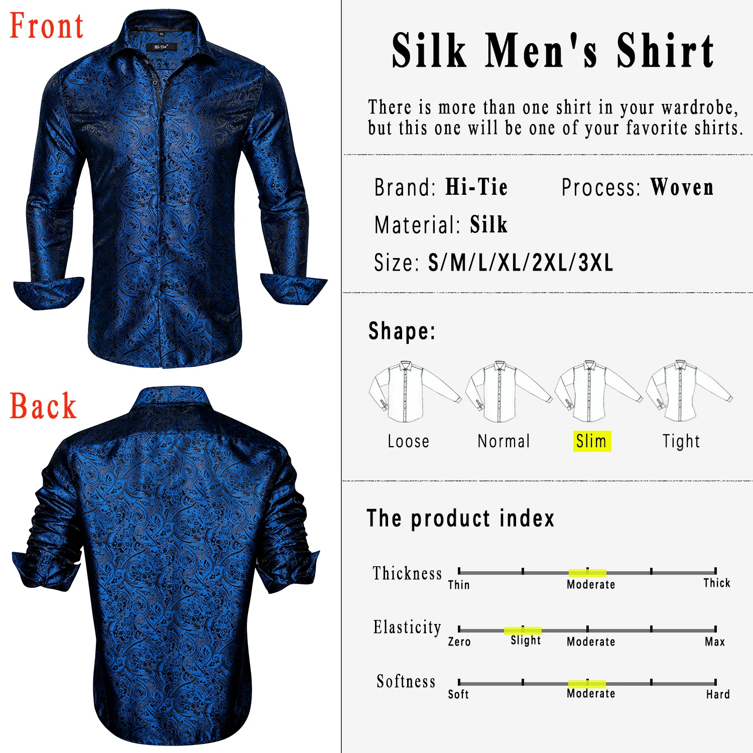 Hi-Tie Silk Mens Shirts Woven Male Outwear Long Sleeve Men Shirt Slim Fit Floral Paisley For Dress Suit Business Formal Casual