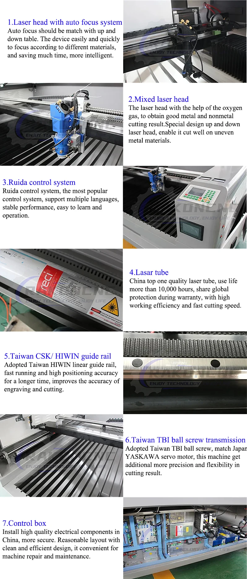 4.CO2 Glass sealed laser tube China famous brand (EFR, Reci,Yongli), good beam mode stability, service timeover 8500~10000 working hours.