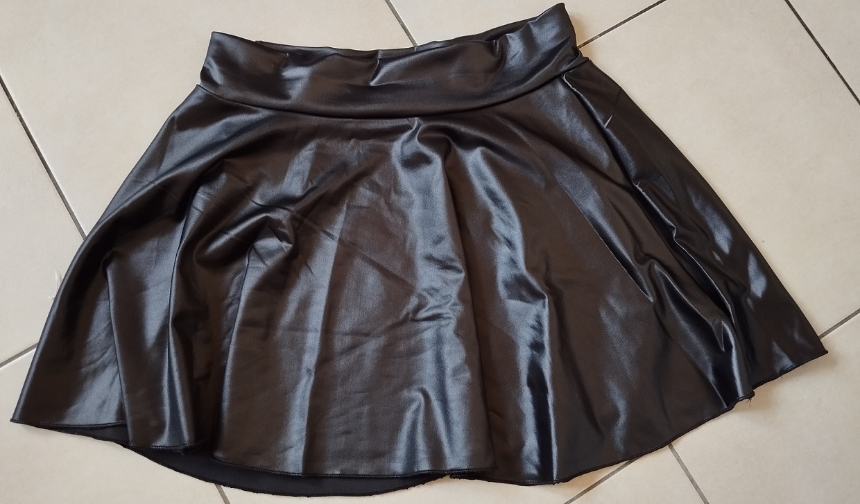 Es muy linda y se ve súper coqueta, la tela es strech, pero no es vinipiel, es tela imitación vinipiel