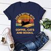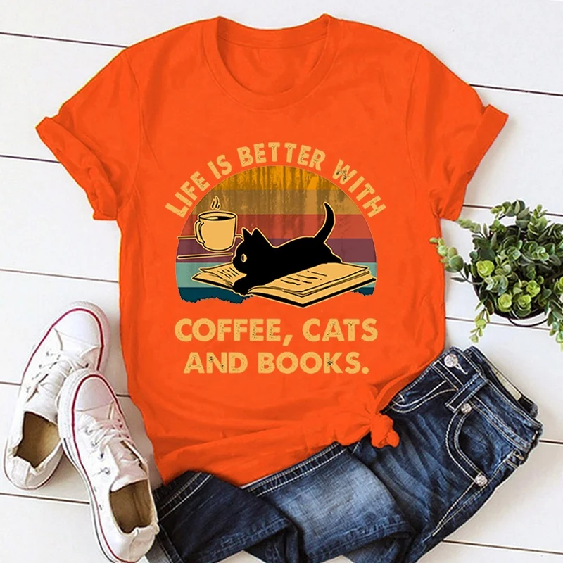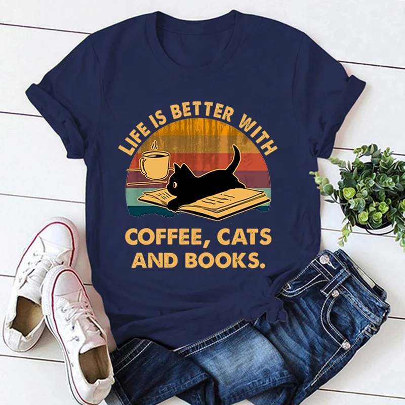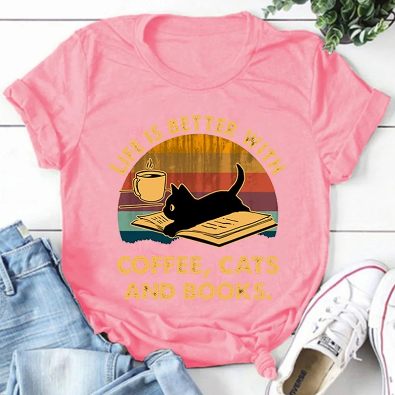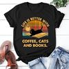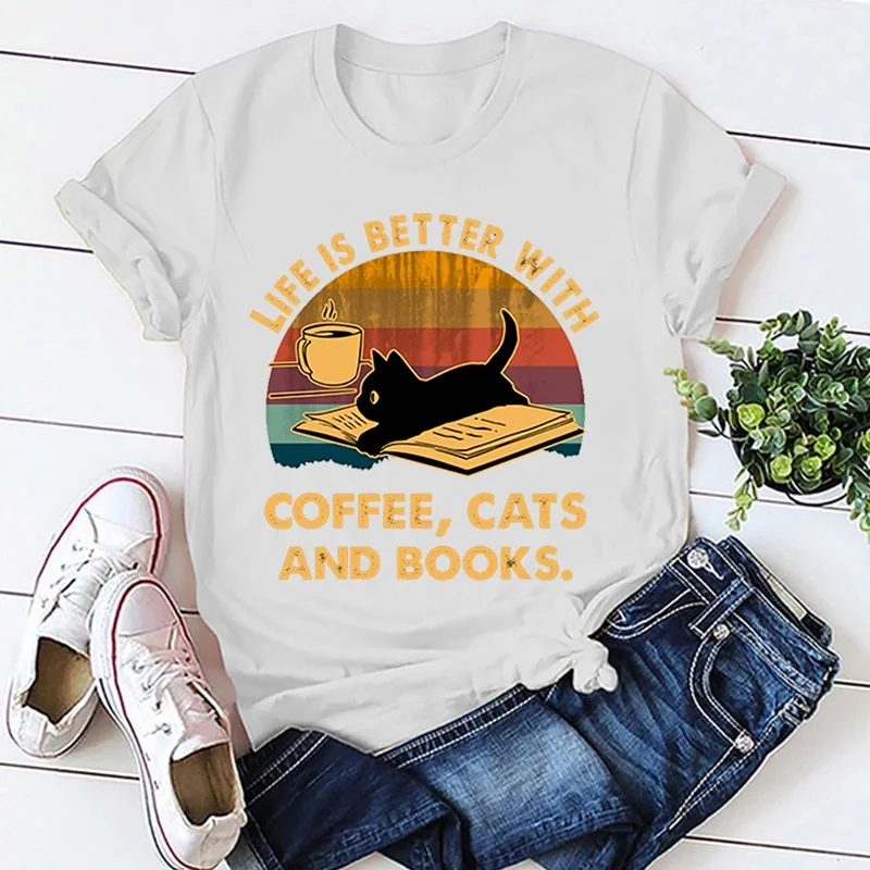 Hot Life Is Better With Coffee Cats And Books Print T-Shirt Loose Short Sleeve Harajuku Casual Tops Women Men T-Shirt