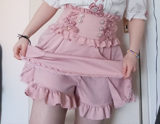 this skirt is so adorable! it also have build in shorts and they are ruffles. and super strenchy I see the buttons i don't wanna loose them they felt a bit loose.