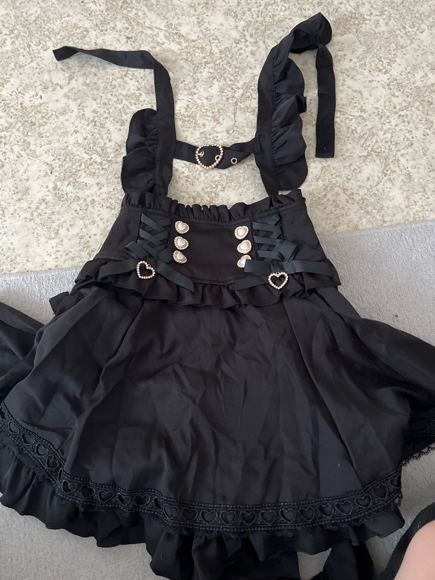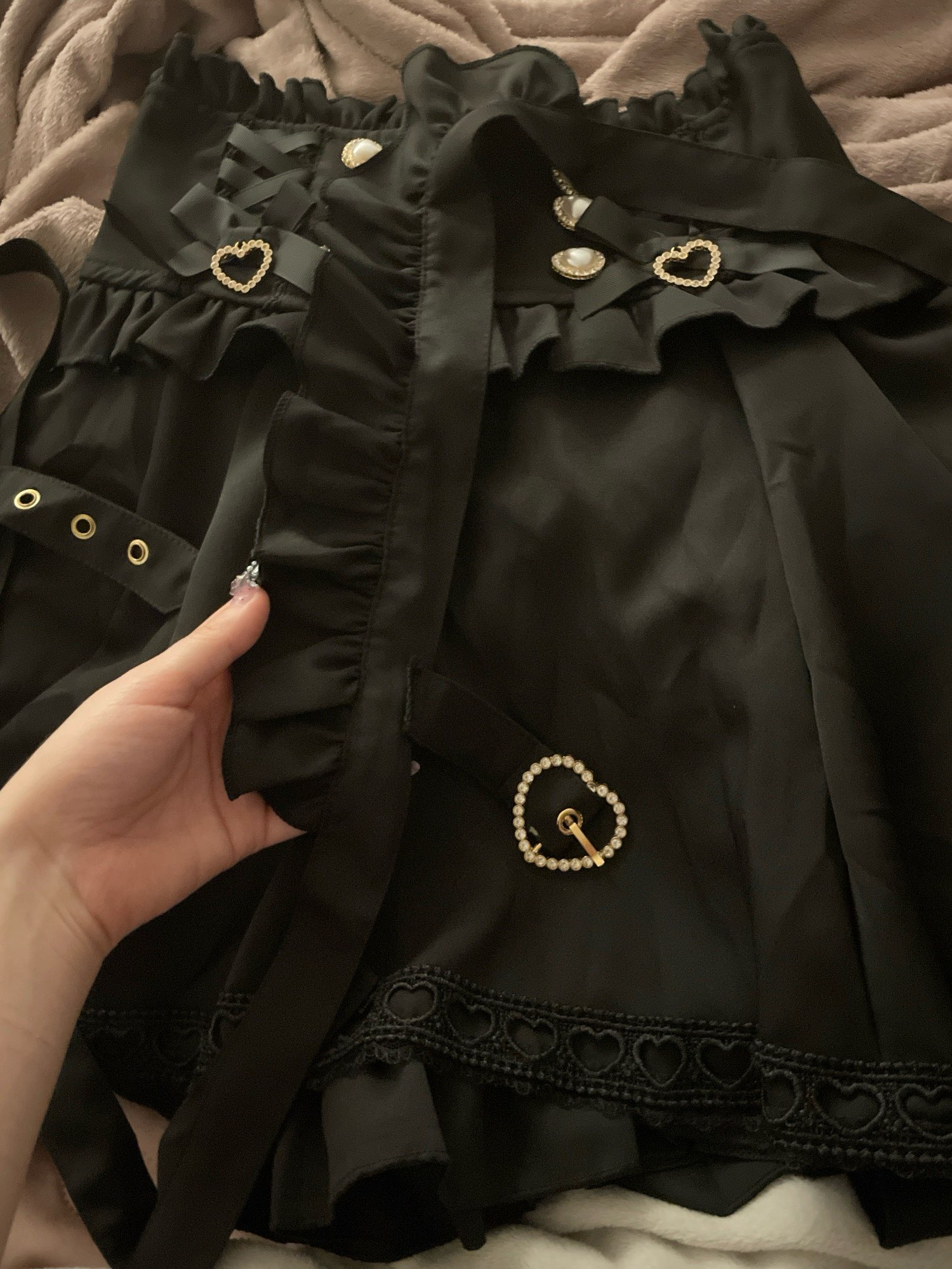 Super pretty skirt!! Detachable suspenders and build in shorts (picture 4). Though you have to remake the ribbon everytime you wanna put it on since you have to undo it if you want to take the skirt off. So going pissing is a bit of a hassle lmao