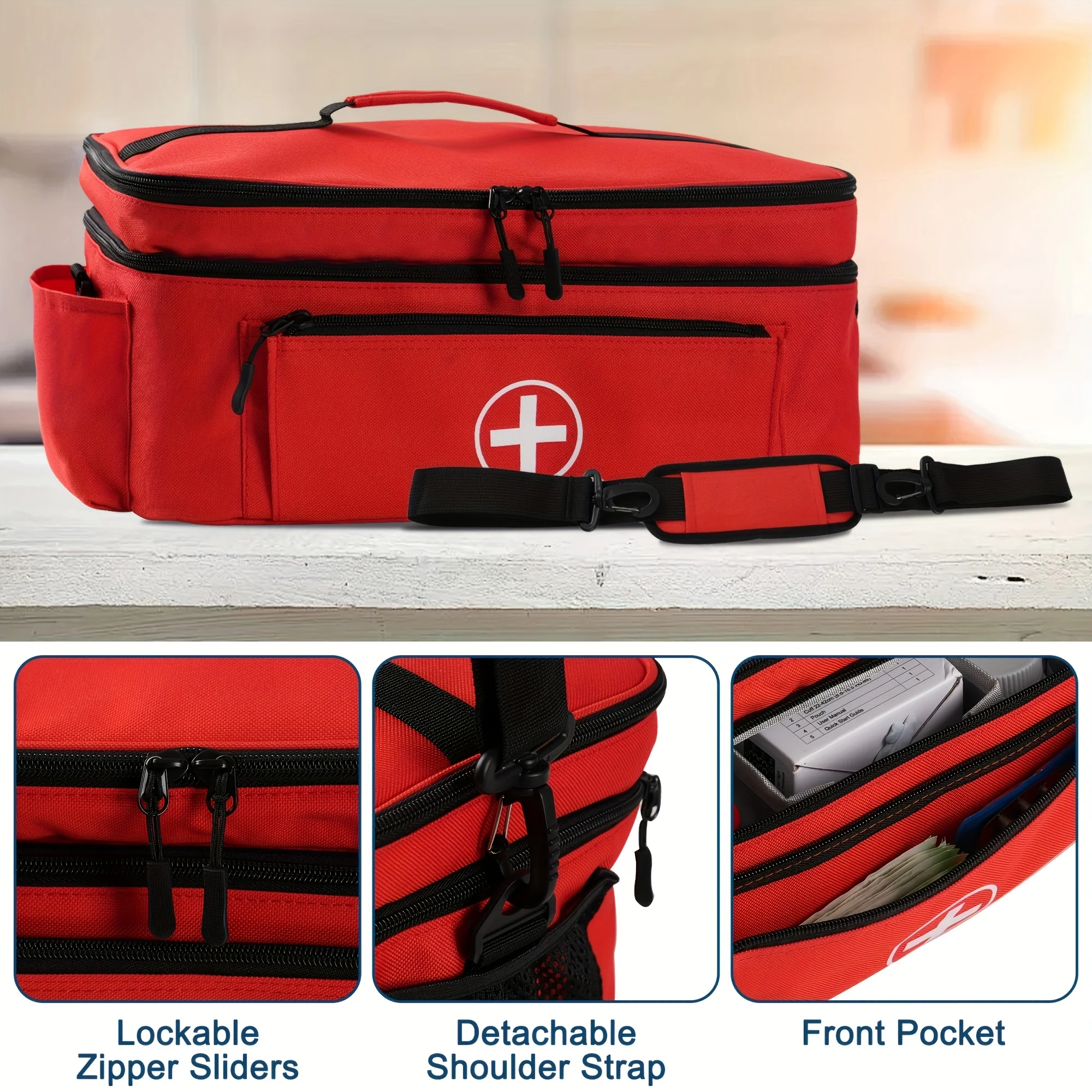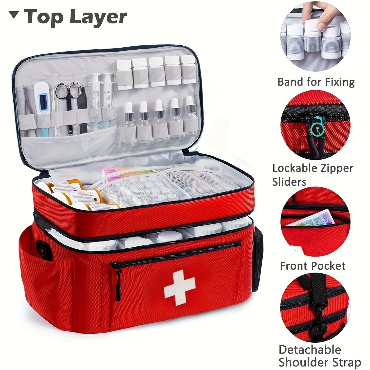 Large capacity travel medicine storage bag, portable emergency kit, double-layered design, front pouch, multiple ways to carry.