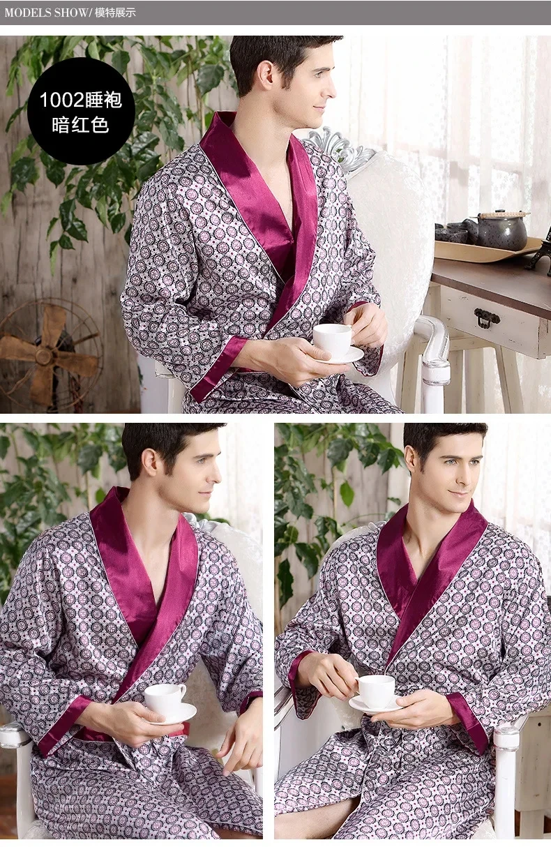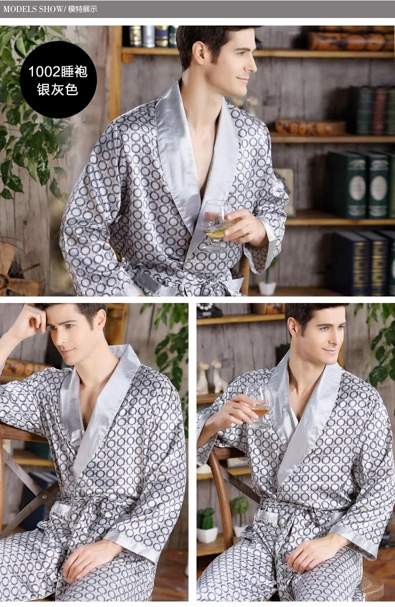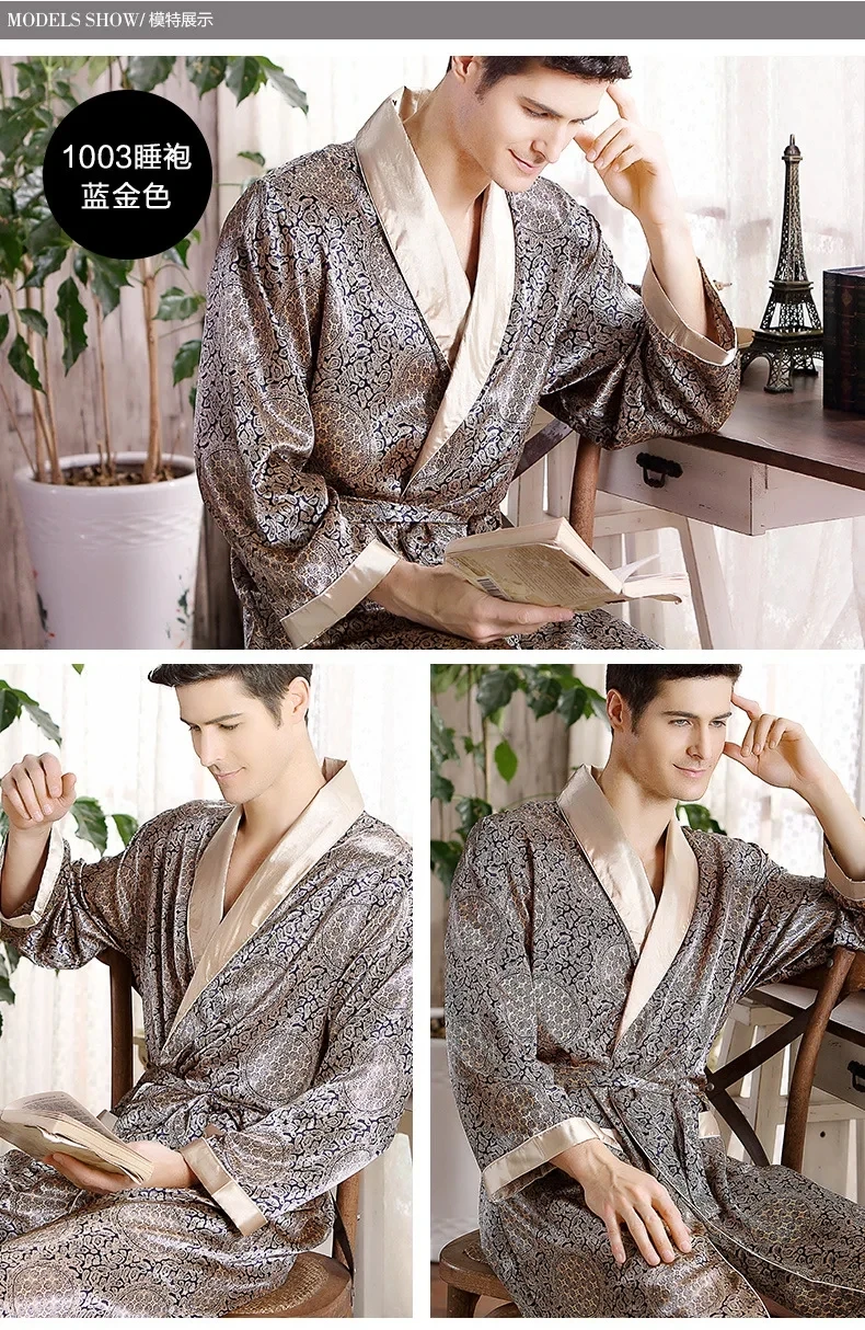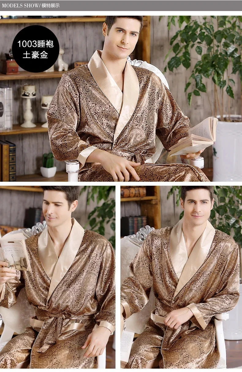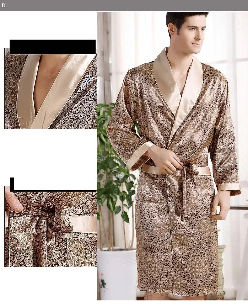 Men Bath Robe Satin Print Gold Kimono Bathrobe Silk Long Dressing Gown Plus Size Sleepwear Geometric Lounge Nightgown XL 4XL 5XL