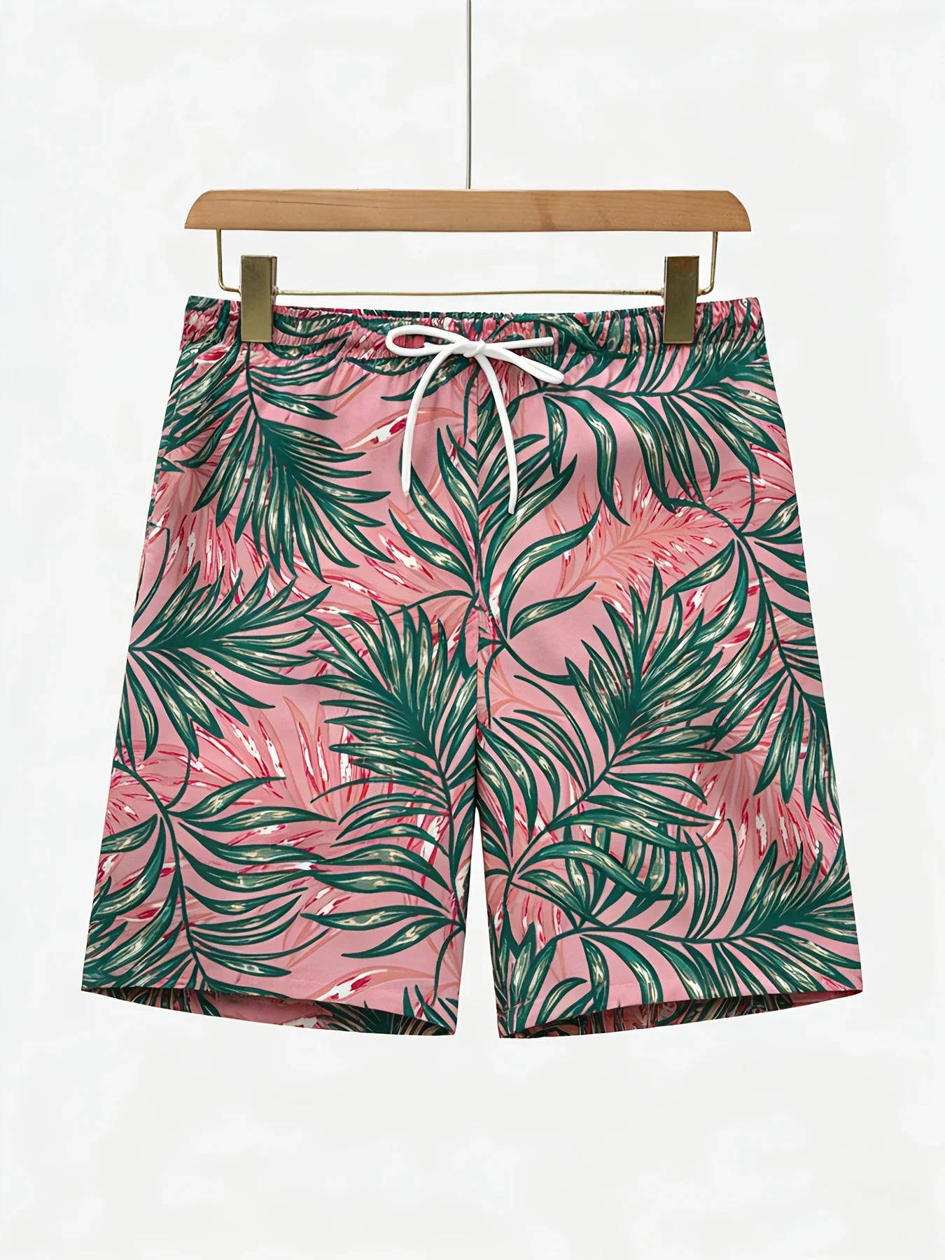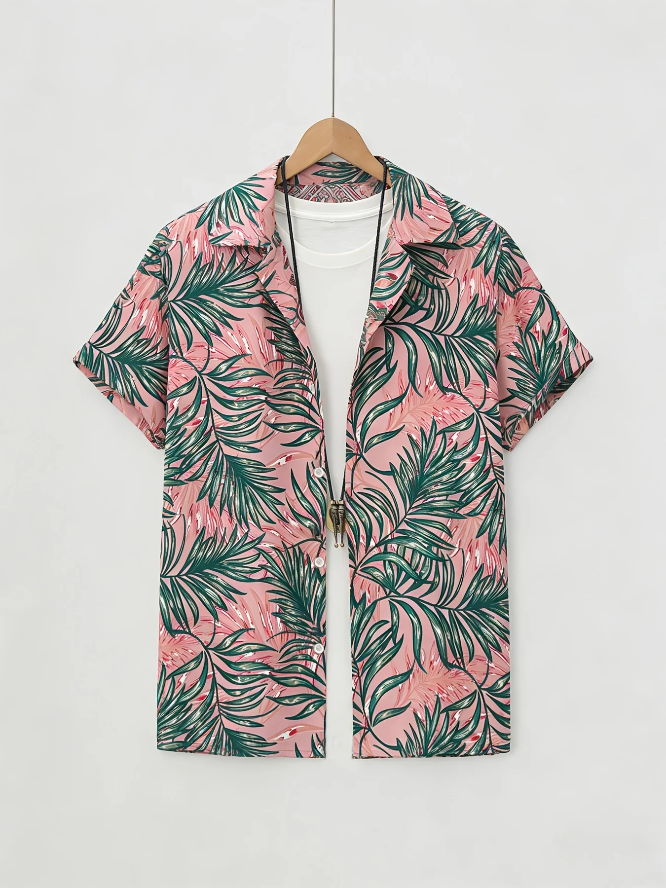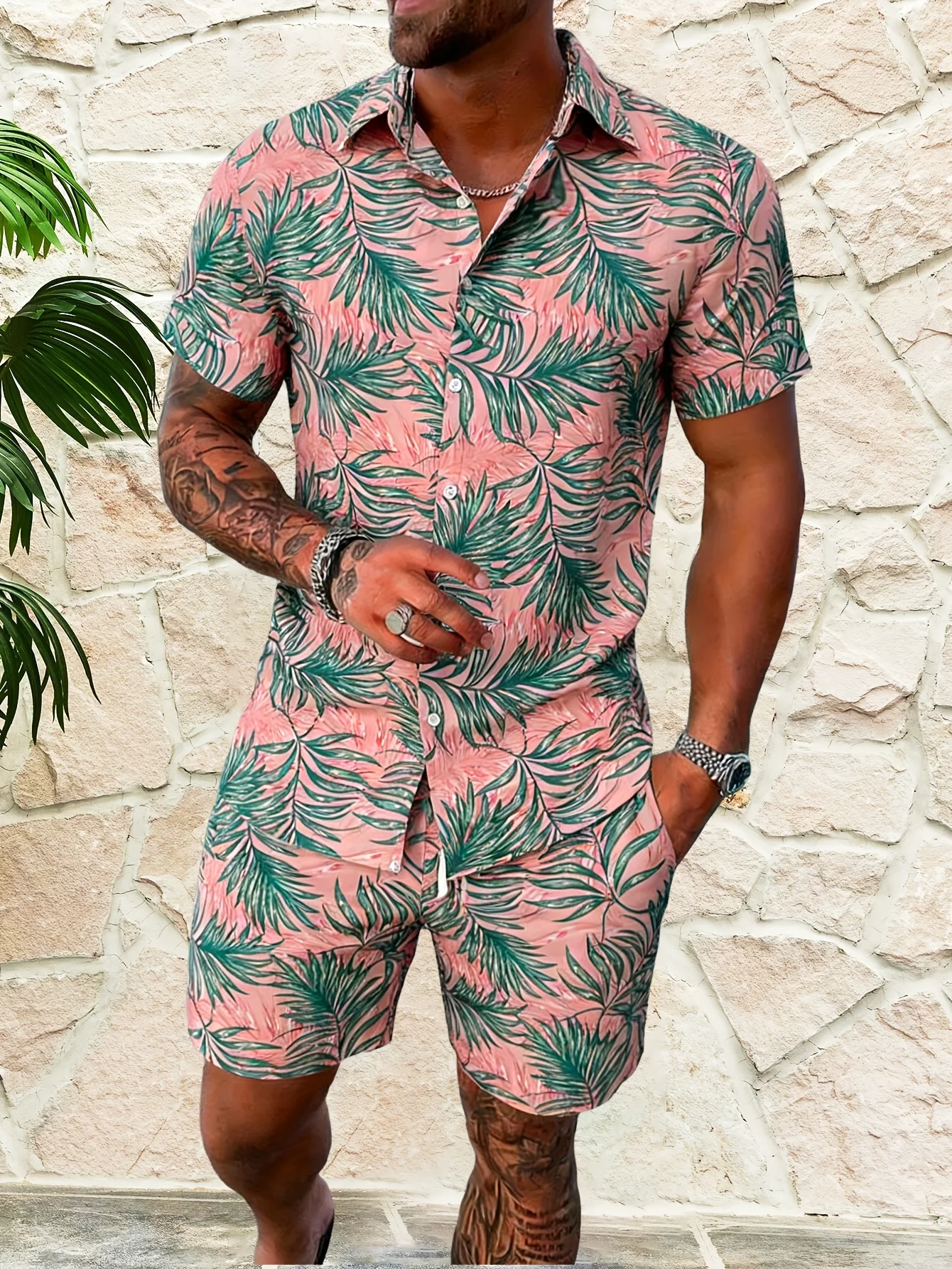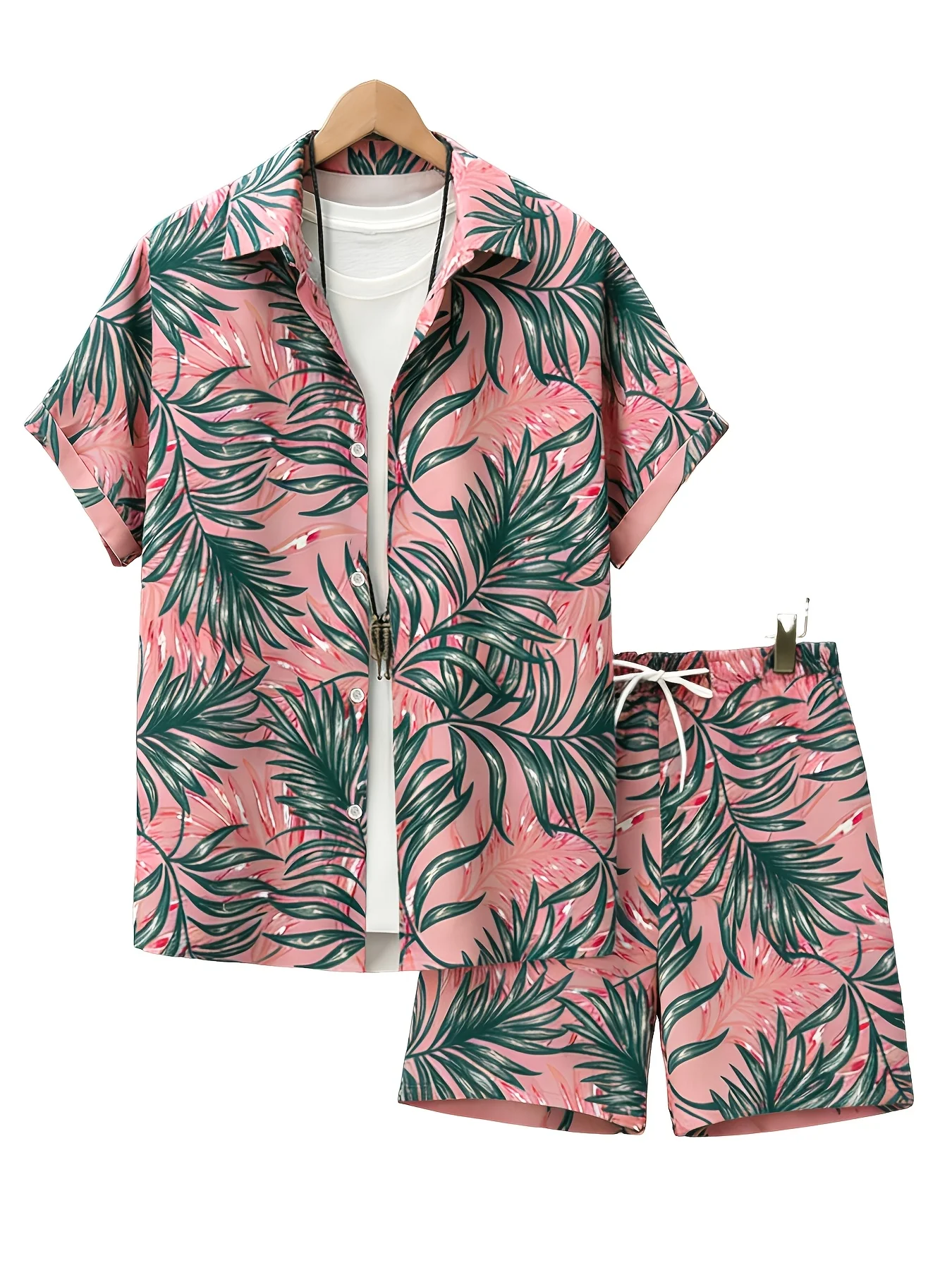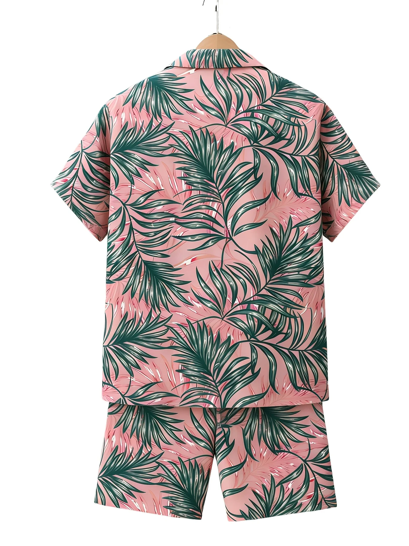 Men Casual Leaves Print Pajamas Short Sleeve Button Down Shirt & Drawstring Waist Shorts with Pockets Comfortable Home Sleepwear