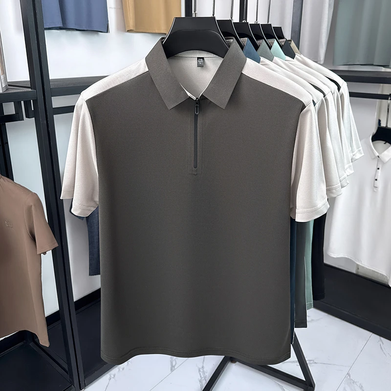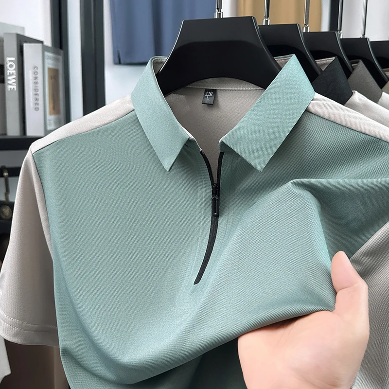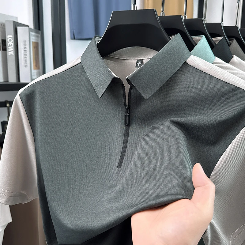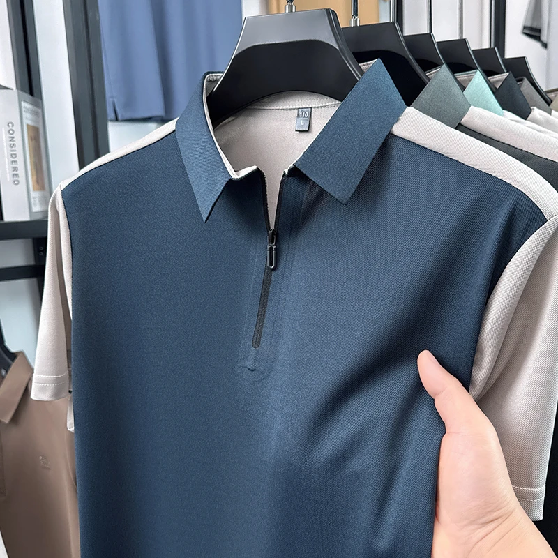 Mens Casual Short Sleeve Zip Up Polo Shirt Ice Silk Lightweight Breathable Color Block Summer Top