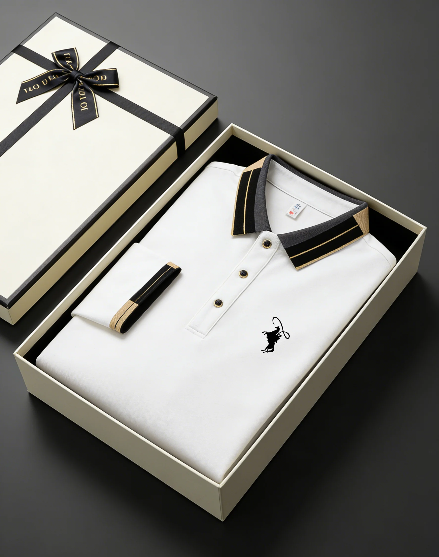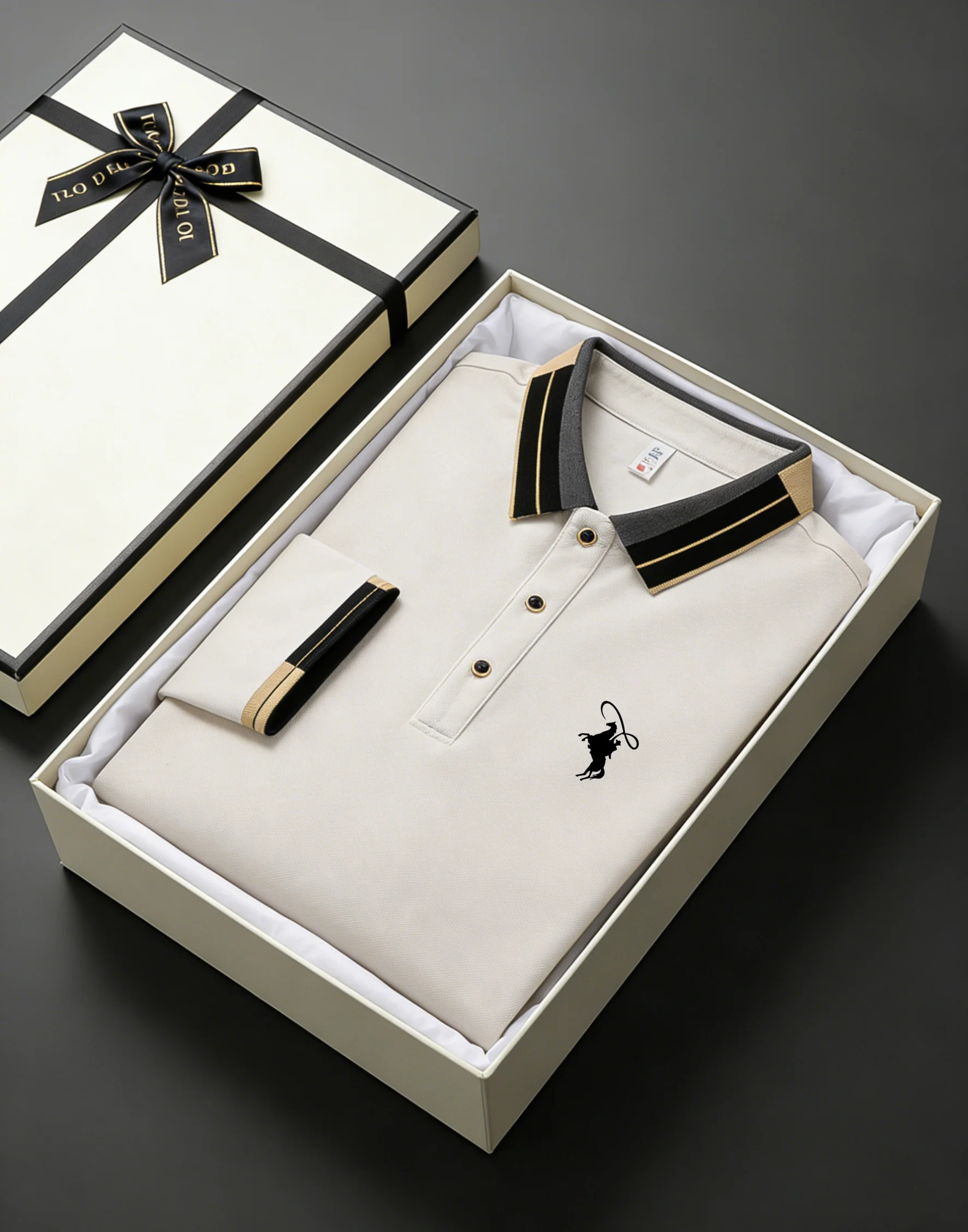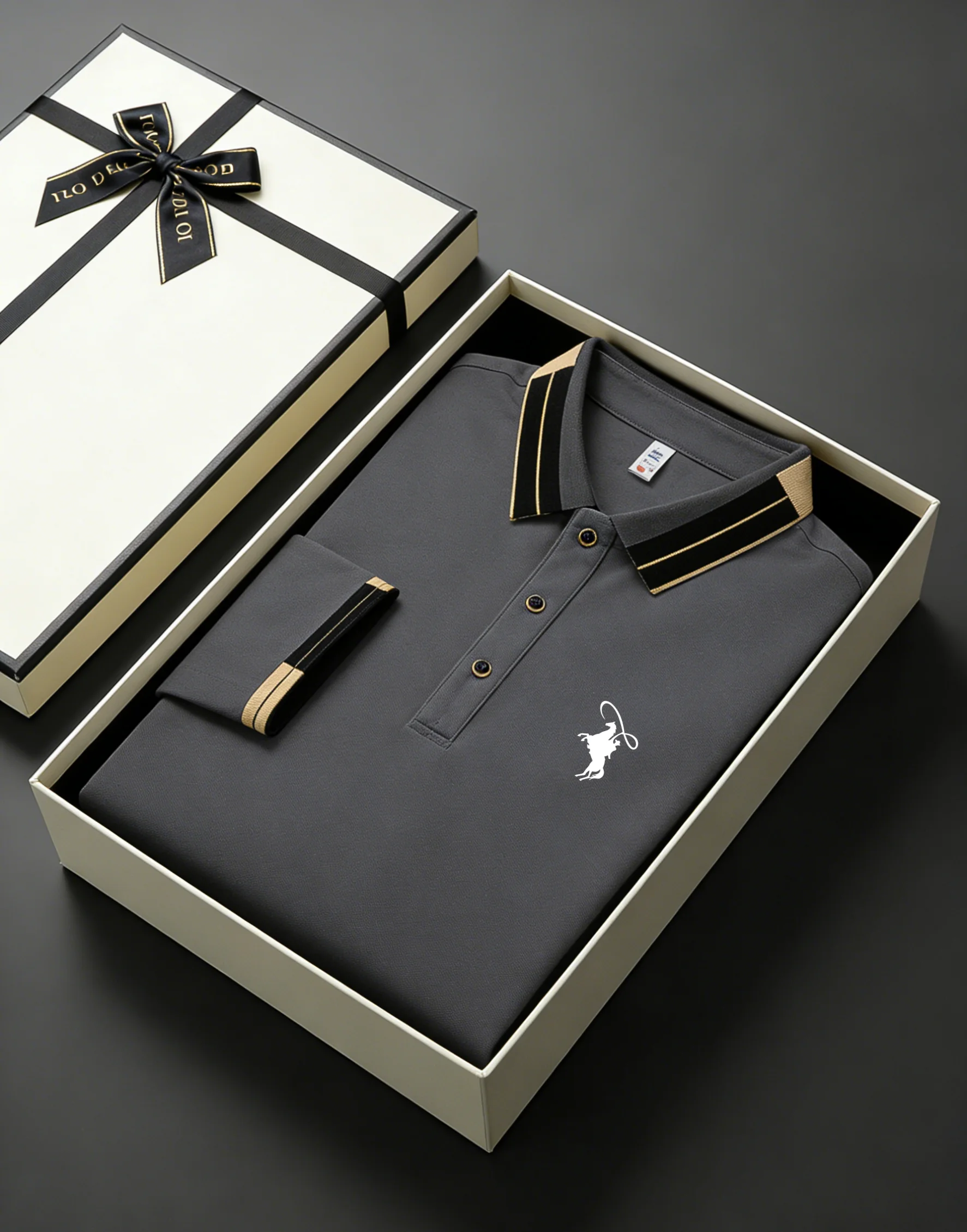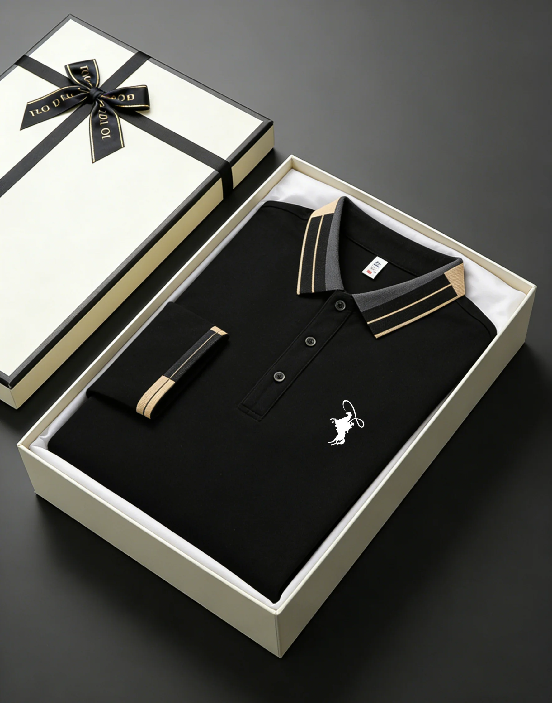 Men’s Equestrian Horse Emblem Contrast Collar Long Sleeve Polo Shirt – Business Casual Golf Top with Gift Box