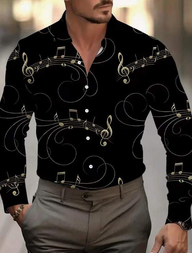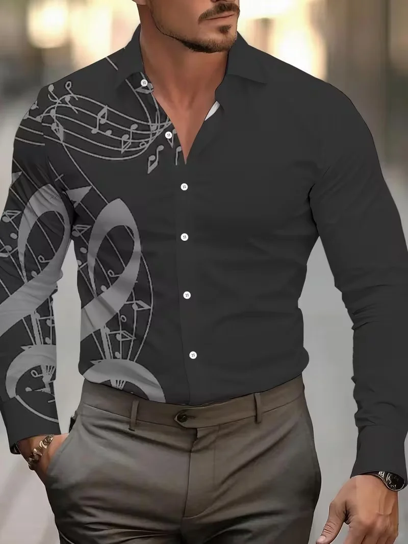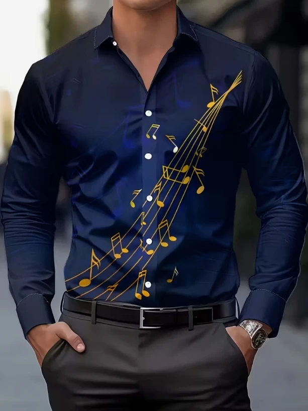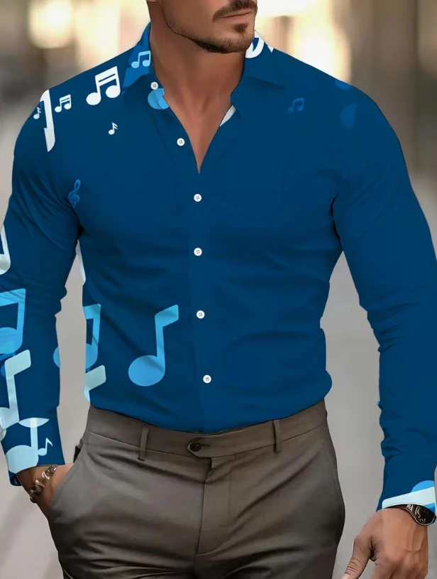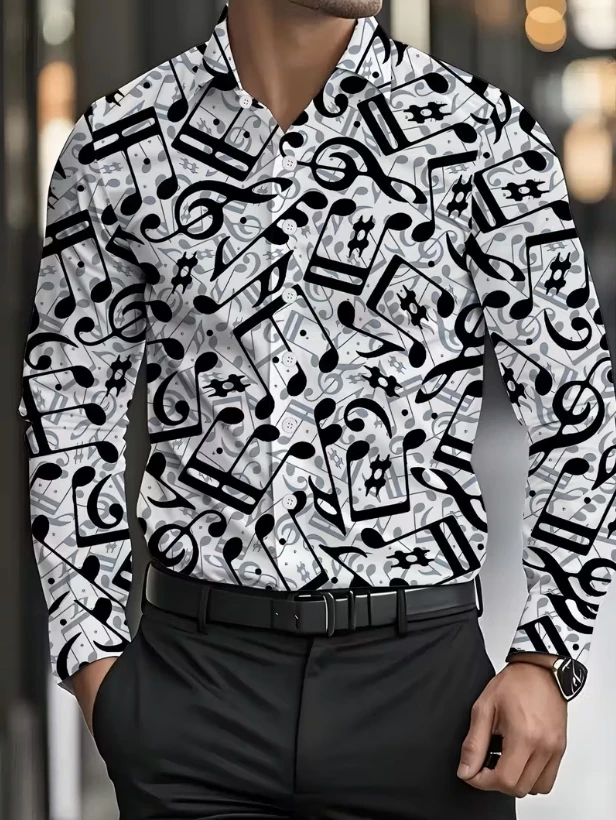 Men’s Long-Sleeve Shirt with Musical Notes and Treble Clef Print – Regular Fit Button-Up Casual Semi-Formal Shirt