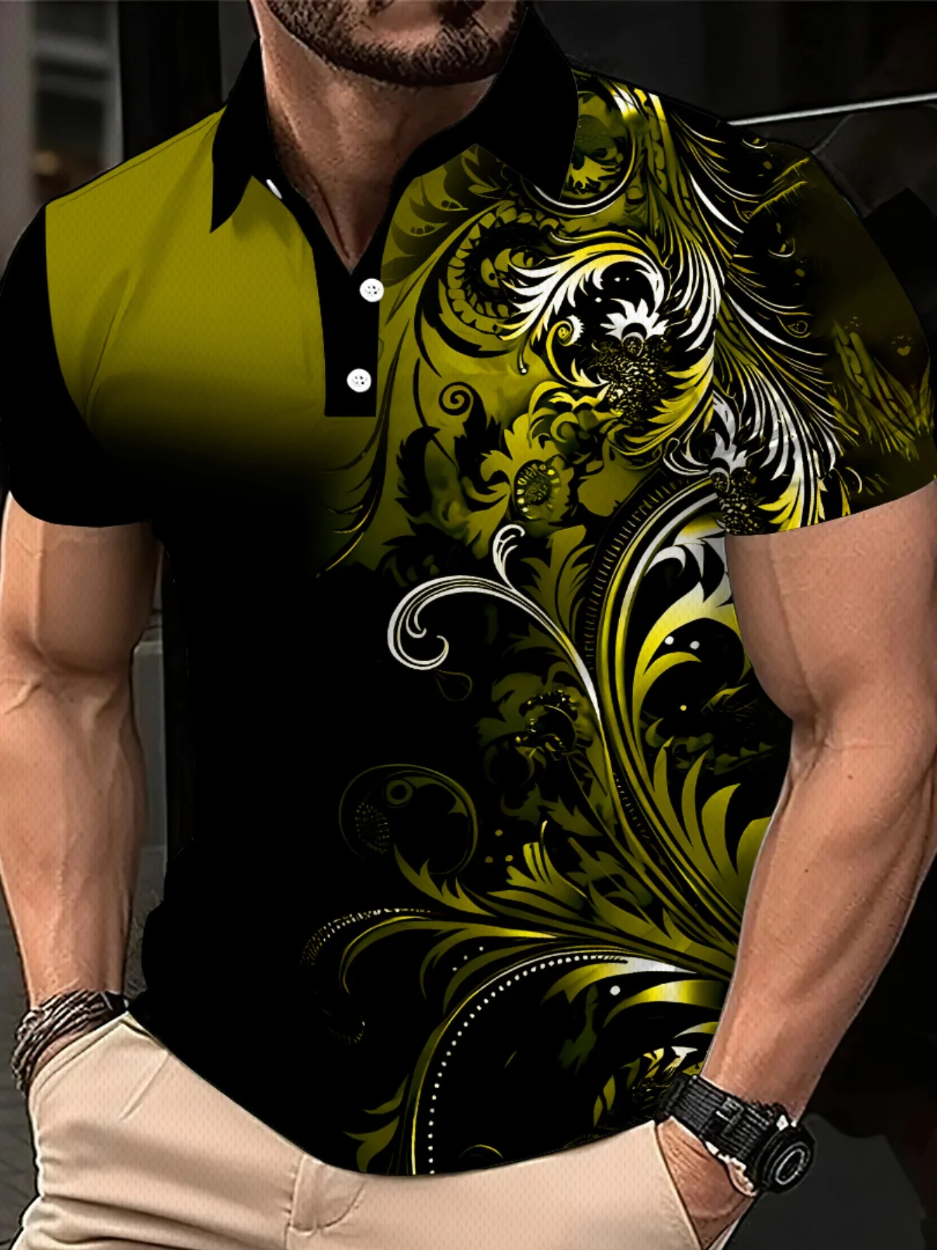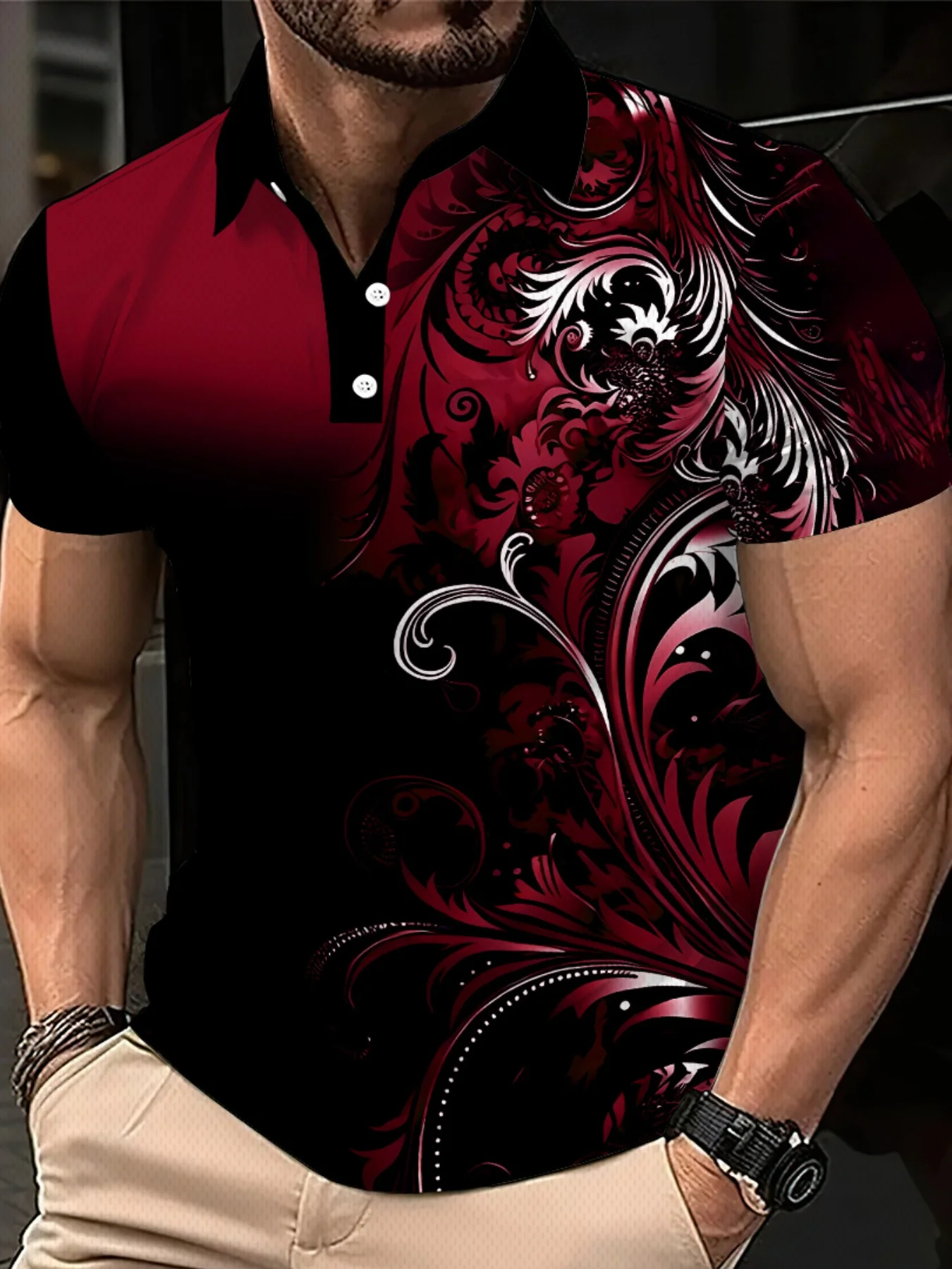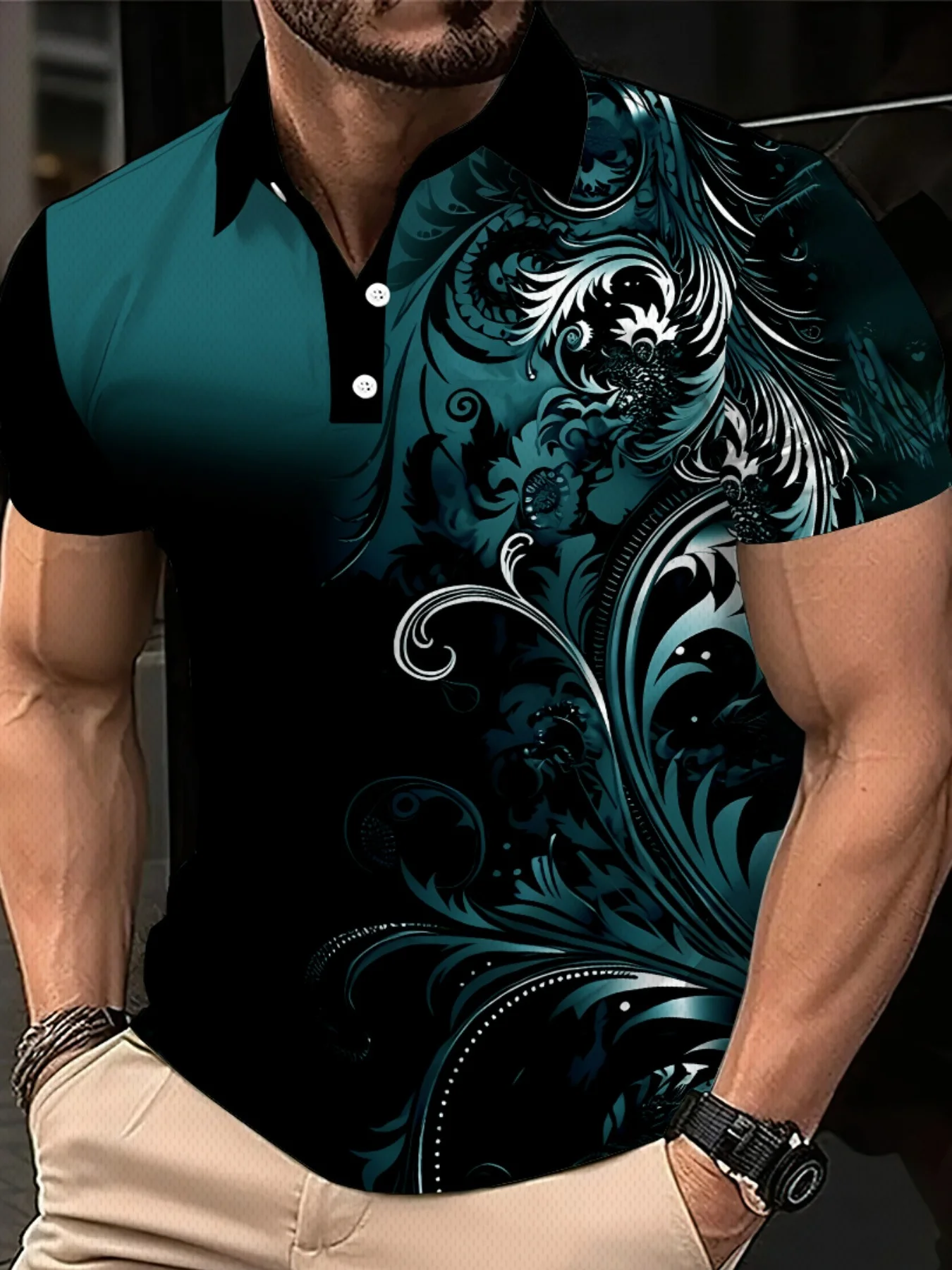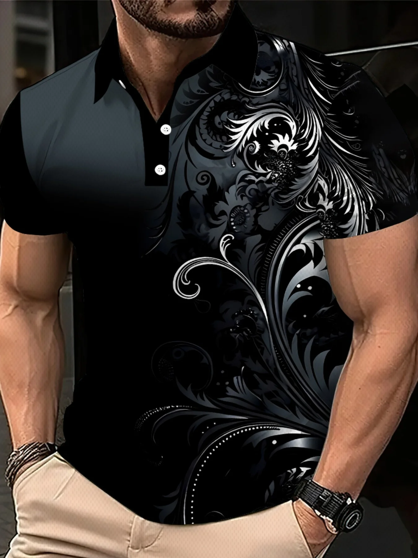 Men’s Polo Shirt – Summer Black Short-sleeved T-shirt with Asymmetrical Gradient Patchwork of European Retro Pattern Prints