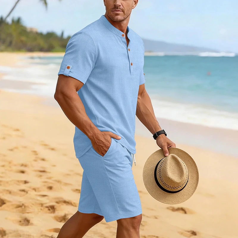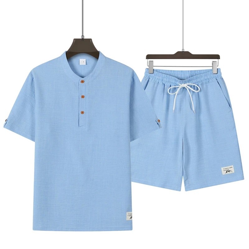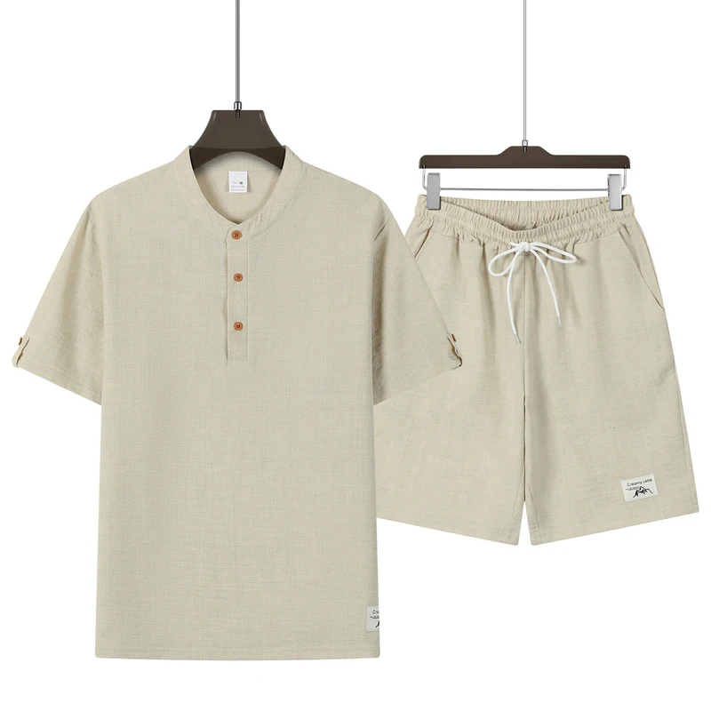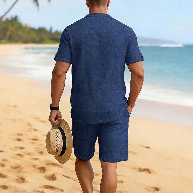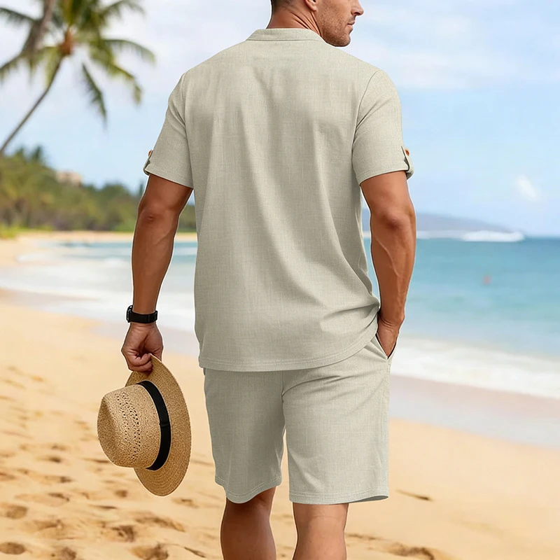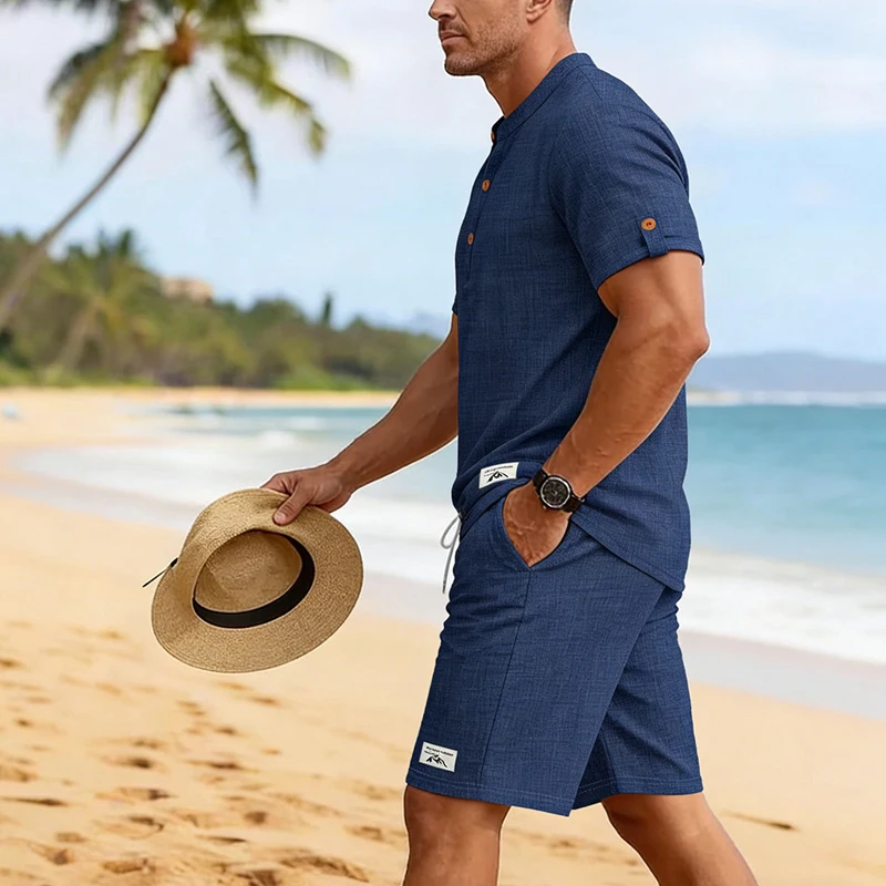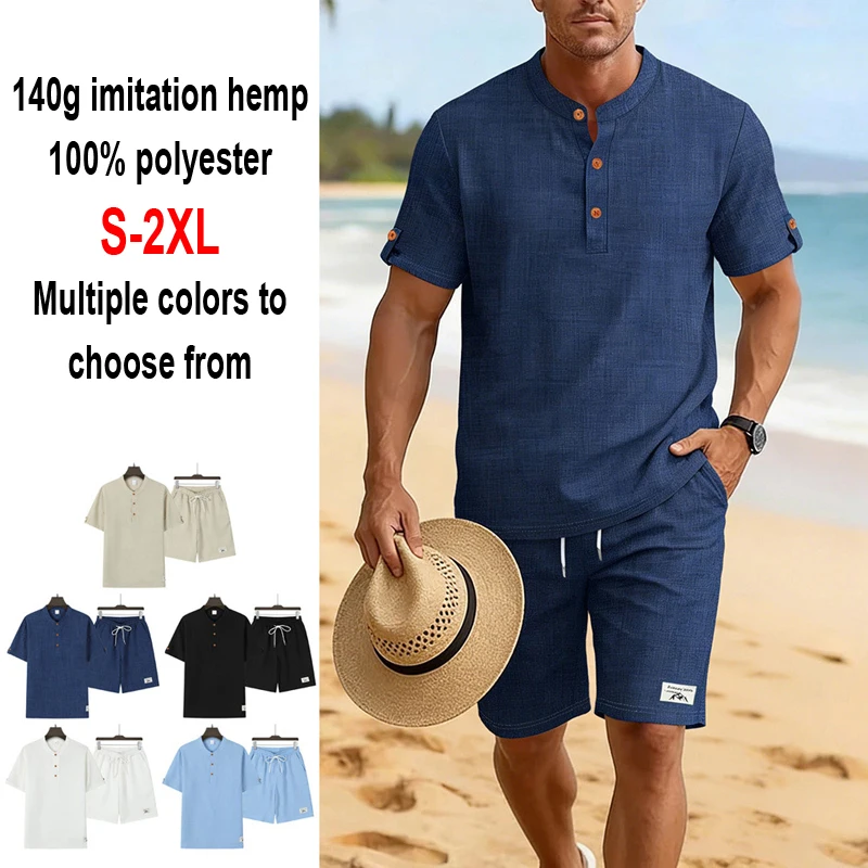 Men’s Polyester Linen Look Henley Shirt Shorts Set Stand Collar Button Up Casual Breathable Summer Beach 2 Piece Outfits for Men