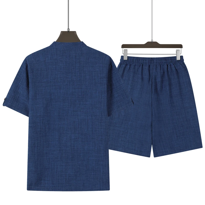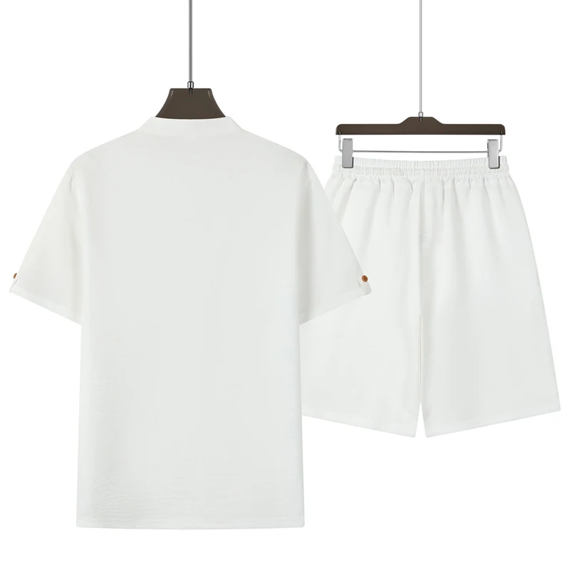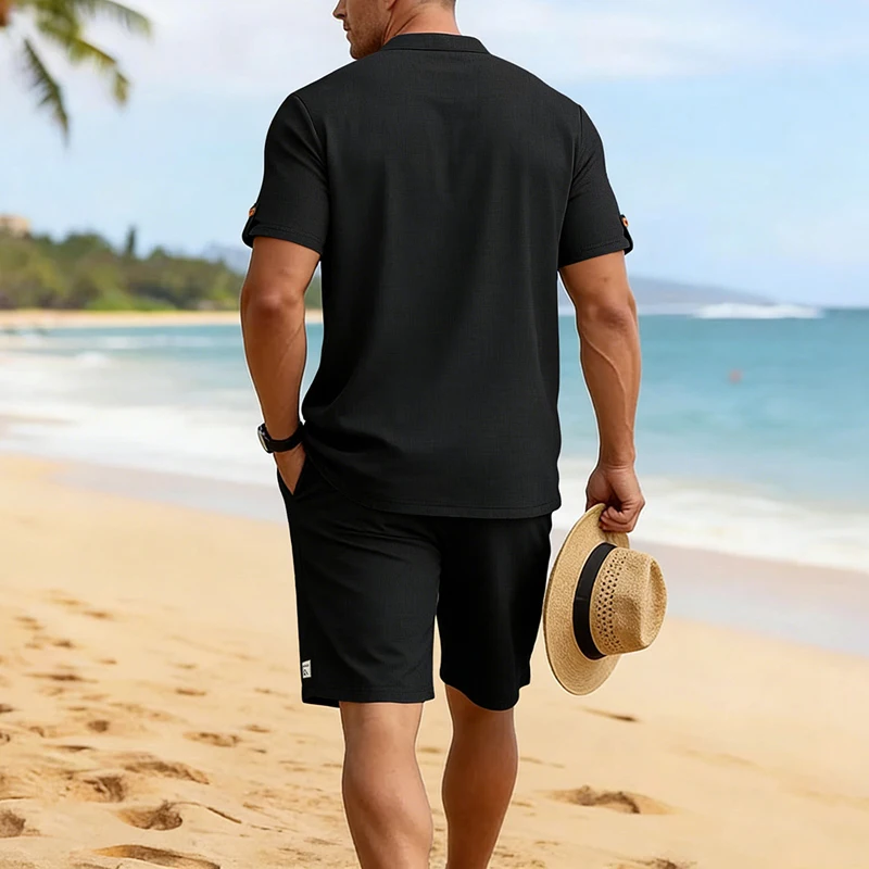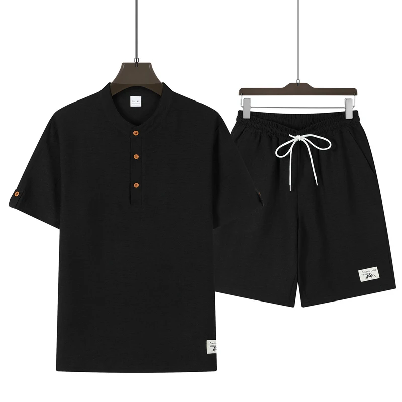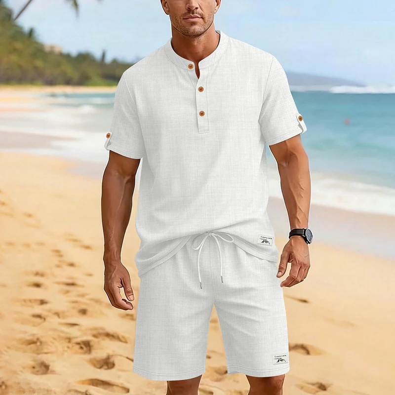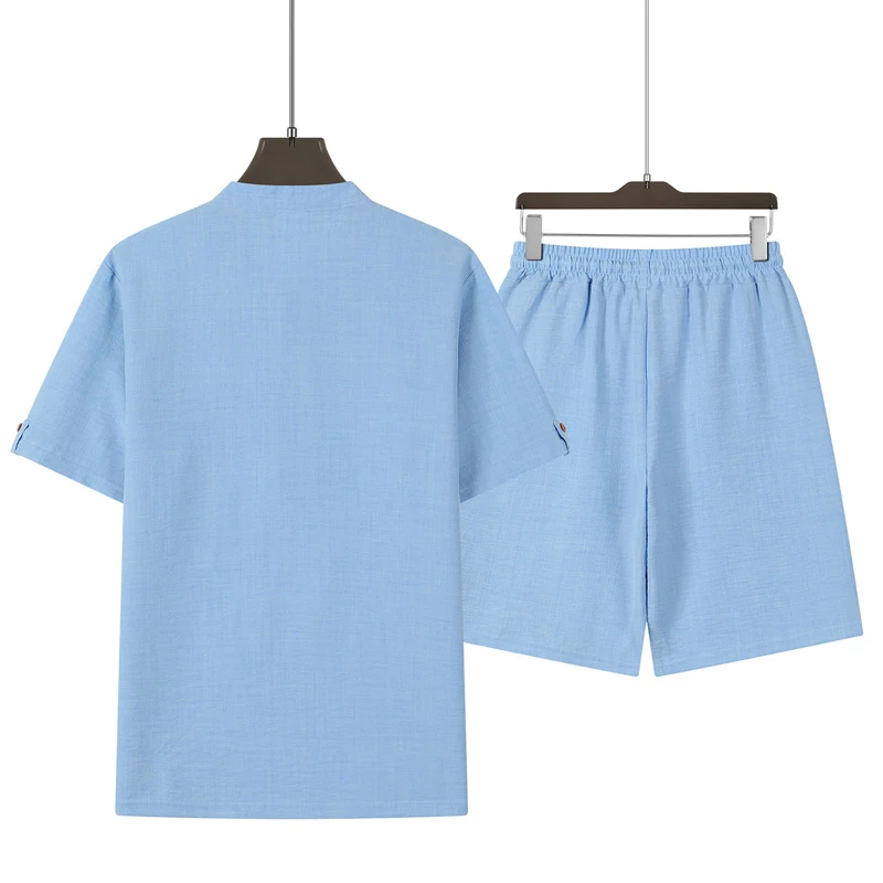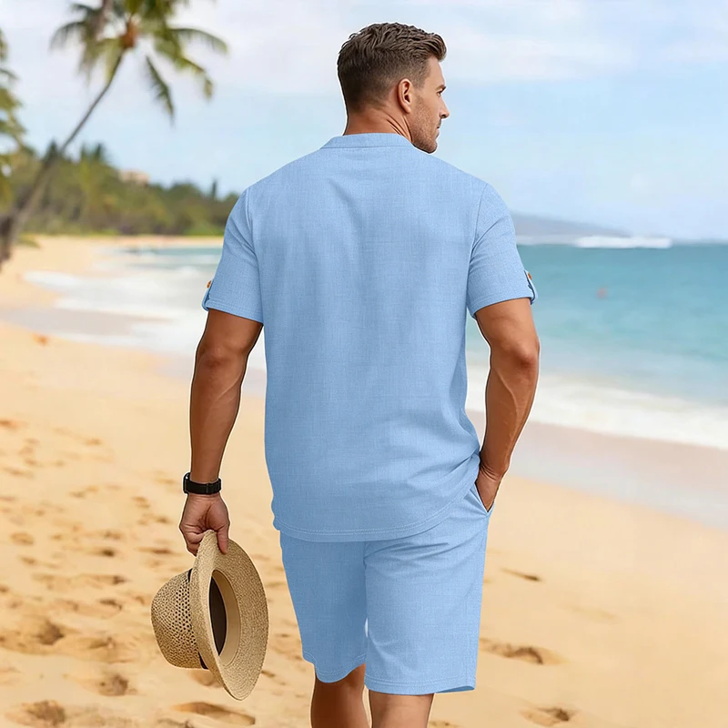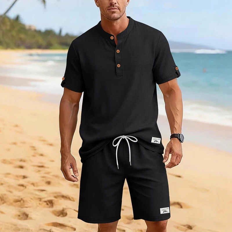 Men’s Polyester Linen Look Henley Shirt Shorts Set Stand Collar Button Up Casual Breathable Summer Beach 2 Piece Outfits for Men