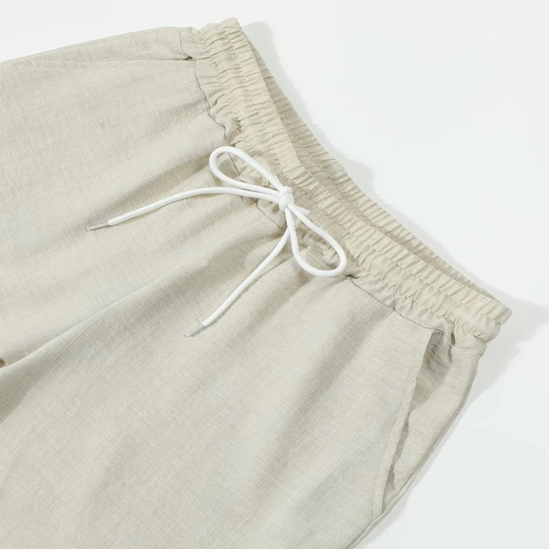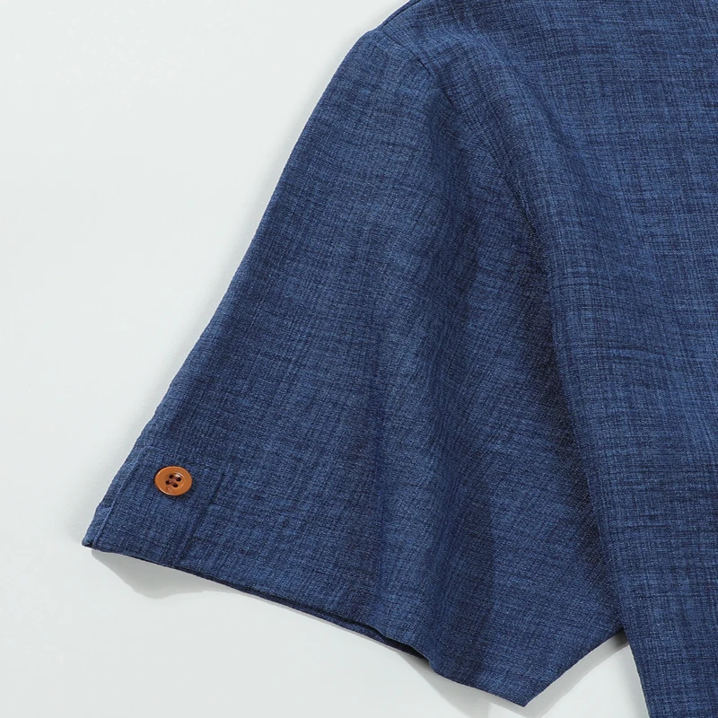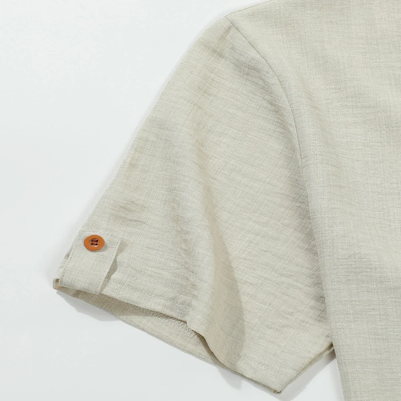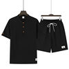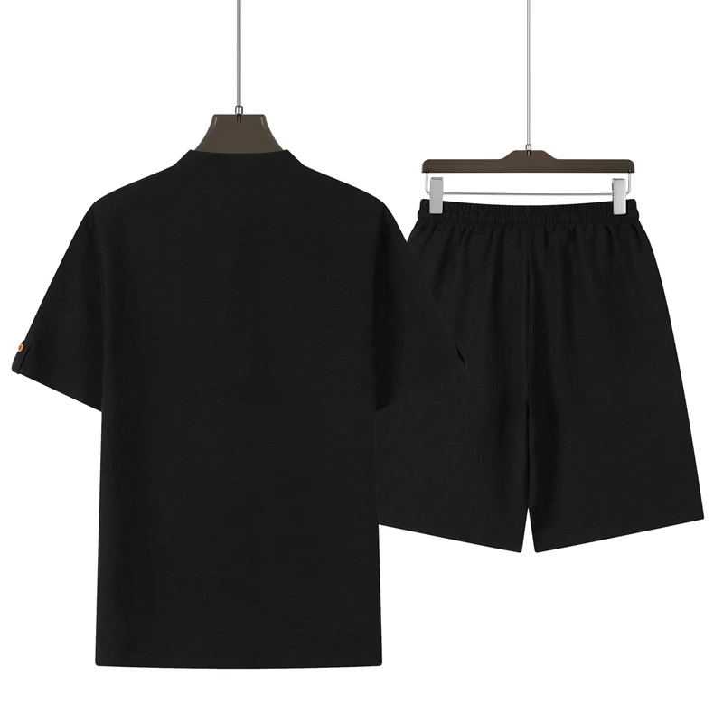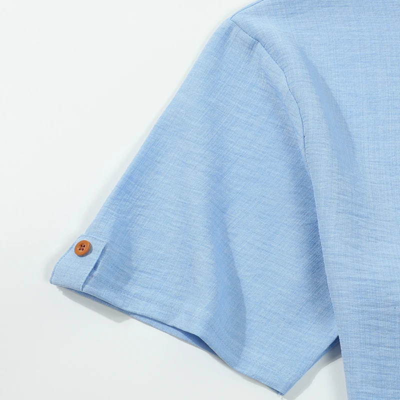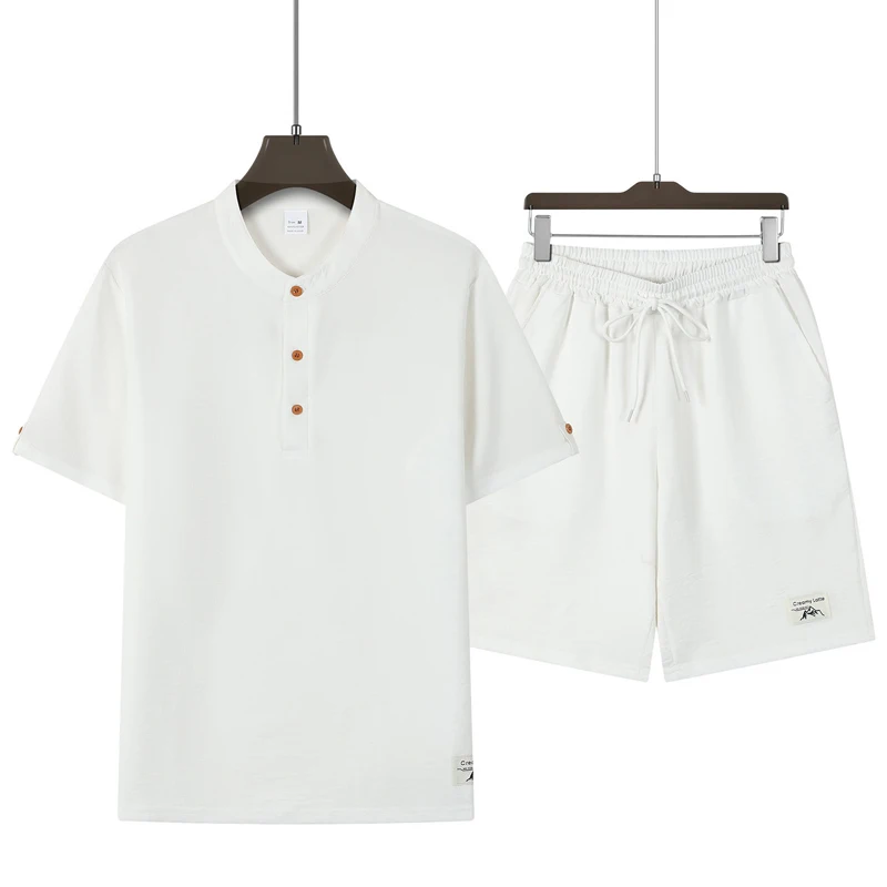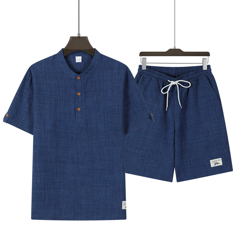 Men’s Polyester Linen Look Henley Shirt Shorts Set Stand Collar Button Up Casual Breathable Summer Beach 2 Piece Outfits for Men