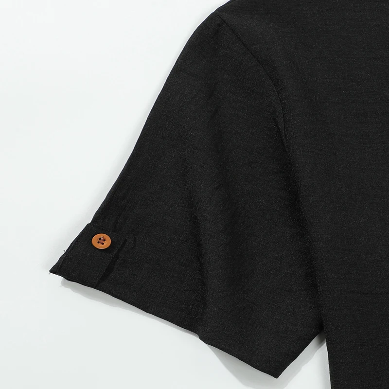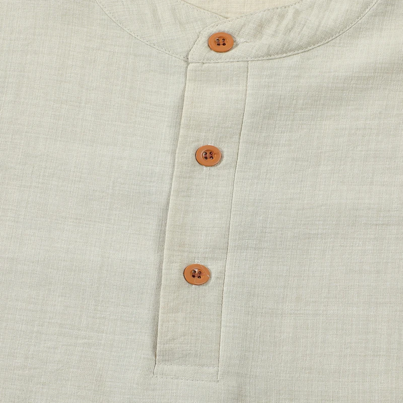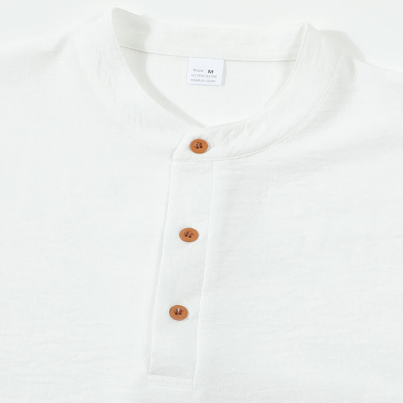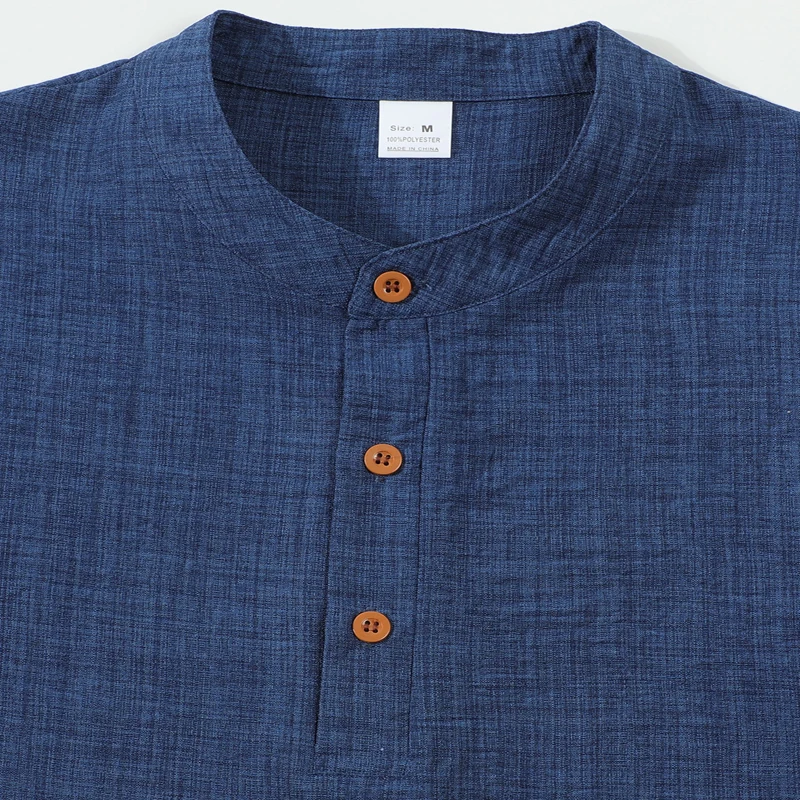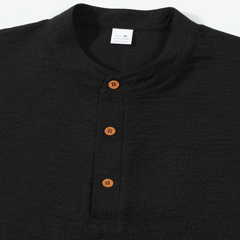 Henry collar, button placket, neat stitching, durable for daily wear and sports activities.
