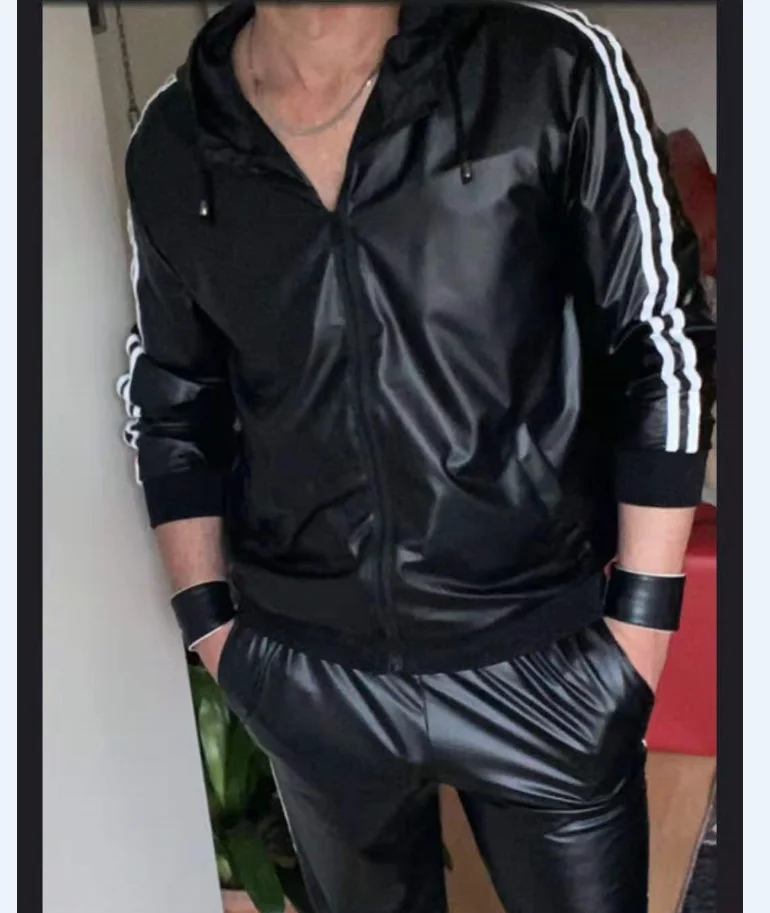 Men’s PU Leather Hoodie Suit Casual Sportswear Hooded Jogging Suit Sportswear Men Outfit Set Juicy Tracksuit